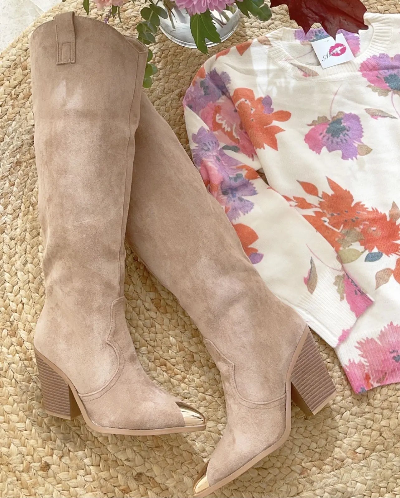 Camel suede thigh-high boots with a gold toe and comfortable cowboy heel