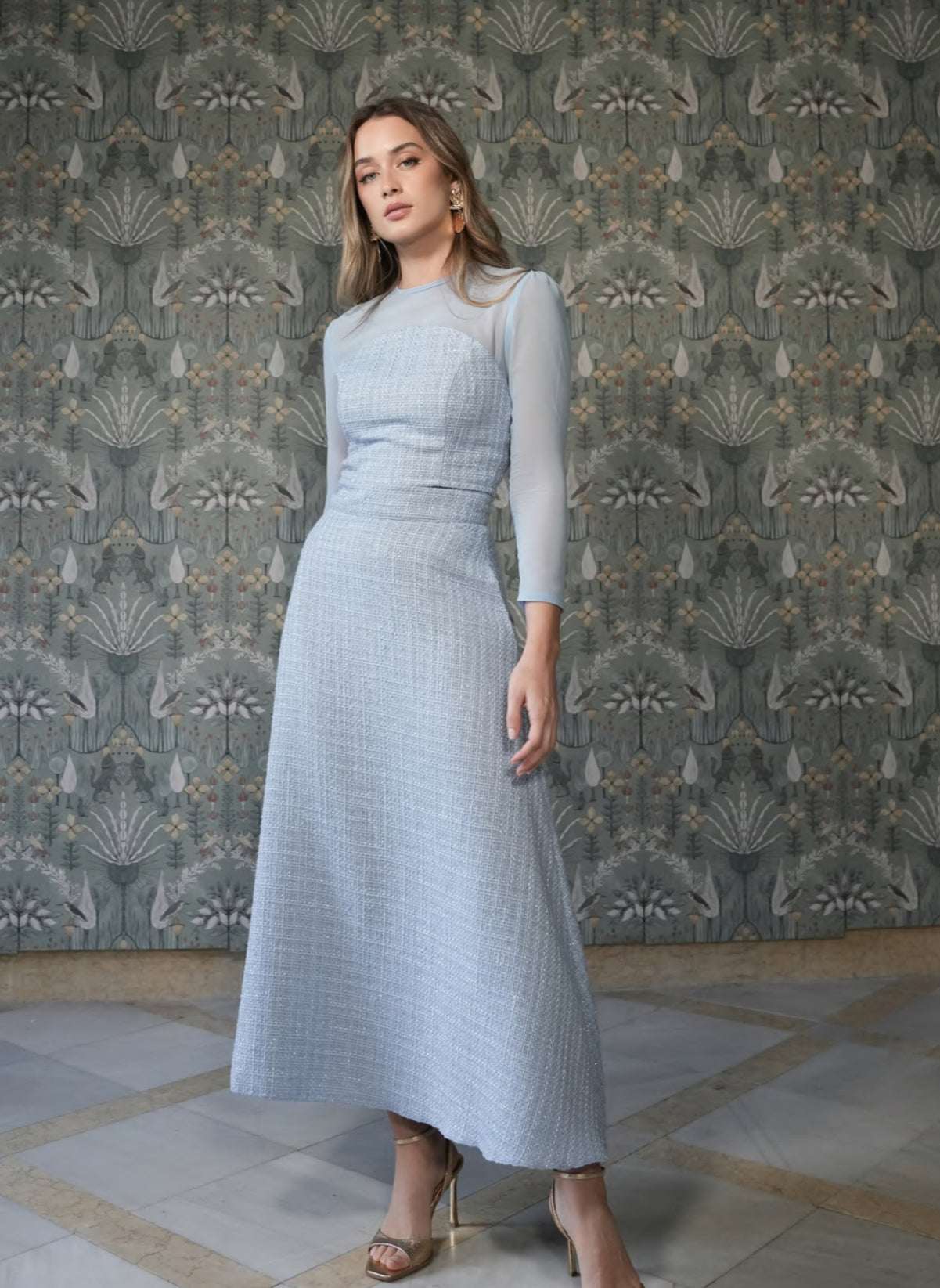 Las mangas de tul añaden un toque etéreo, creando un contraste encantador con la textura del tweed. Disponible en tallas XS-34, S-36, M-38, L-40 y XL-42, este conjunto se adapta a diferentes siluetas, asegurando un ajuste perfecto y cómodo.