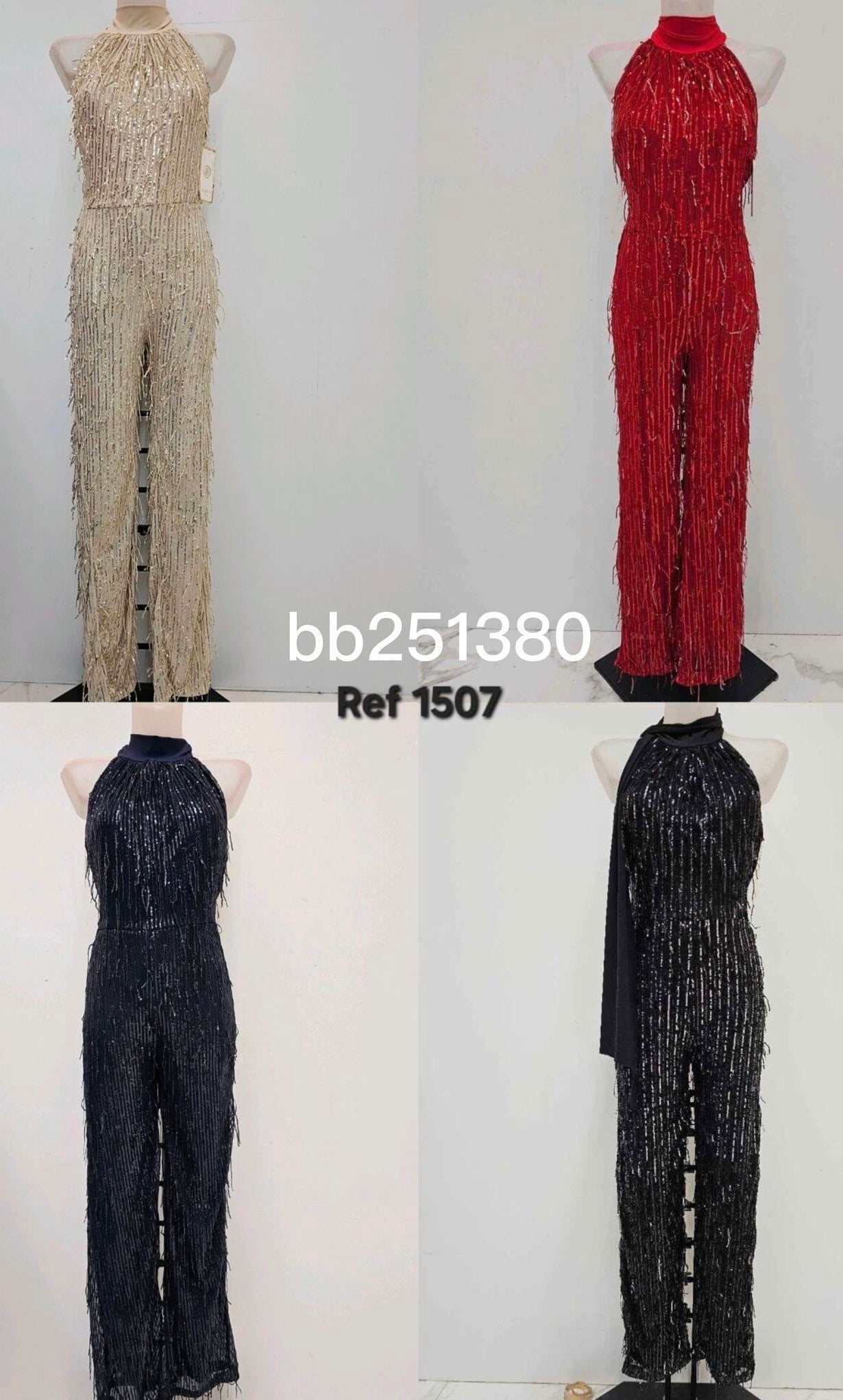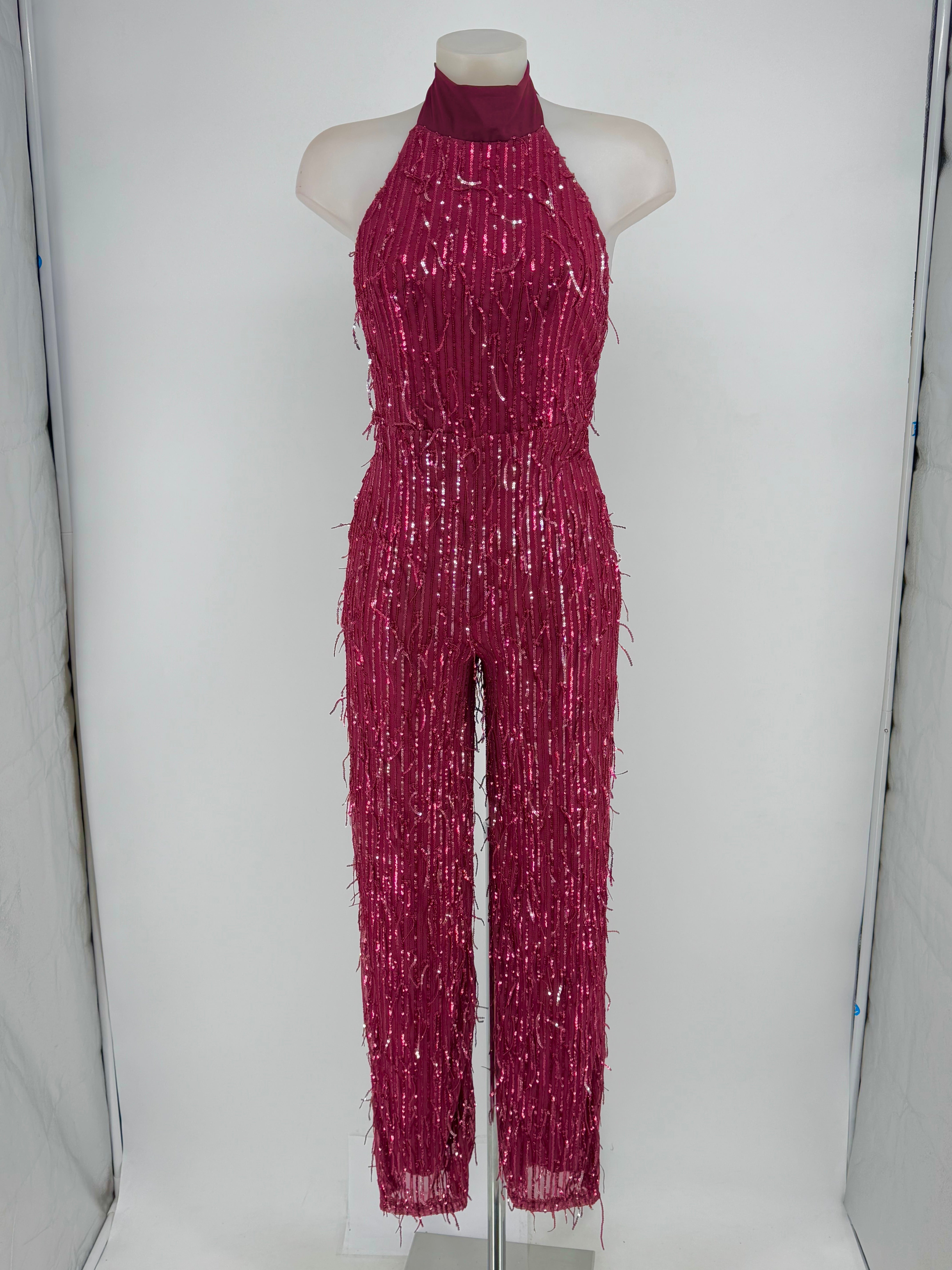 Mono de tul con flecos de pailettes y espalda al aire con lazada al cuello