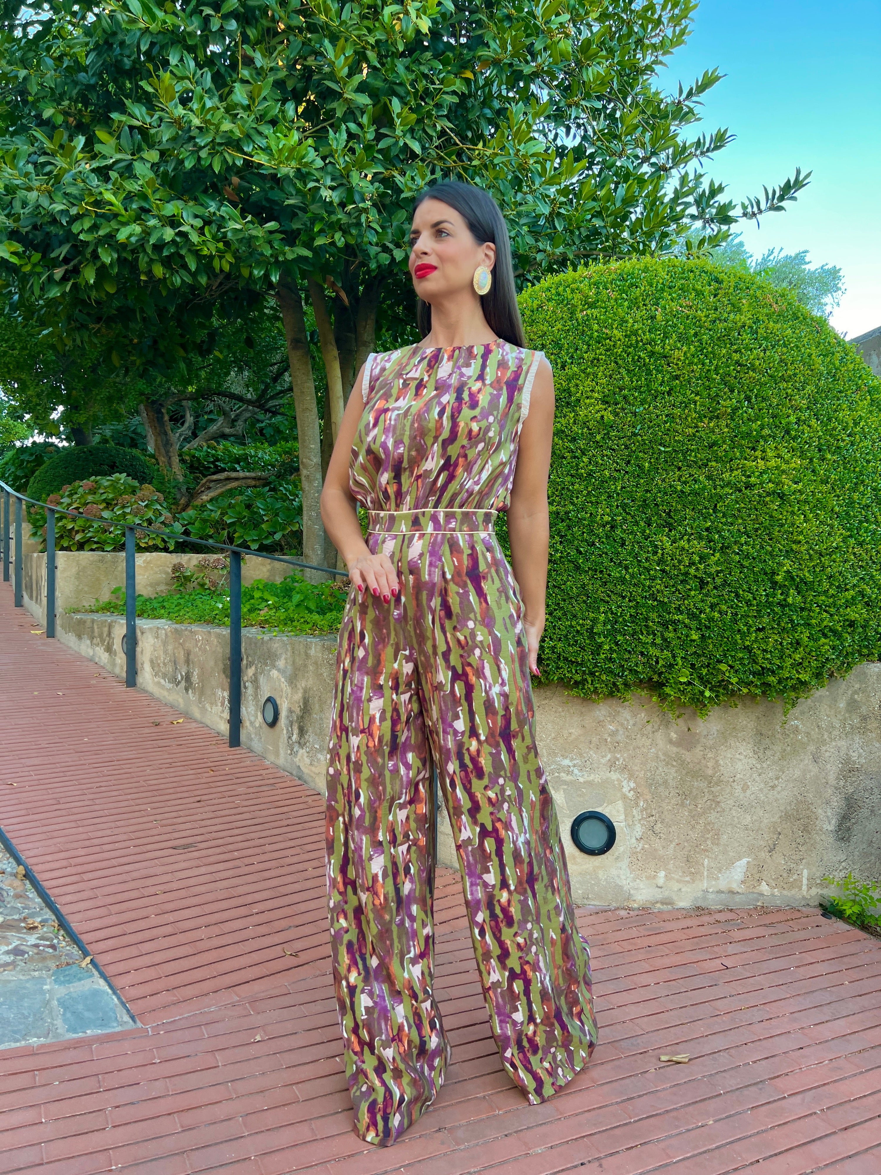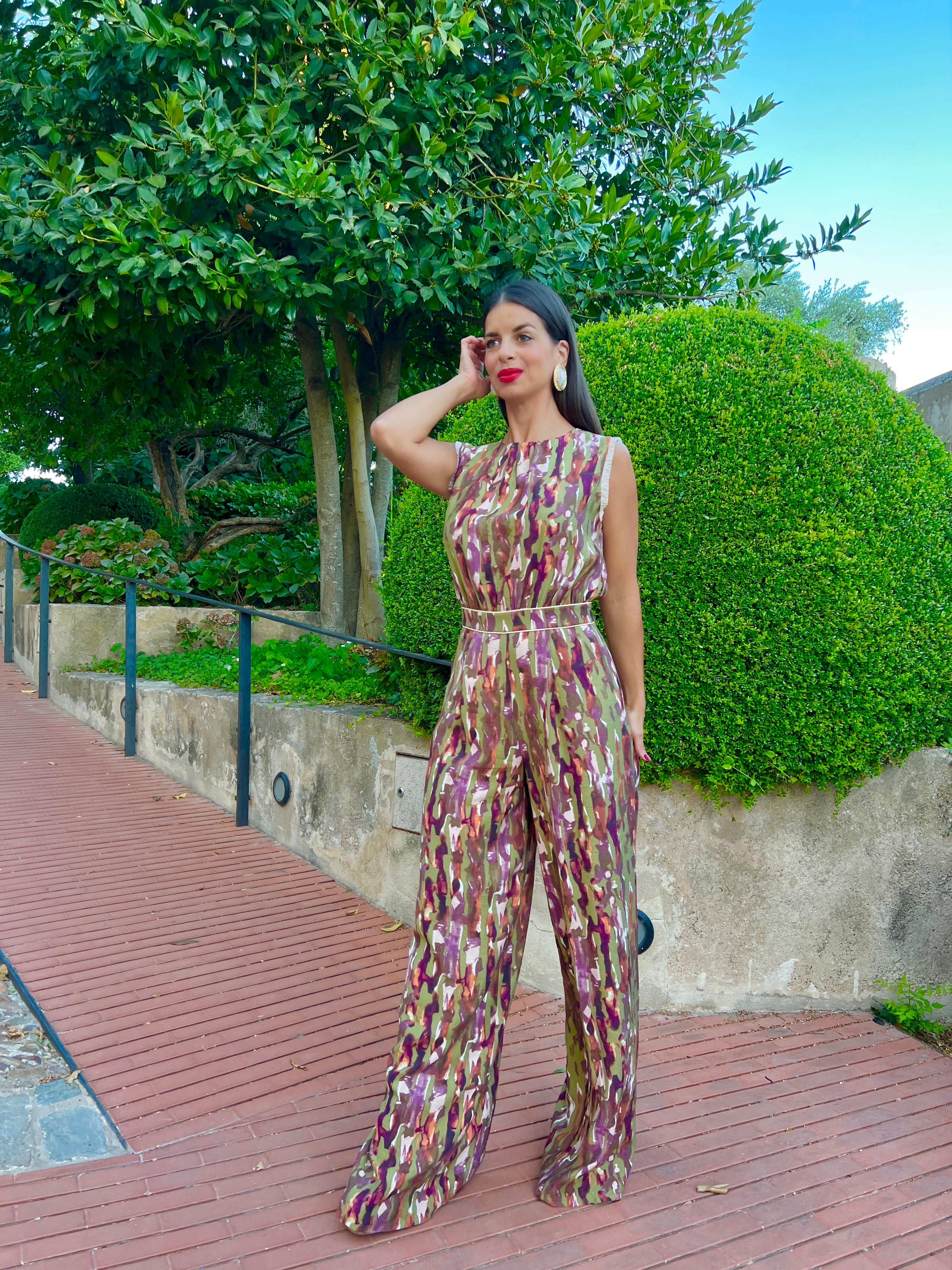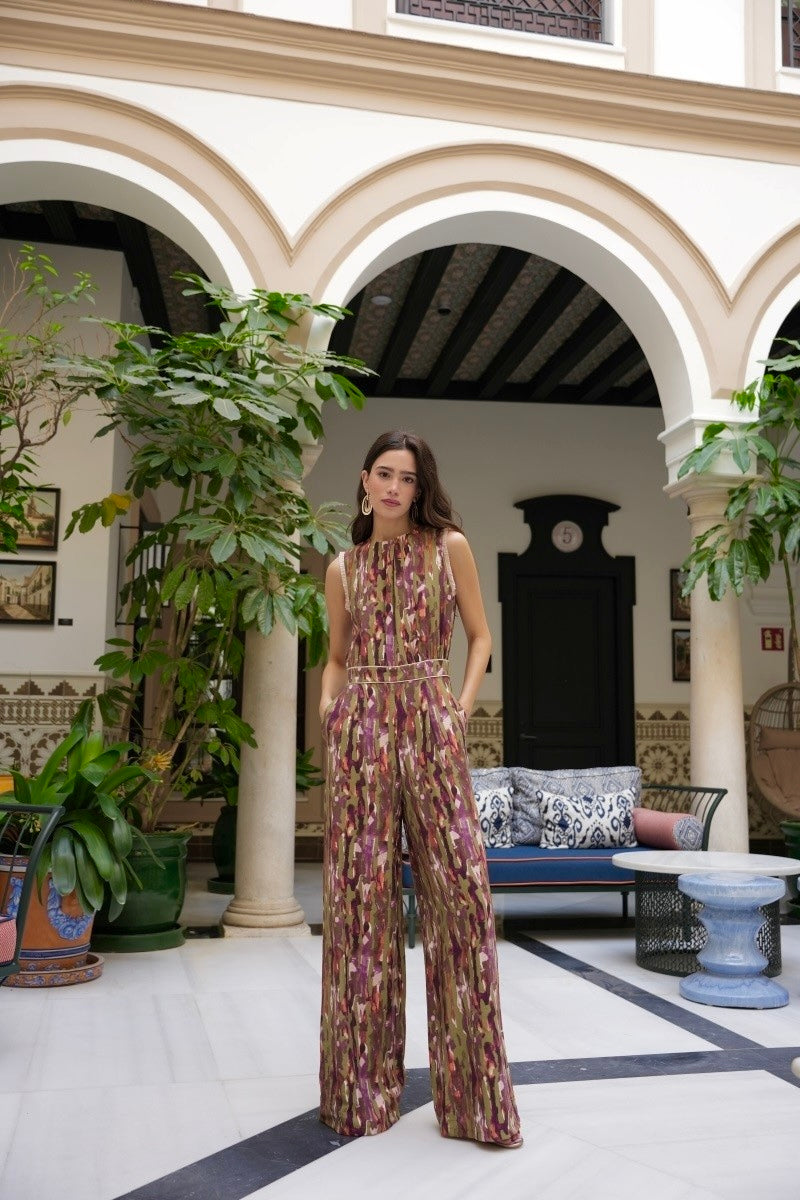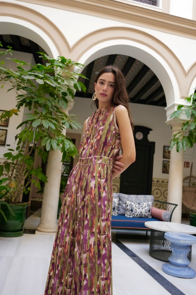 Mono confeccionado en tejido de viscosa estampado con ribete desflecado y espalda a aire en lagrima.