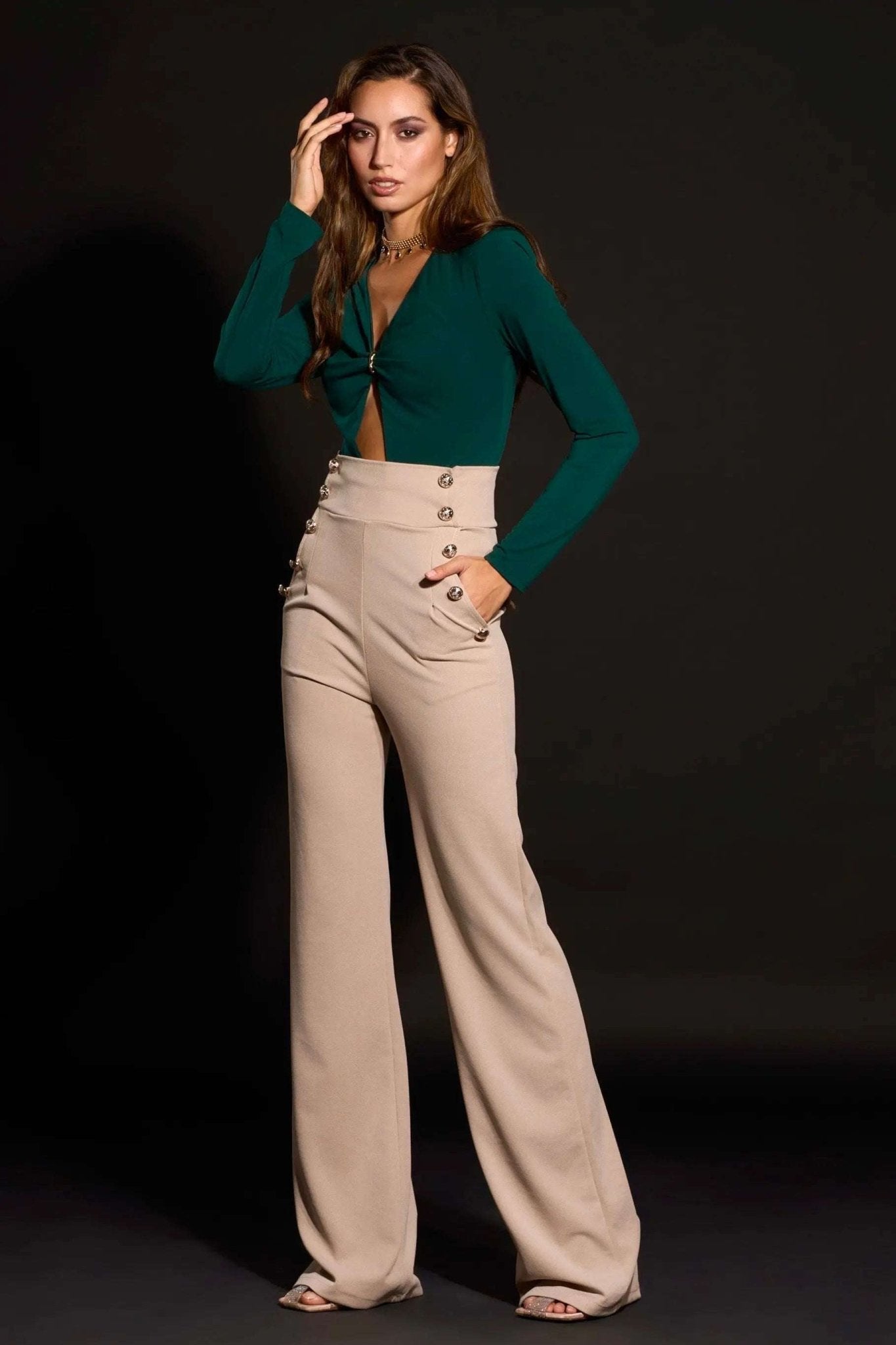 Su cinturilla de tiro alto y los detalles de botones militares aportan un toque distintivo y moderno. Además, cuenta con una práctica cremallera trasera y bolsillos laterales, ideales para un look funcional sin sacrificar el estilo.