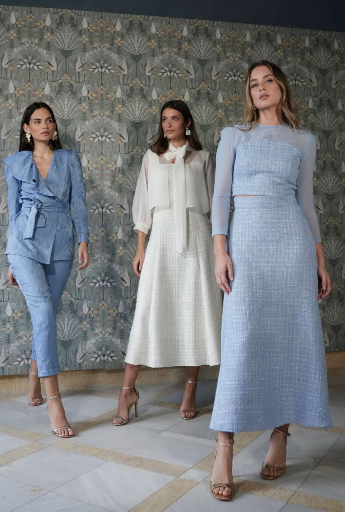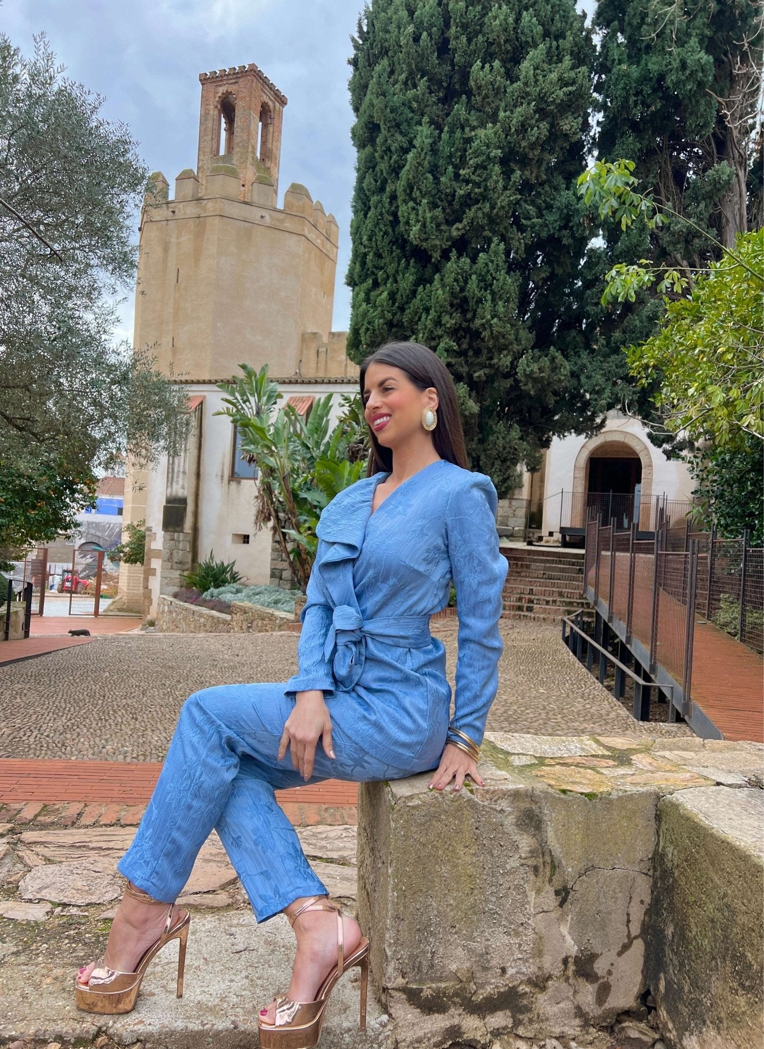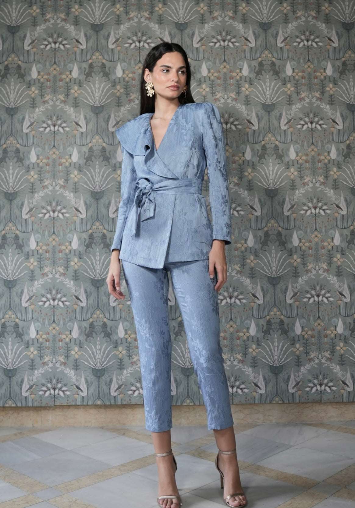 El Traje Gaga Jacquard Celeste es un conjunto elegante y sofisticado, ideal para ocasiones especiales. Este traje está compuesto por una chaqueta cruzada que presenta un distintivo detalle de solapa volante, complementada con un cinturón que realza la figura.