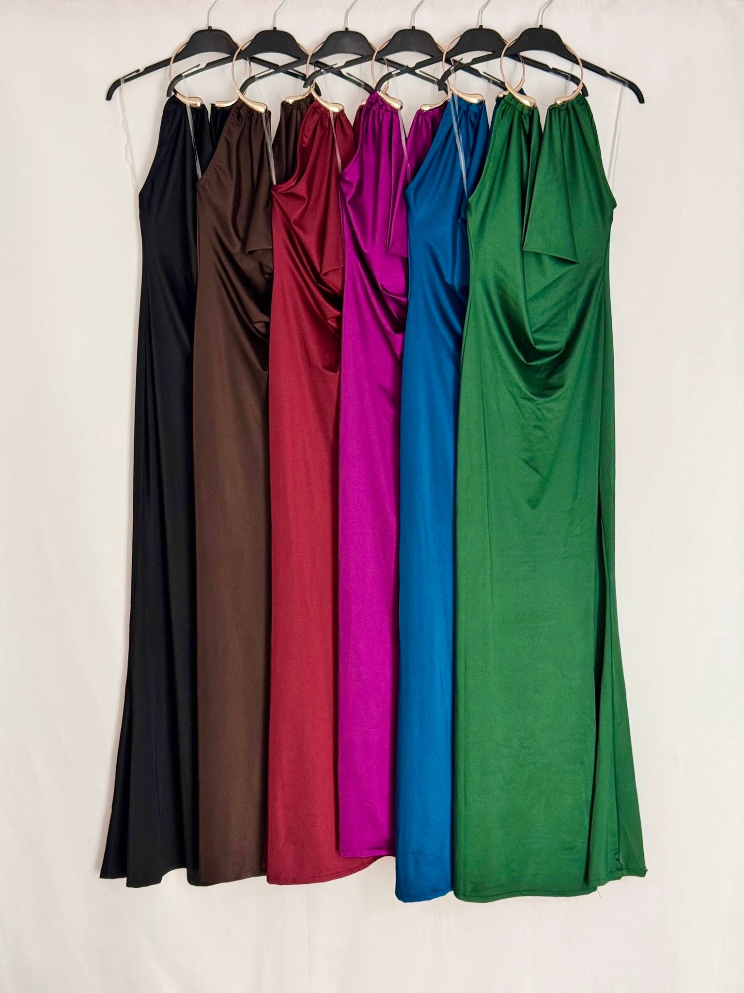 Vestido de elastham satinado con detalle de cuello halter marcado por collar dorado