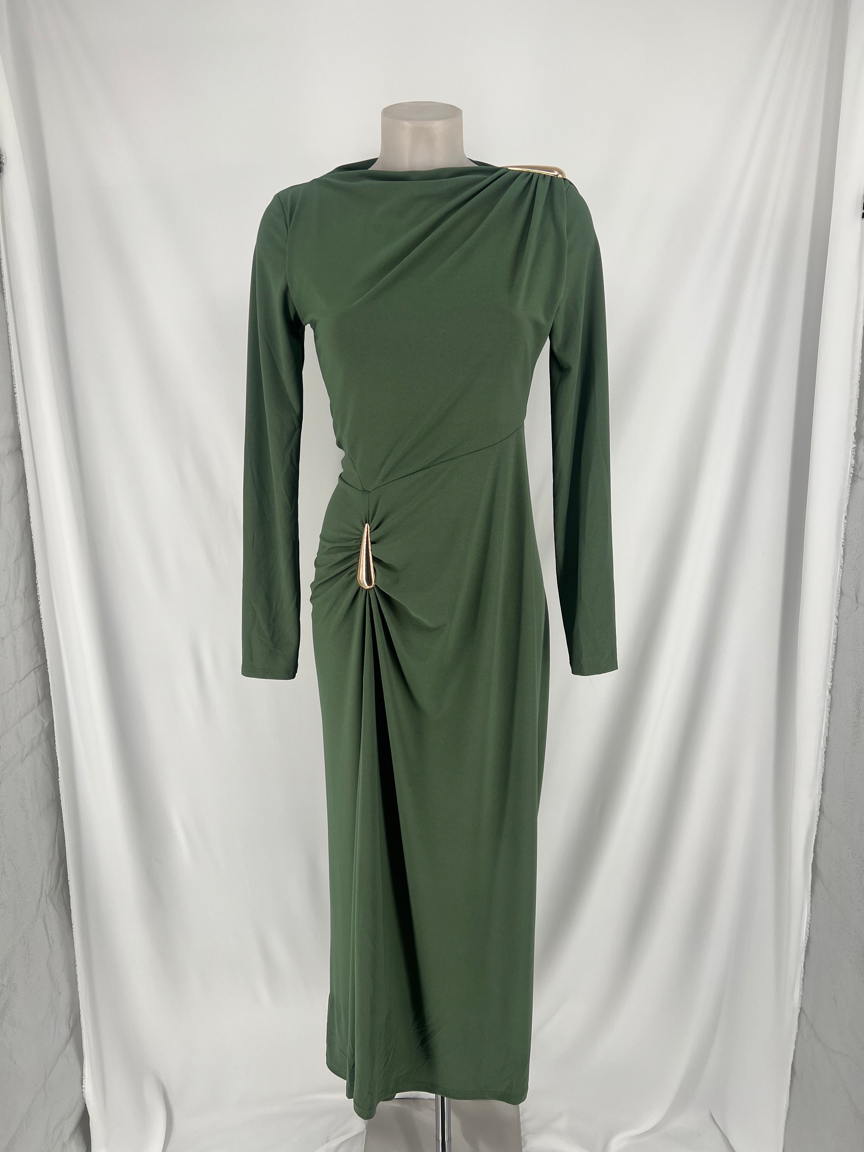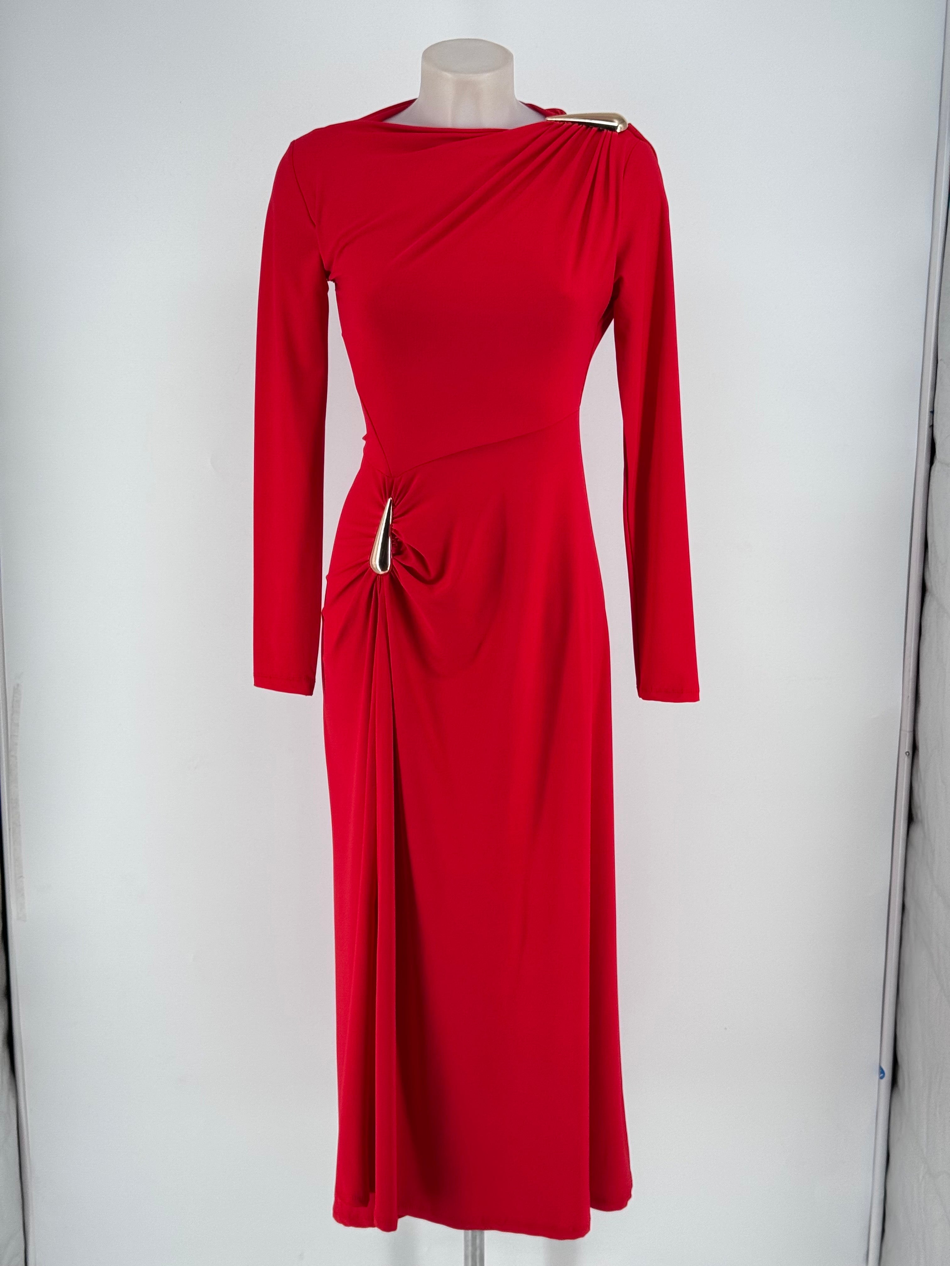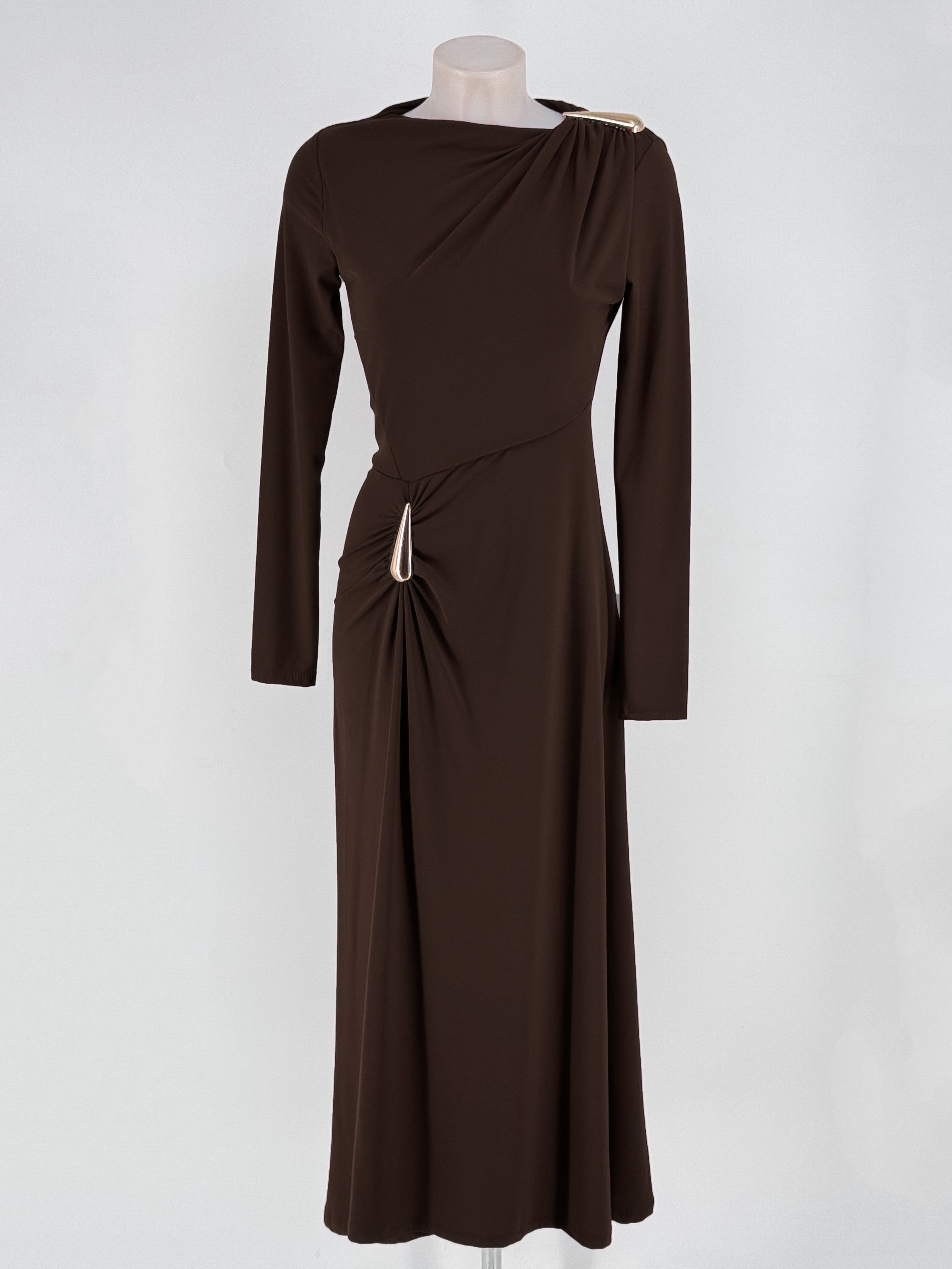 Vestido de elastham con drapeado delantero y detalle de apliques dorados en cintura y hombro