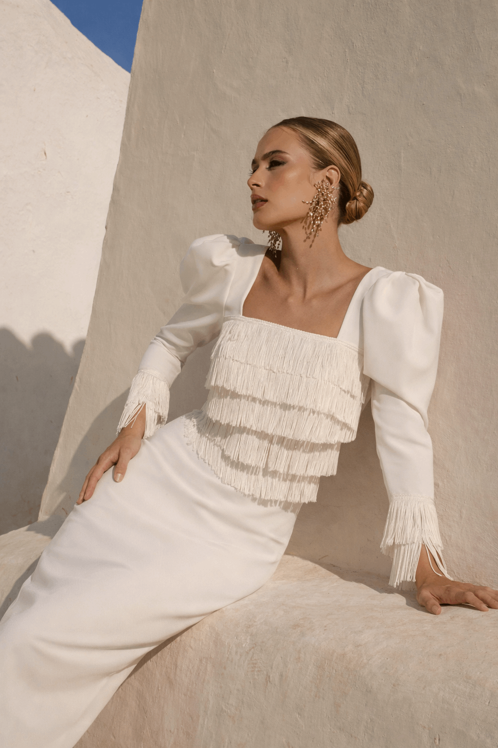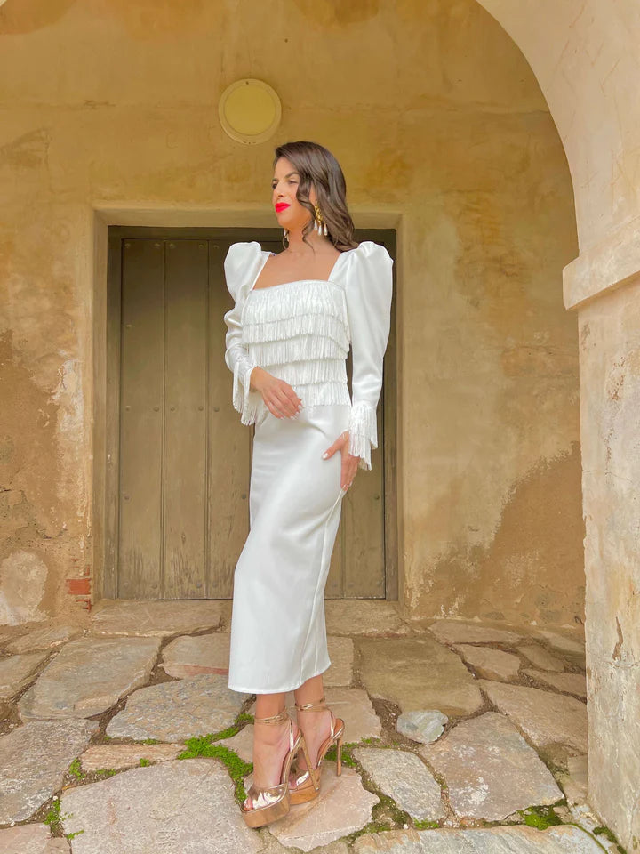 Descubre el Vestido Ronda Blanco, una pieza elegante y sofisticada ideal para cualquier ocasión. Este vestido de crepe blanco presenta un escote cuadrado que realza la figura, complementado con un delicado detalle de pechera de flecos de seda.