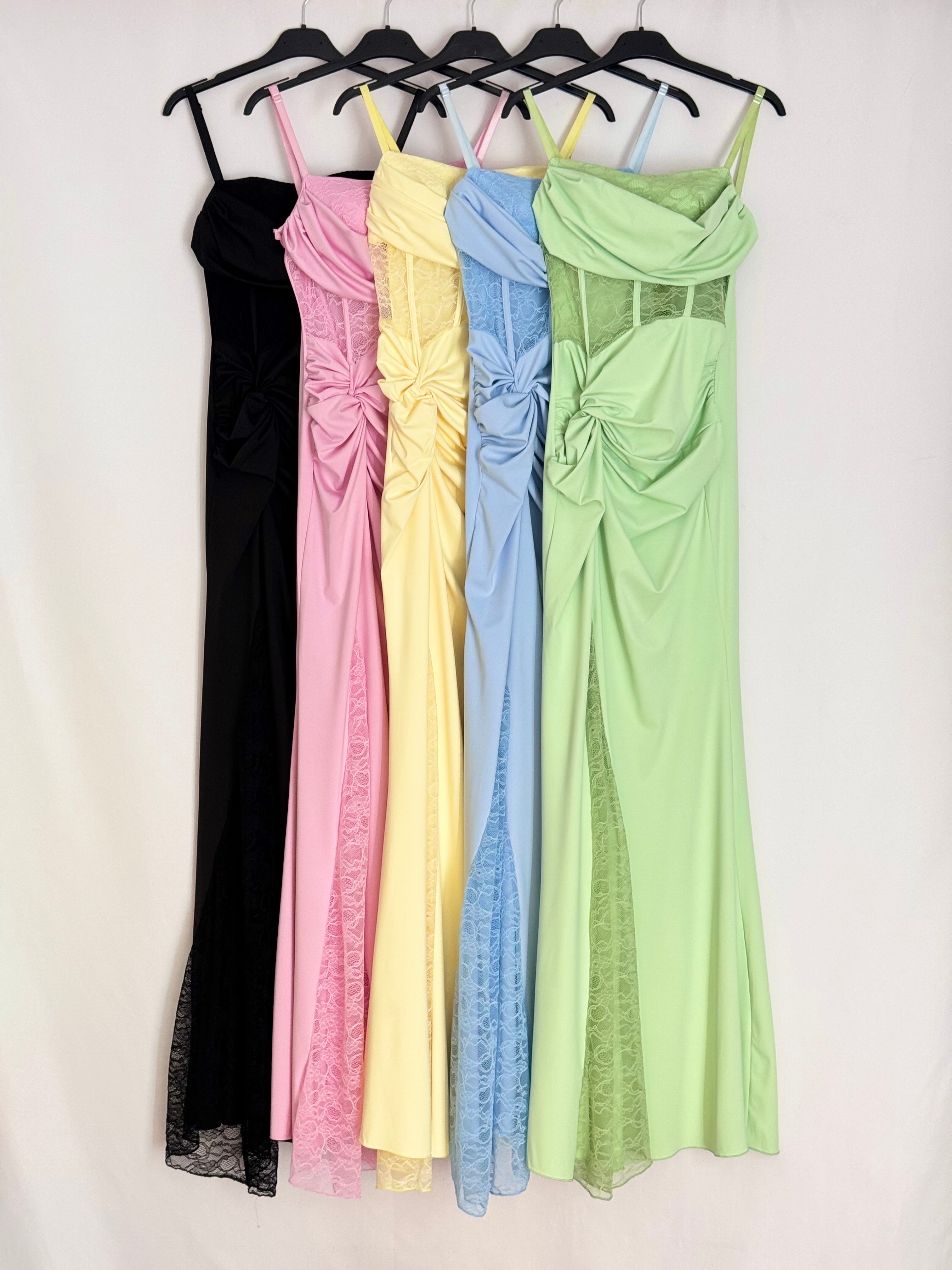 Vestido de satén largo con drapeado trasero, espalda con cuerdas en zigzag y gran abertura en falda
