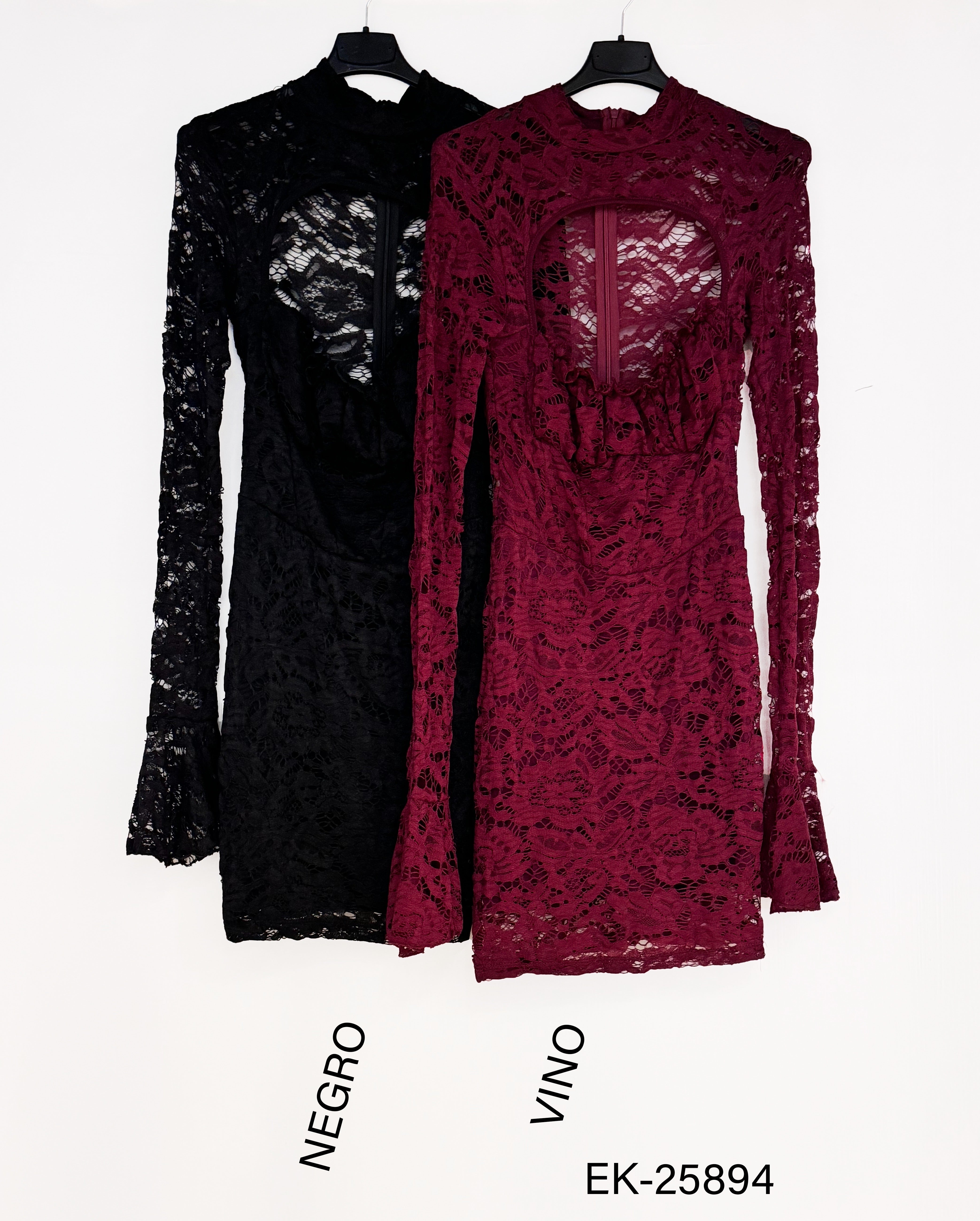 Vestido de encaje con escote abierto y mangas con pequeña campana