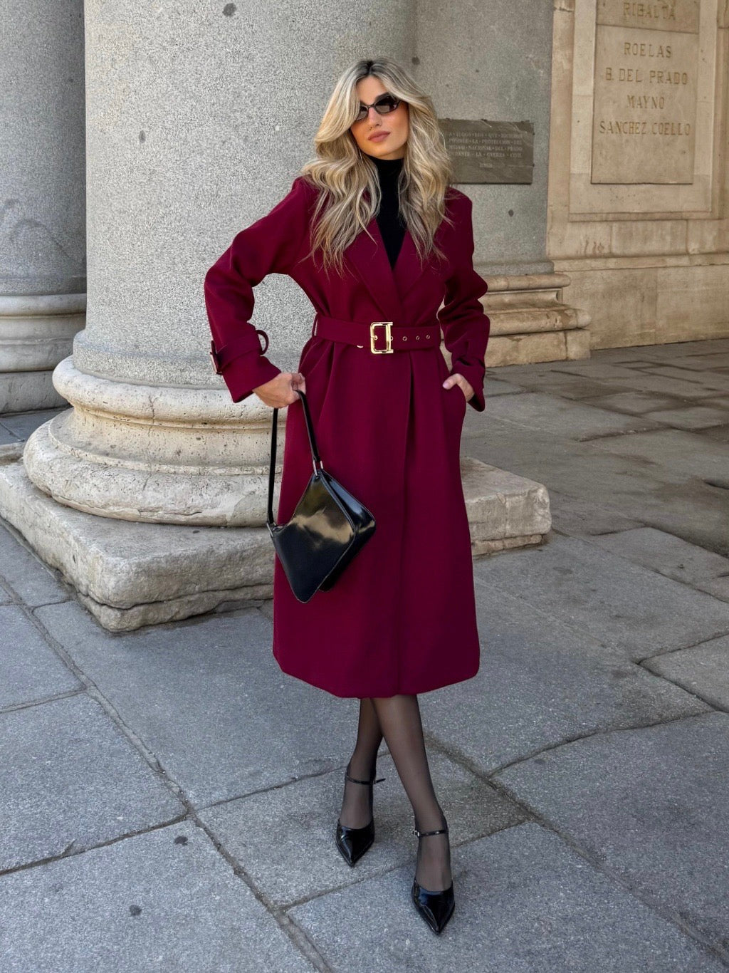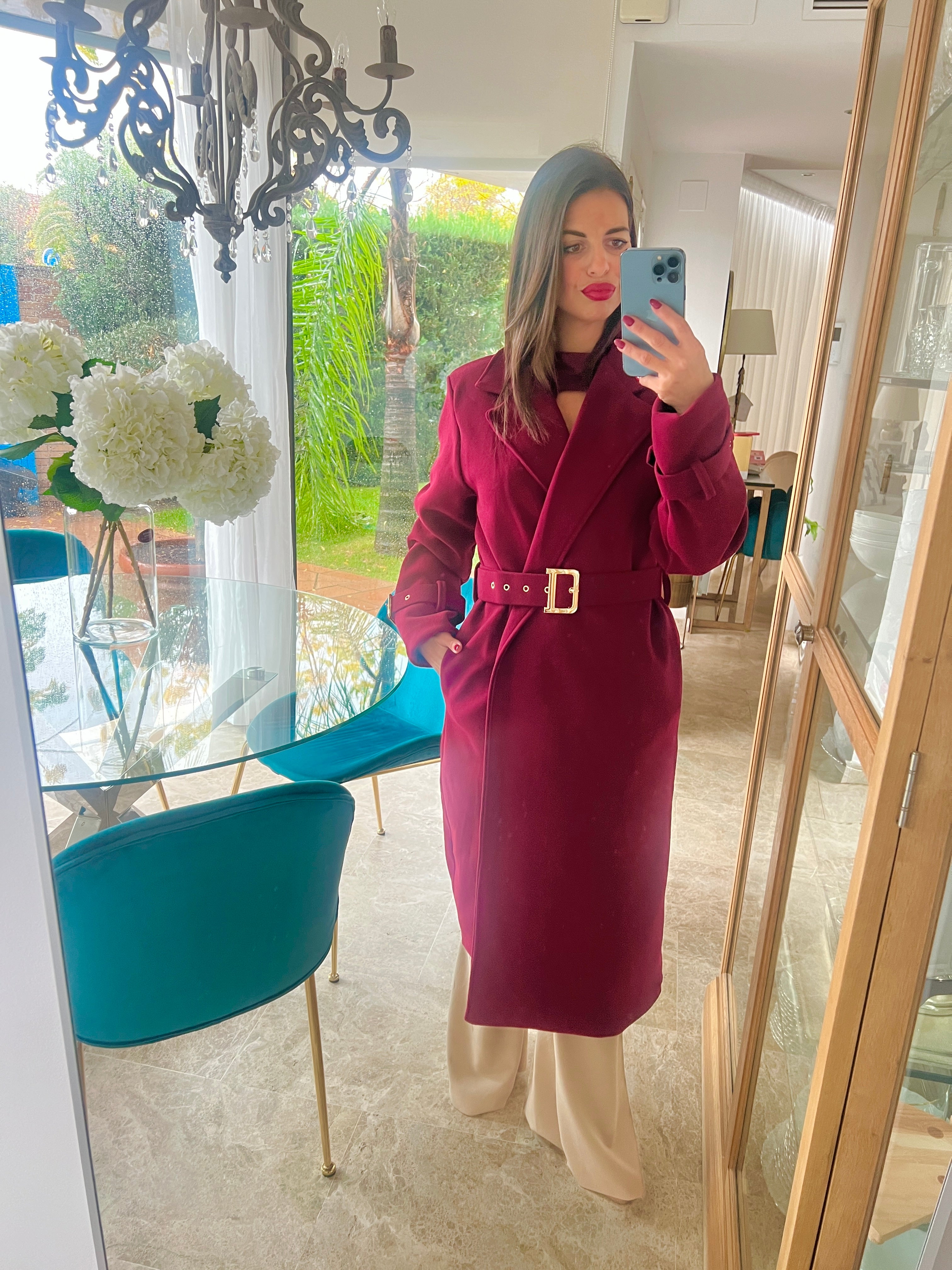 Abrigo de paño tres cuartos con cinturón y detalle de hebillas dorada