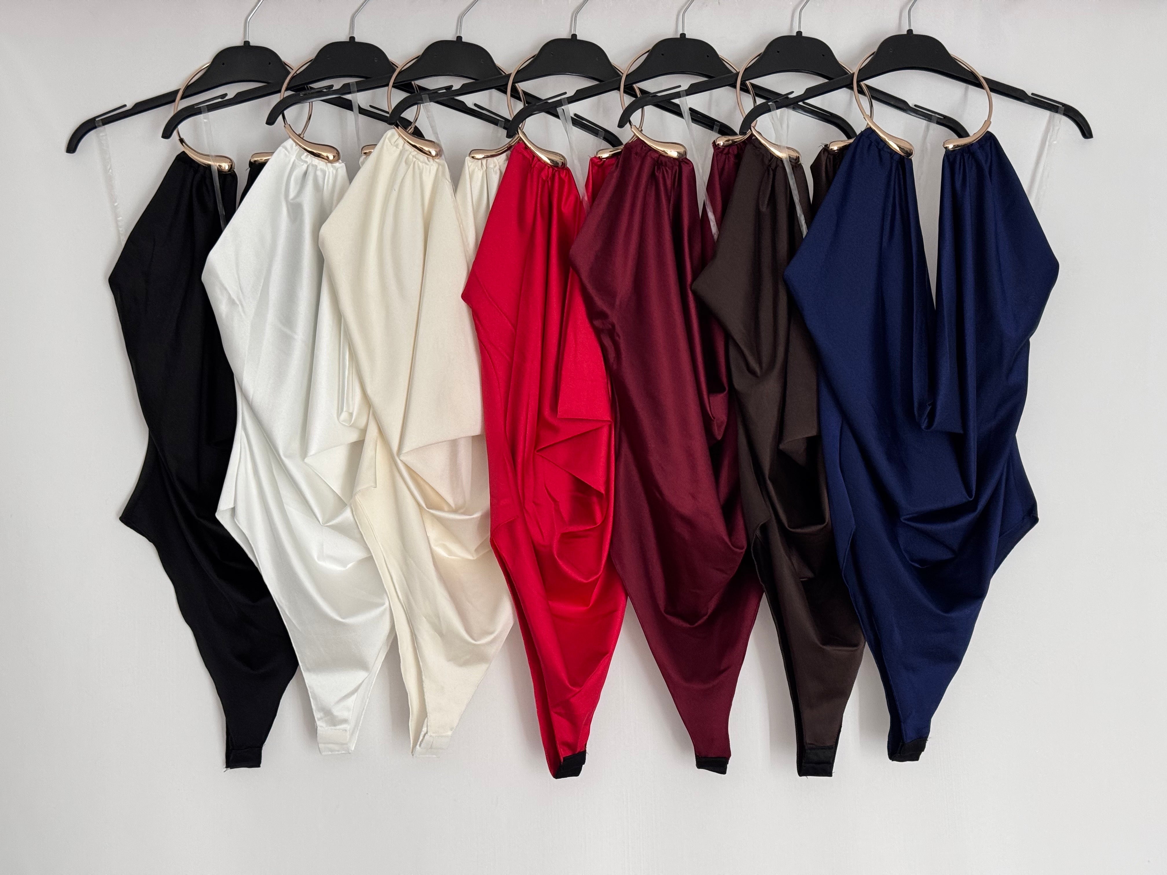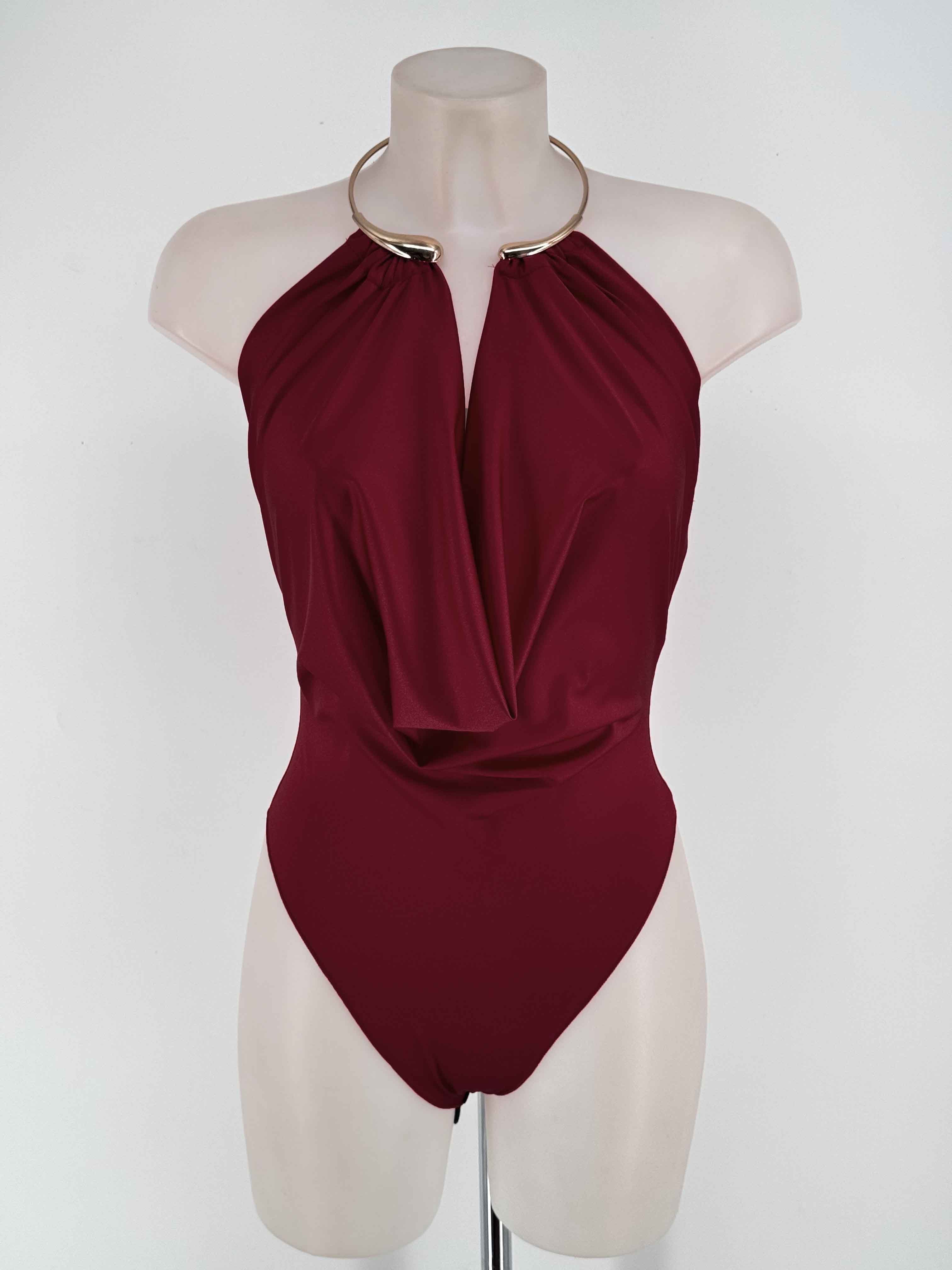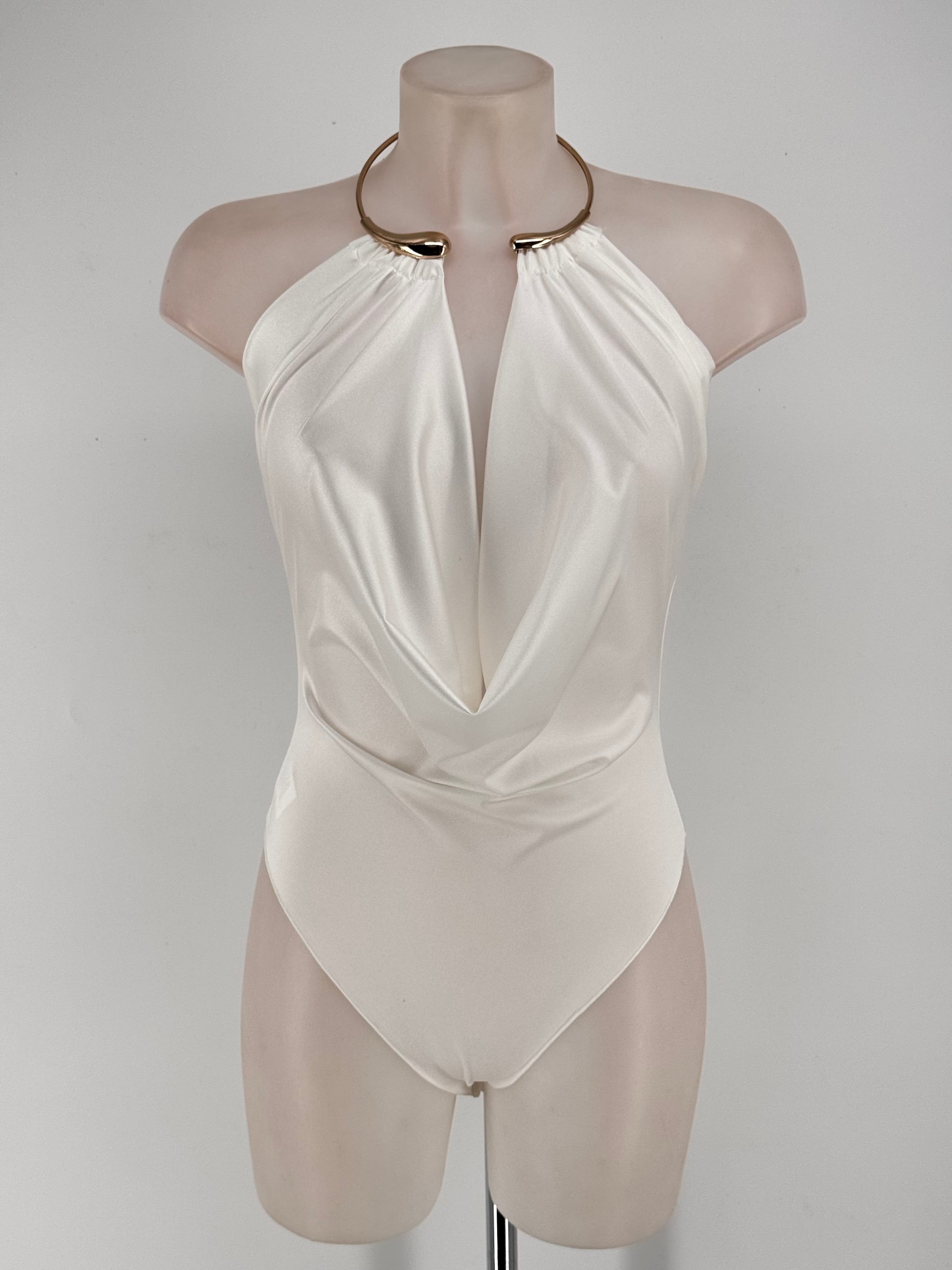 Body de elastham satinado con drapeado en pecho y collar dorado