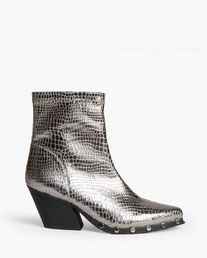 Botín de Piel efecto serpiente combinada con cómodo tacón cowboy y detalle de tachuelas laterales