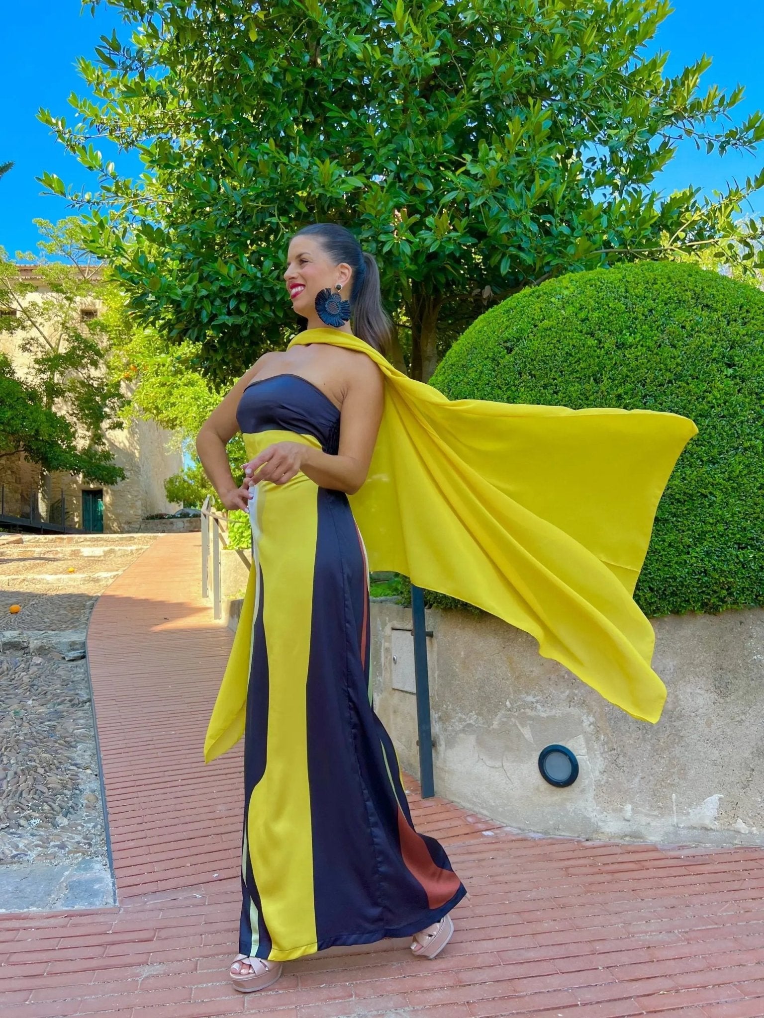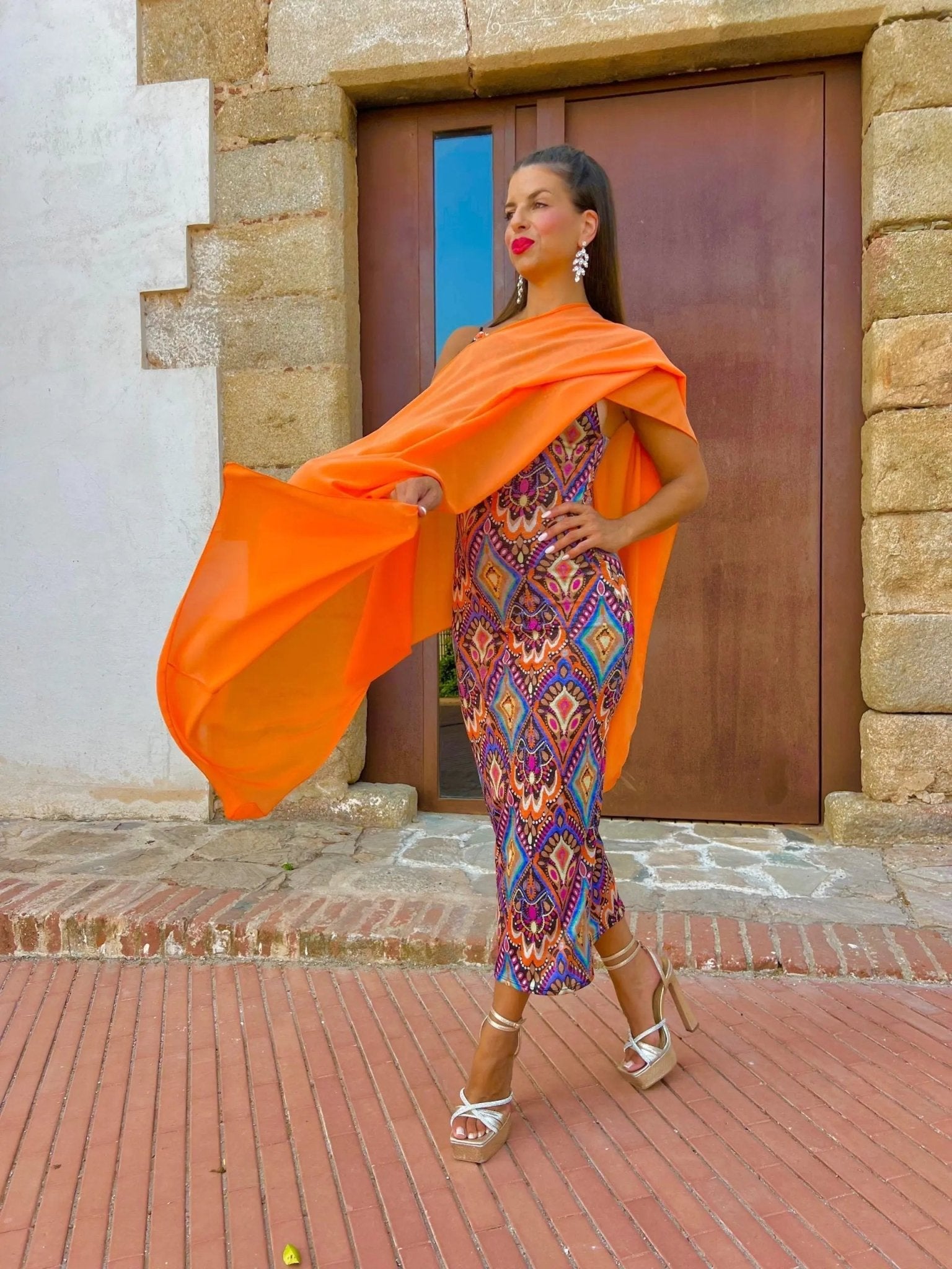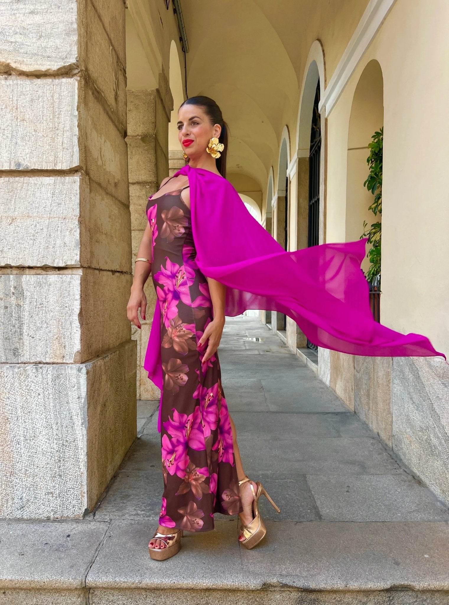 La Capa de Gasa es una estola multiposición que combina elegancia y versatilidad. Su diseño permite múltiples formas de uso, adaptándose a diferentes estilos y ocasiones.