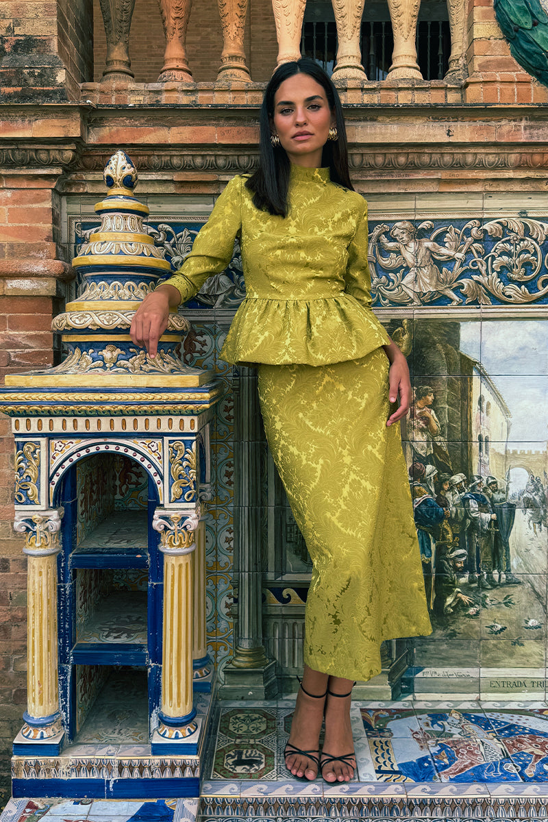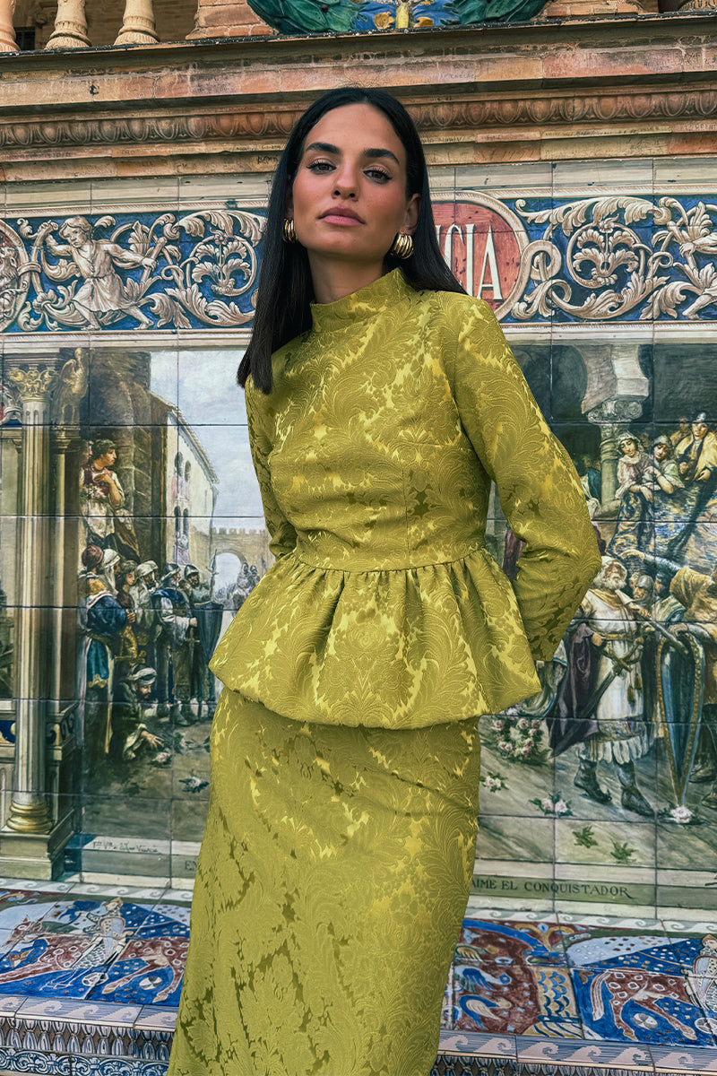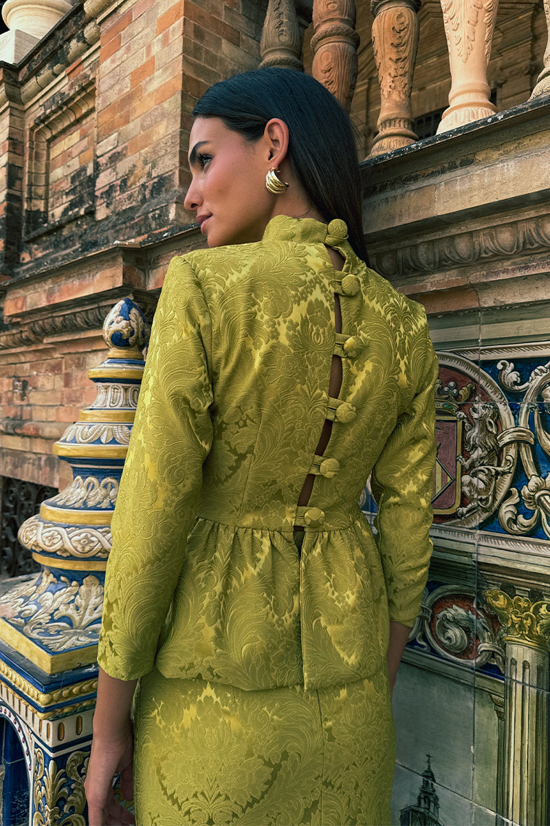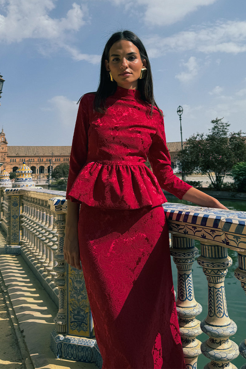 Conjunto confeccionado en tejido brocado compuesto por top con botonadura trasera, cuello perkins, mangas francesas y peplum tipo globo, y falda lápiz de largo midi.
