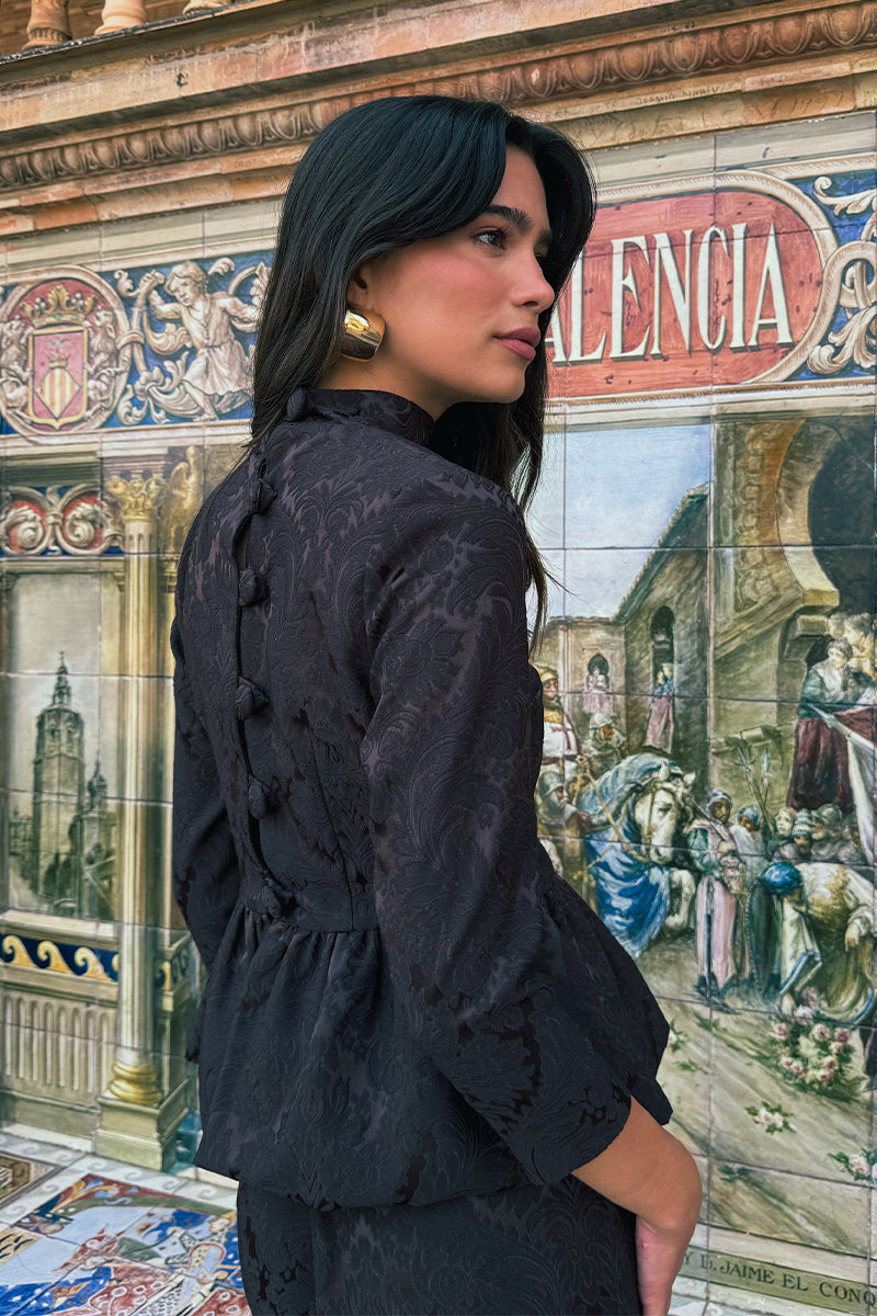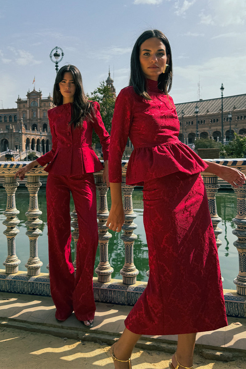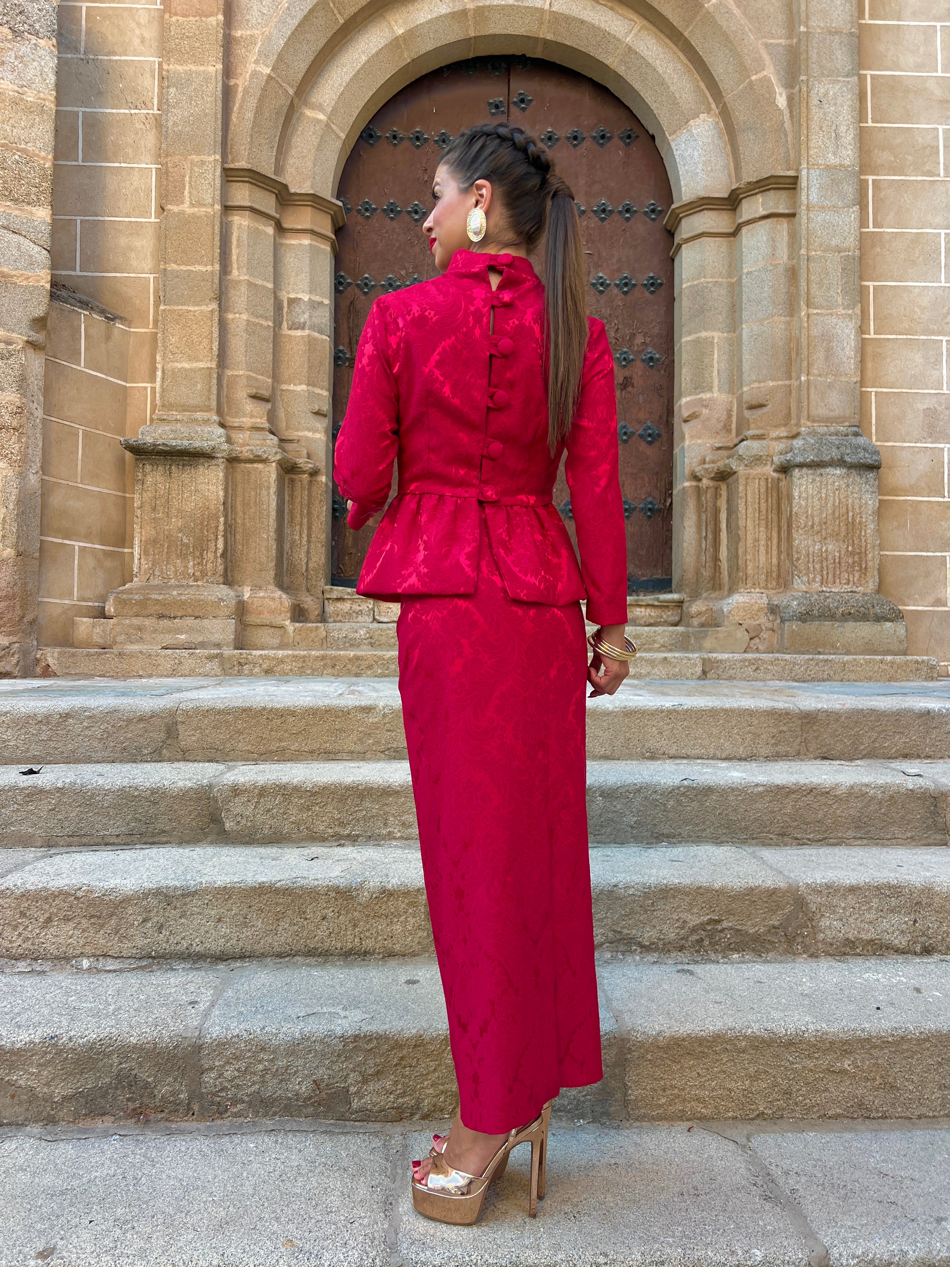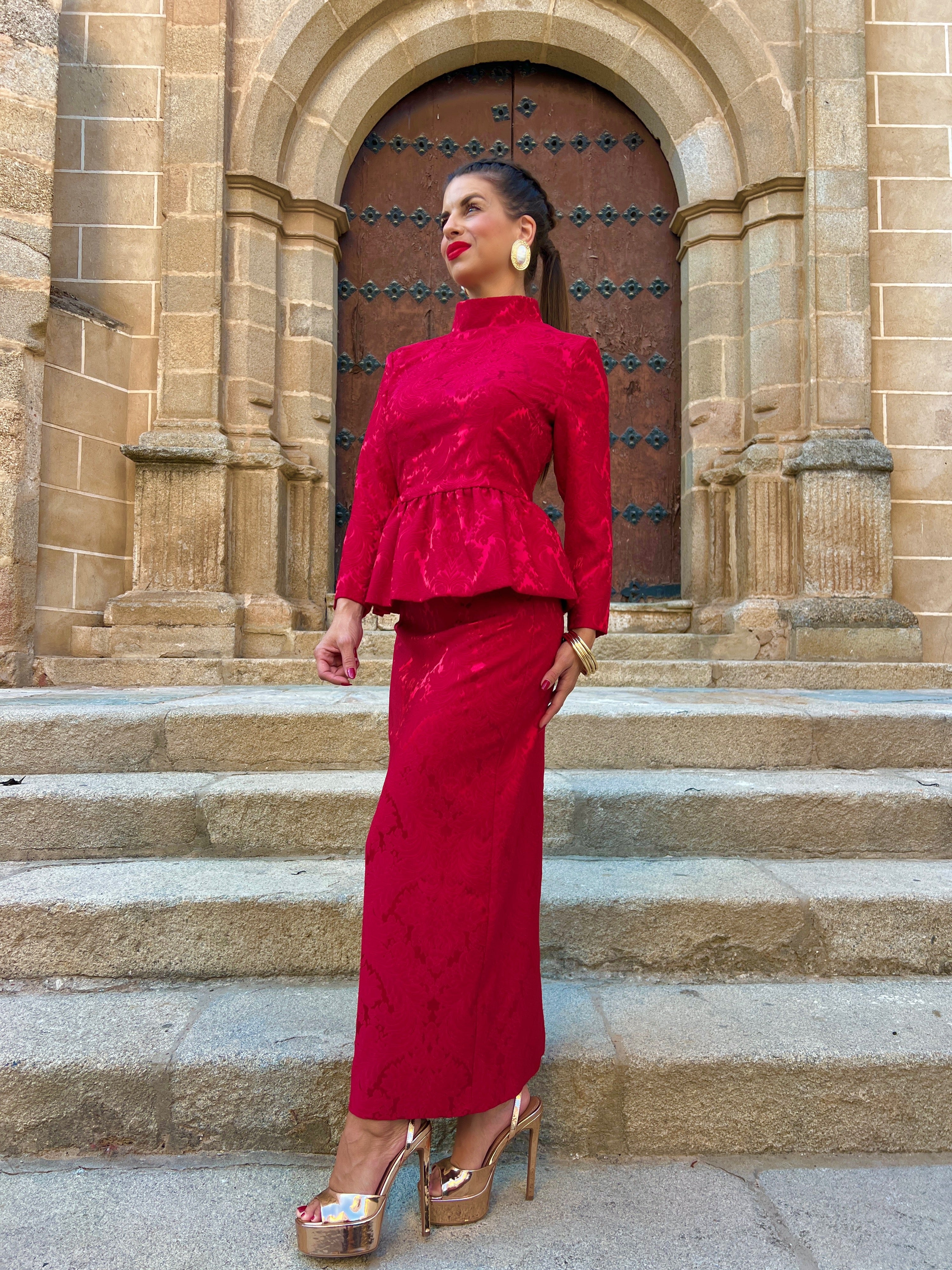 Conjunto confeccionado en tejido brocado compuesto por top con botonadura trasera, cuello perkins, mangas francesas y peplum tipo globo, y falda lápiz de largo midi.