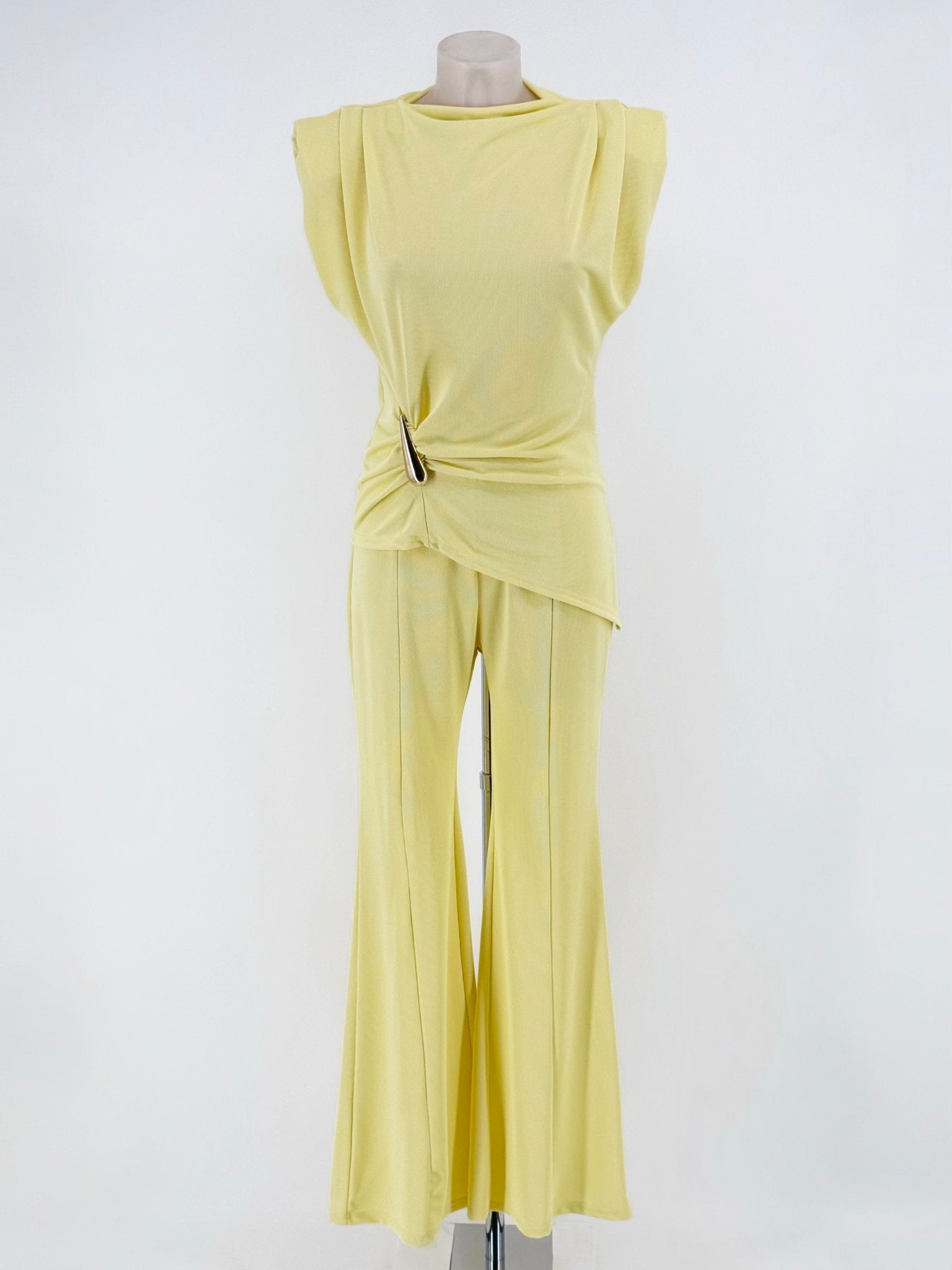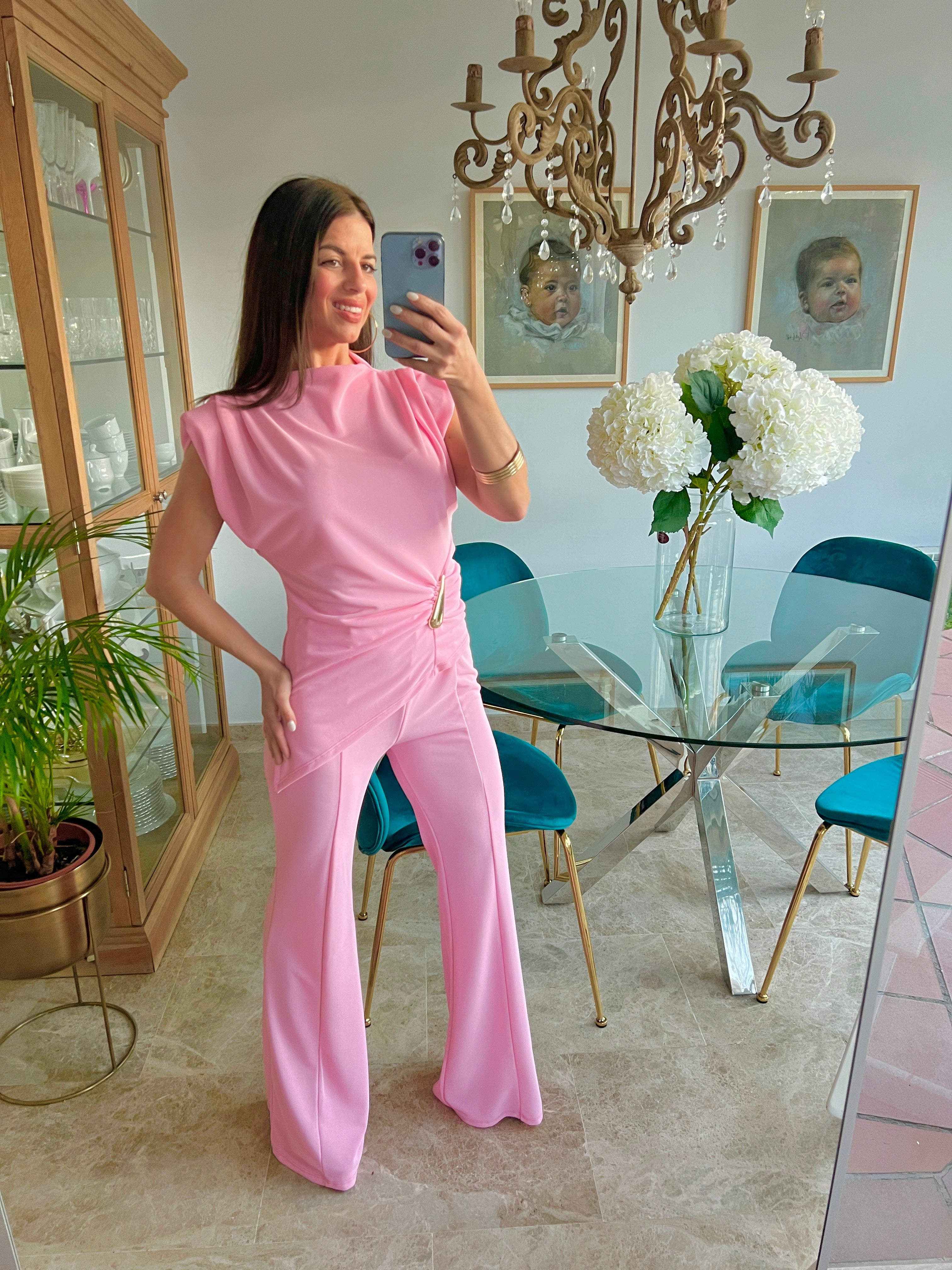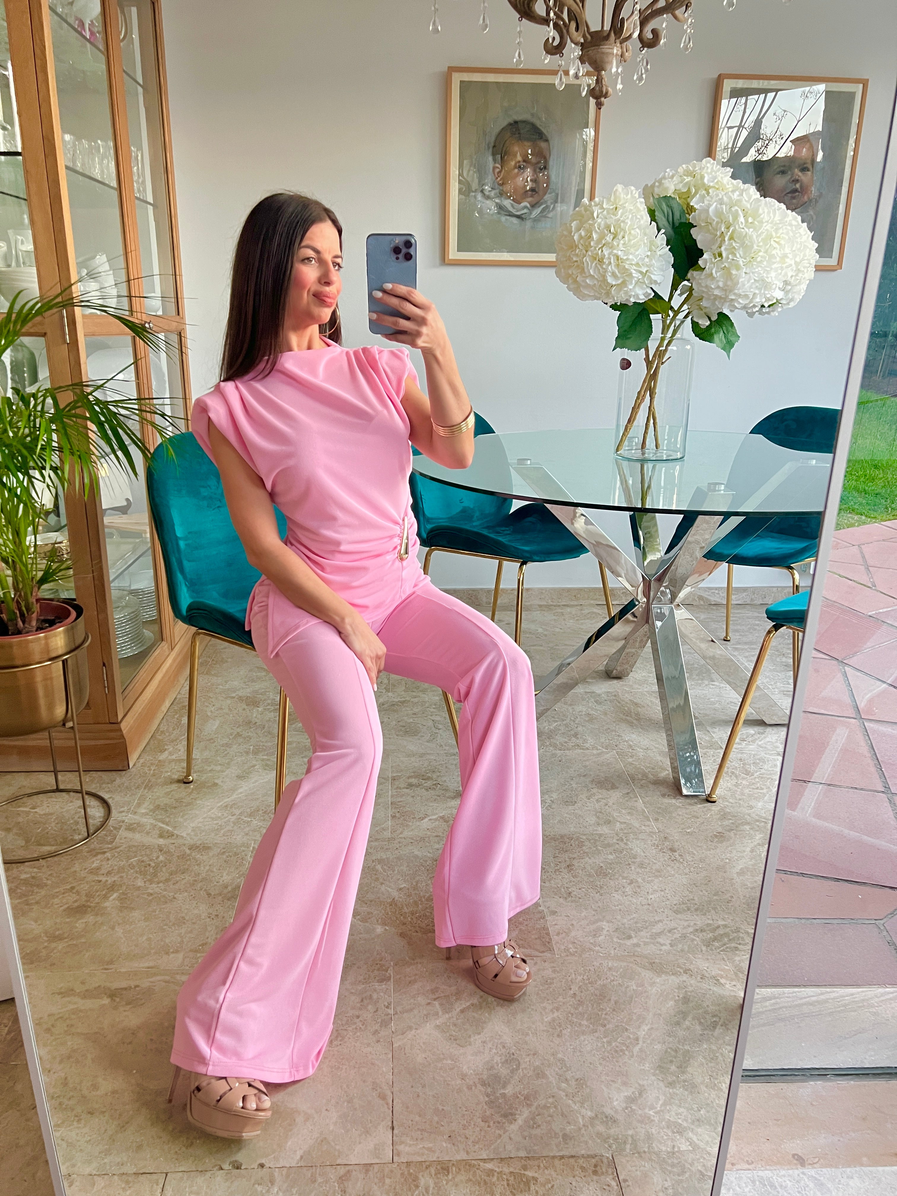 Conjunto de punto de arroz elástico formado por blusa con drapeado frontal y detalle de hebilla dorada y pantalón campana con cinturilla elástica