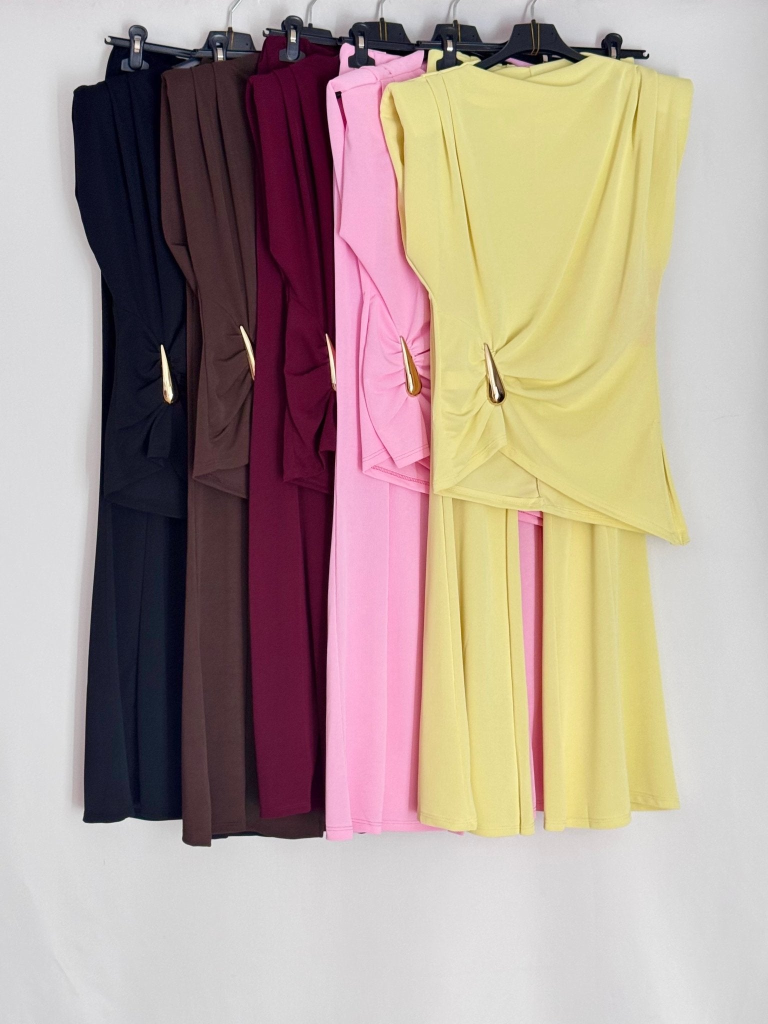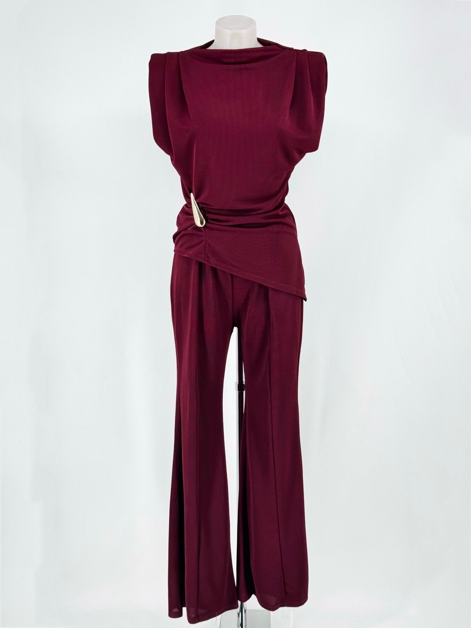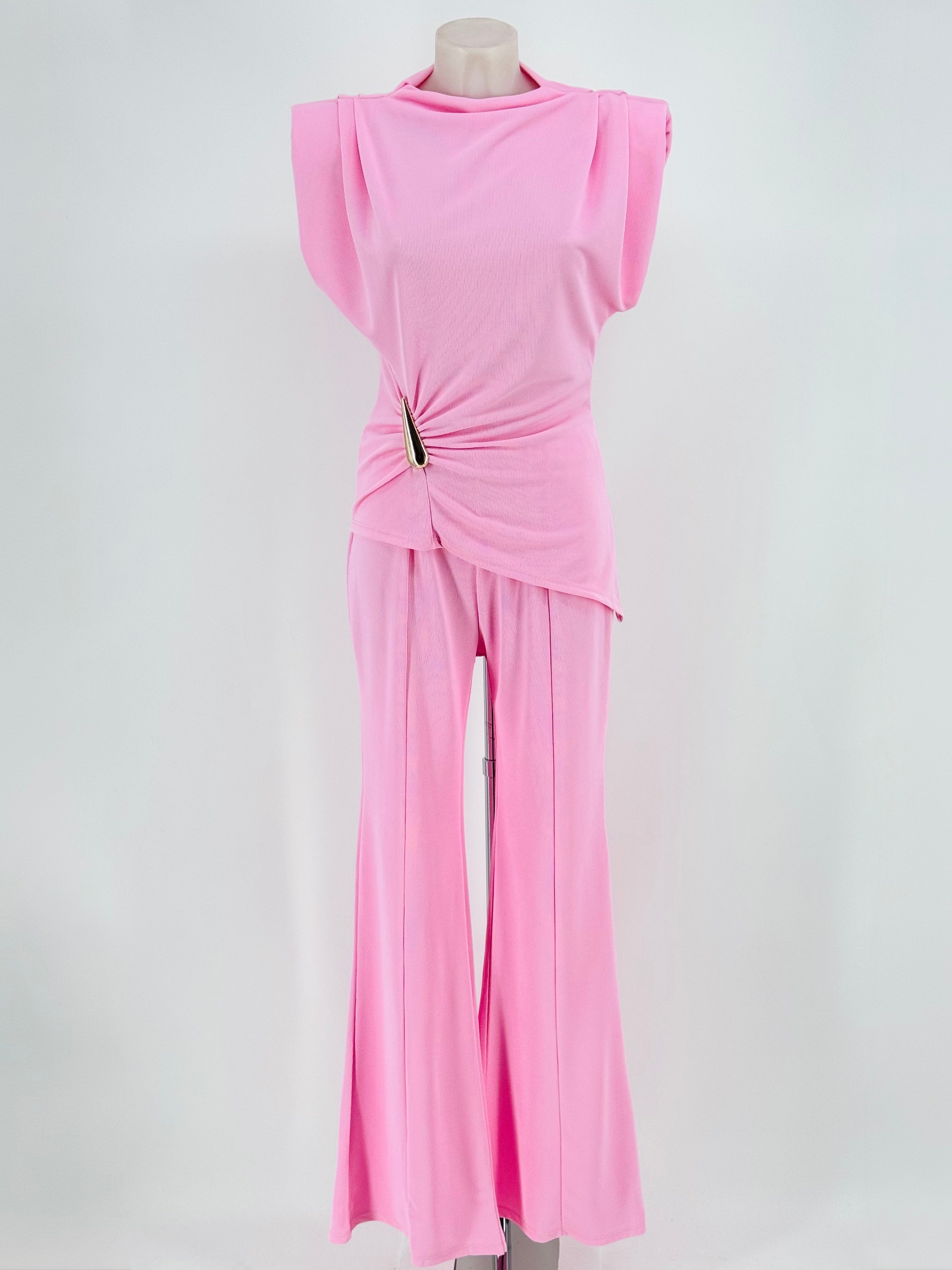 Conjunto de punto de arroz elástico formado por blusa con drapeado frontal y detalle de hebilla dorada y pantalón campana con cinturilla elástica