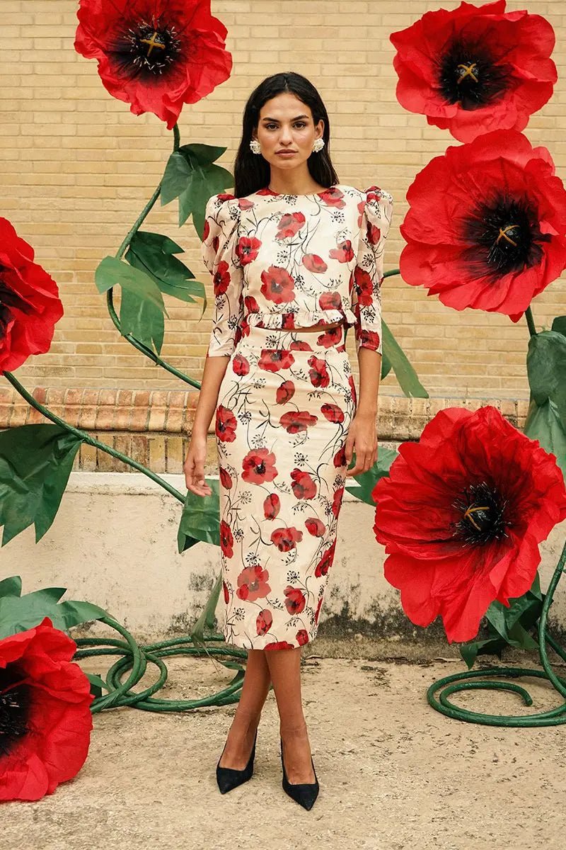 Descubre el Conjunto Rabat Amapolas, una pieza única que combina elegancia y frescura. Este conjunto de gasa brocada presenta un top con mini volante que realza la feminidad, acompañado de una falda lápiz que estiliza la figura.
