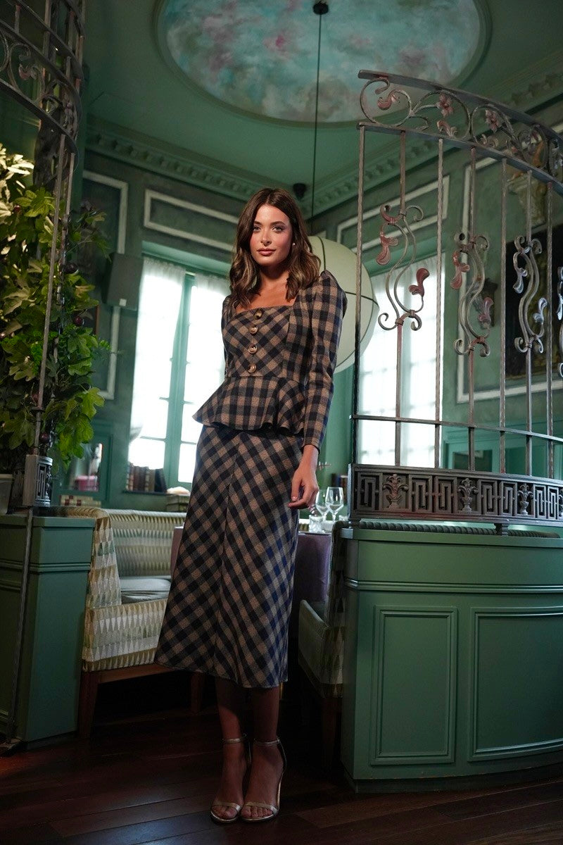 Conjunto de falda midi y blusa abotonada confeccionado en un tejido tipo lana estampado en cuadros de tonos neutros. Lleva cierre con cremallera invisible.