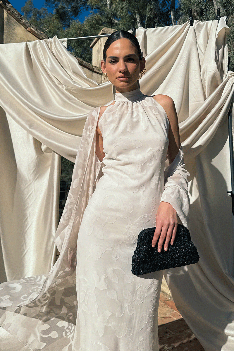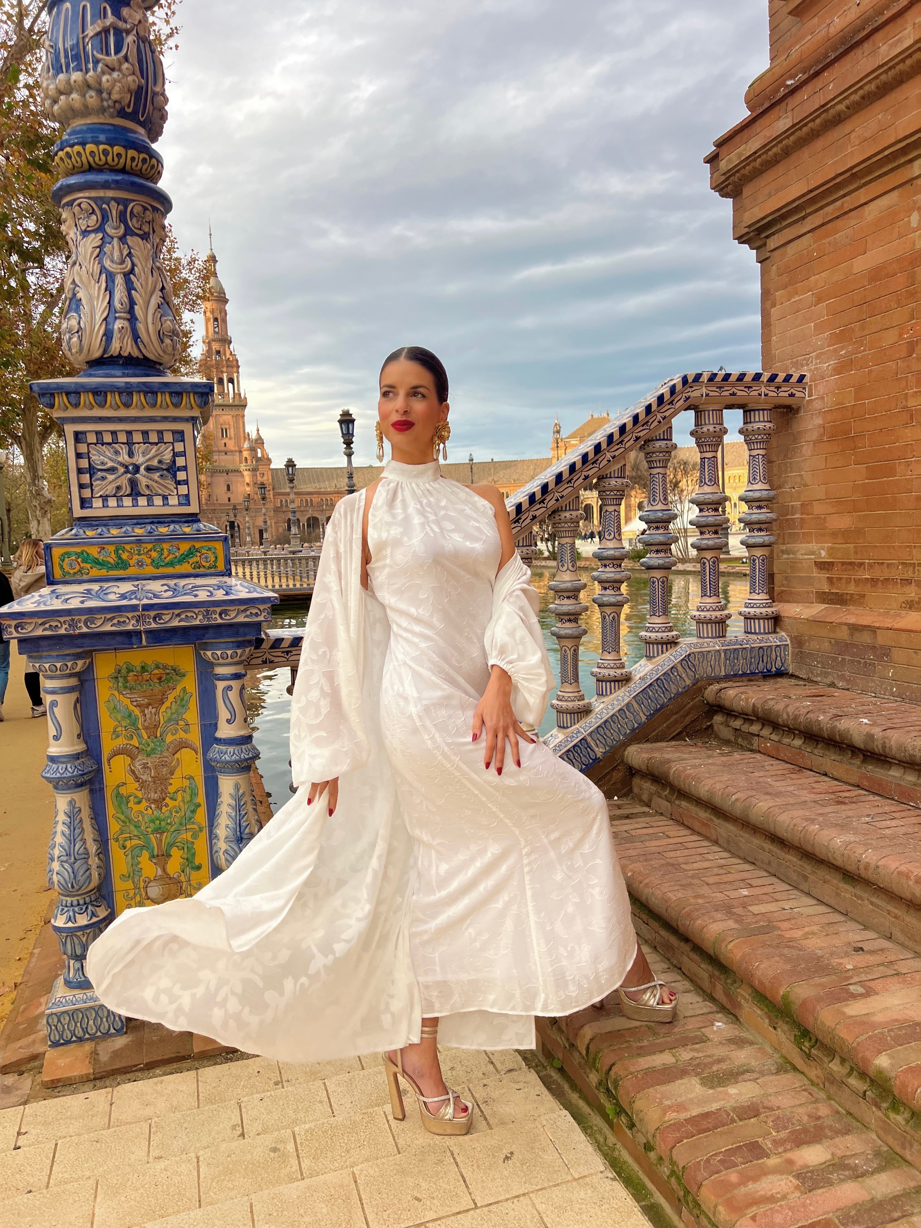 Conjunto de dos piezas elaborado en gasa formado por vestido de cuello halter y kimono