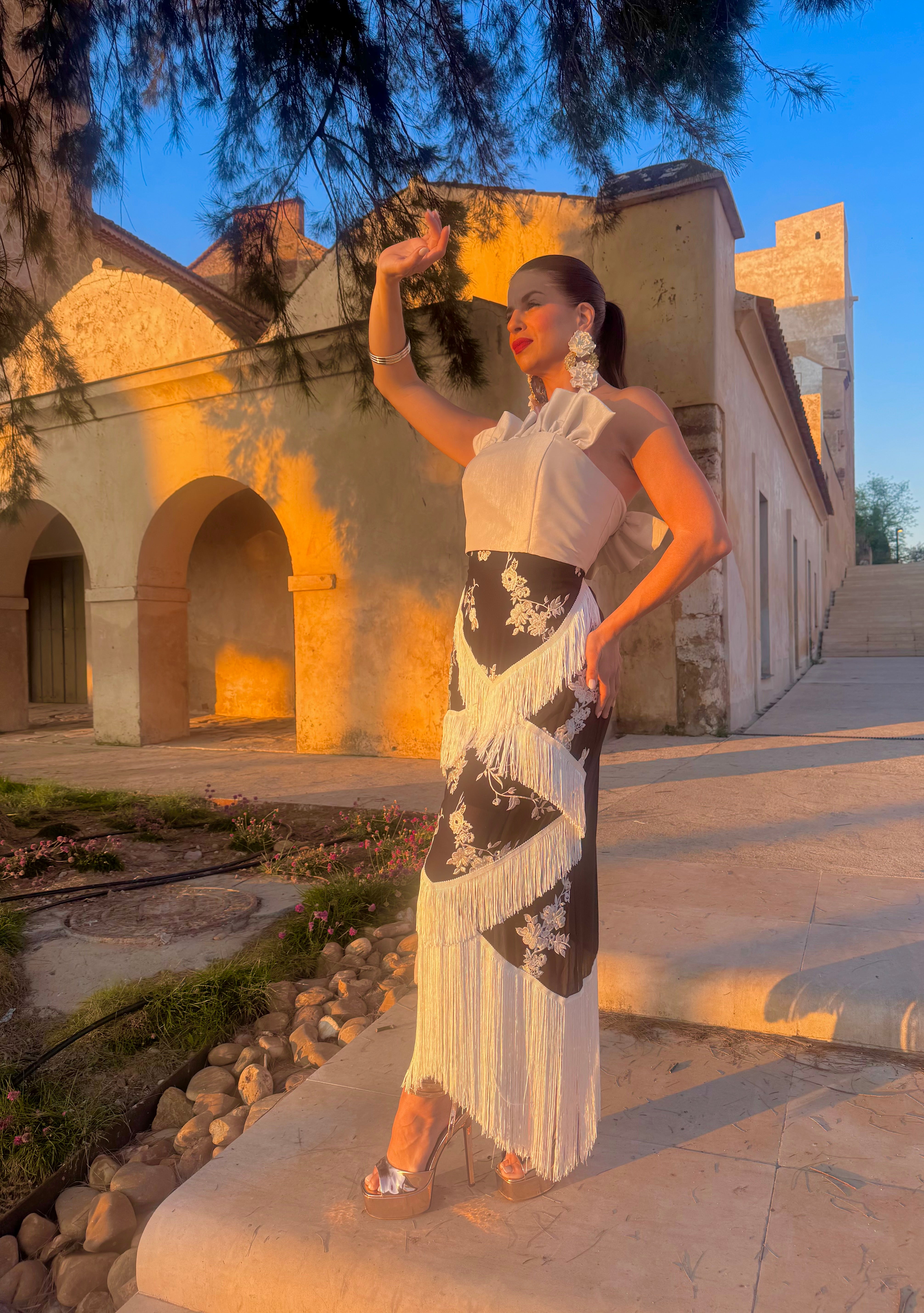 Falda mantón de gasa con detalles florales bordados y flecos de seda