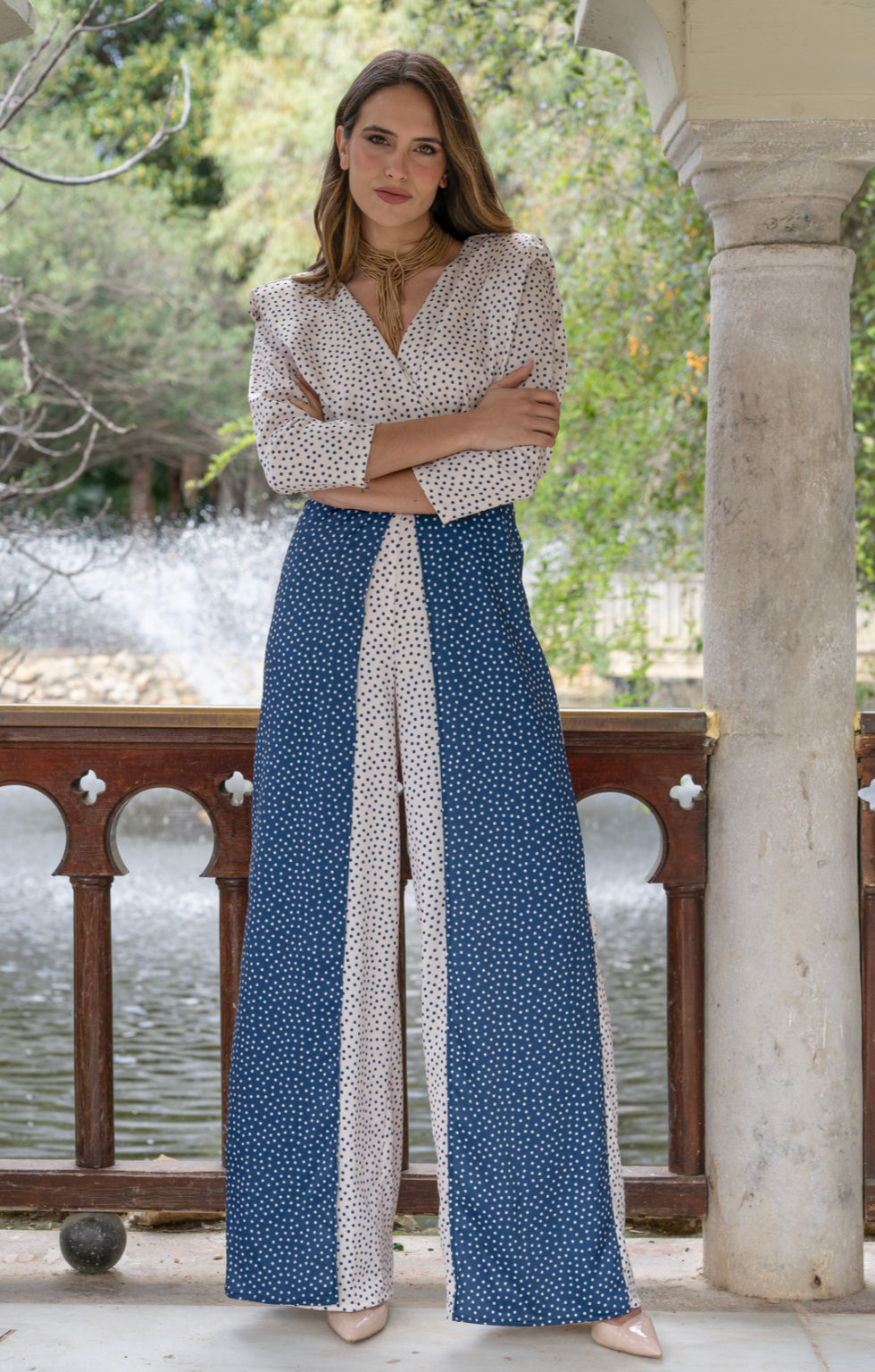 Mono de gasa en print de lunares con caídas delanteras en contraste