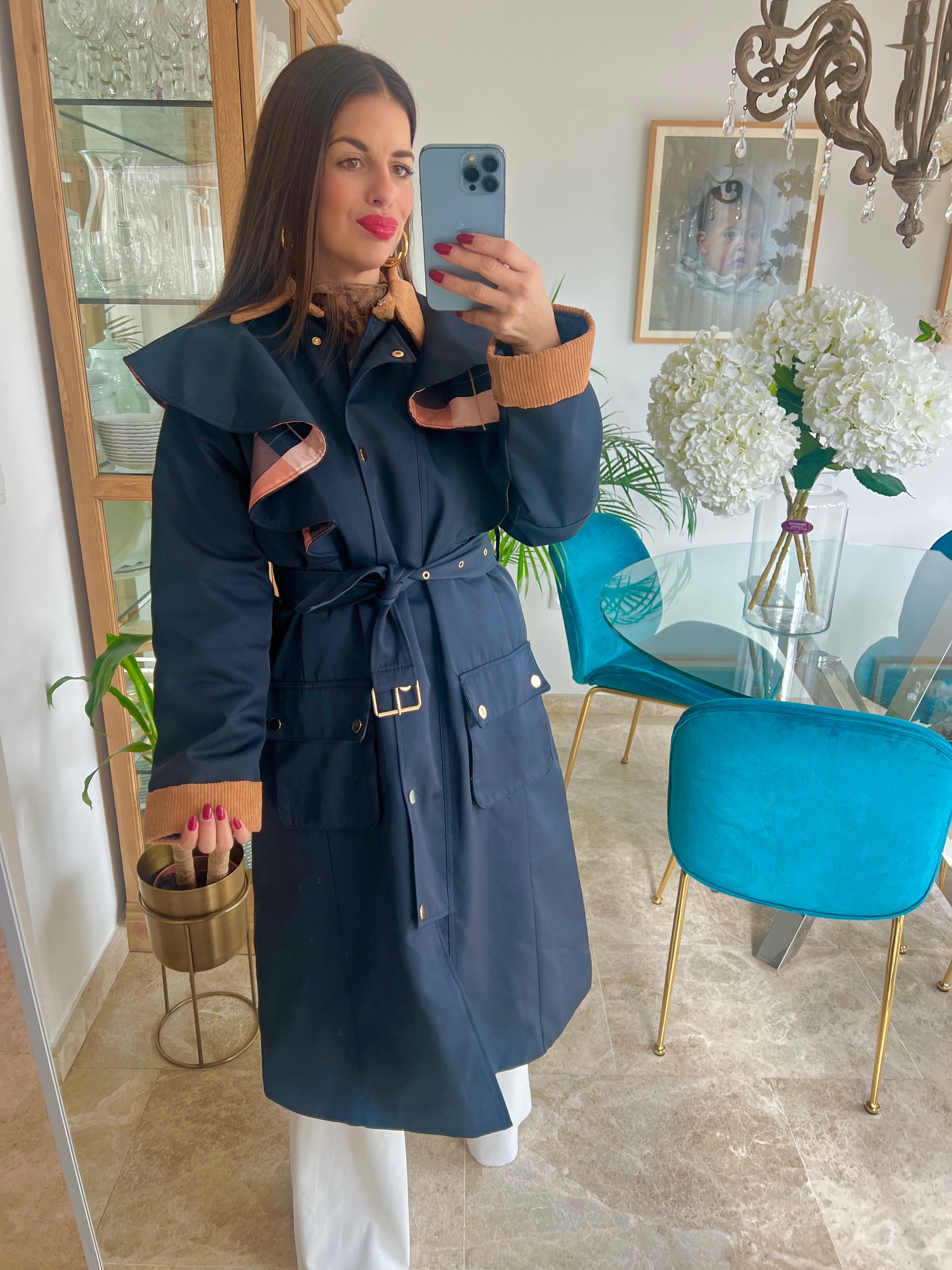 Gabardina tipo sahariana encerada con cinturón y detalles de volantes con vuelta de cuadros y cuello de pana.