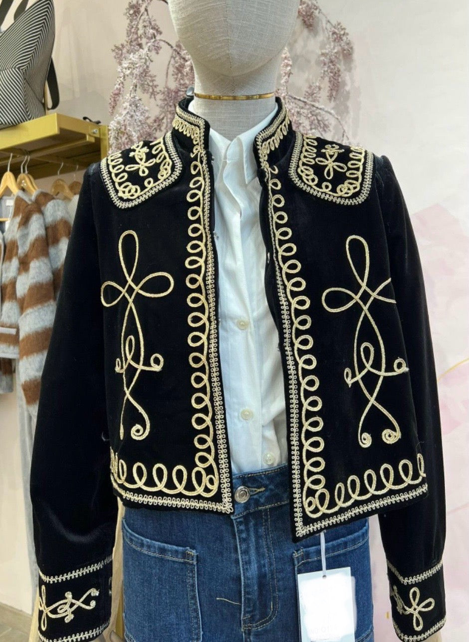 Chaqueta torera de terciopelo negro con ribeteado dorado
