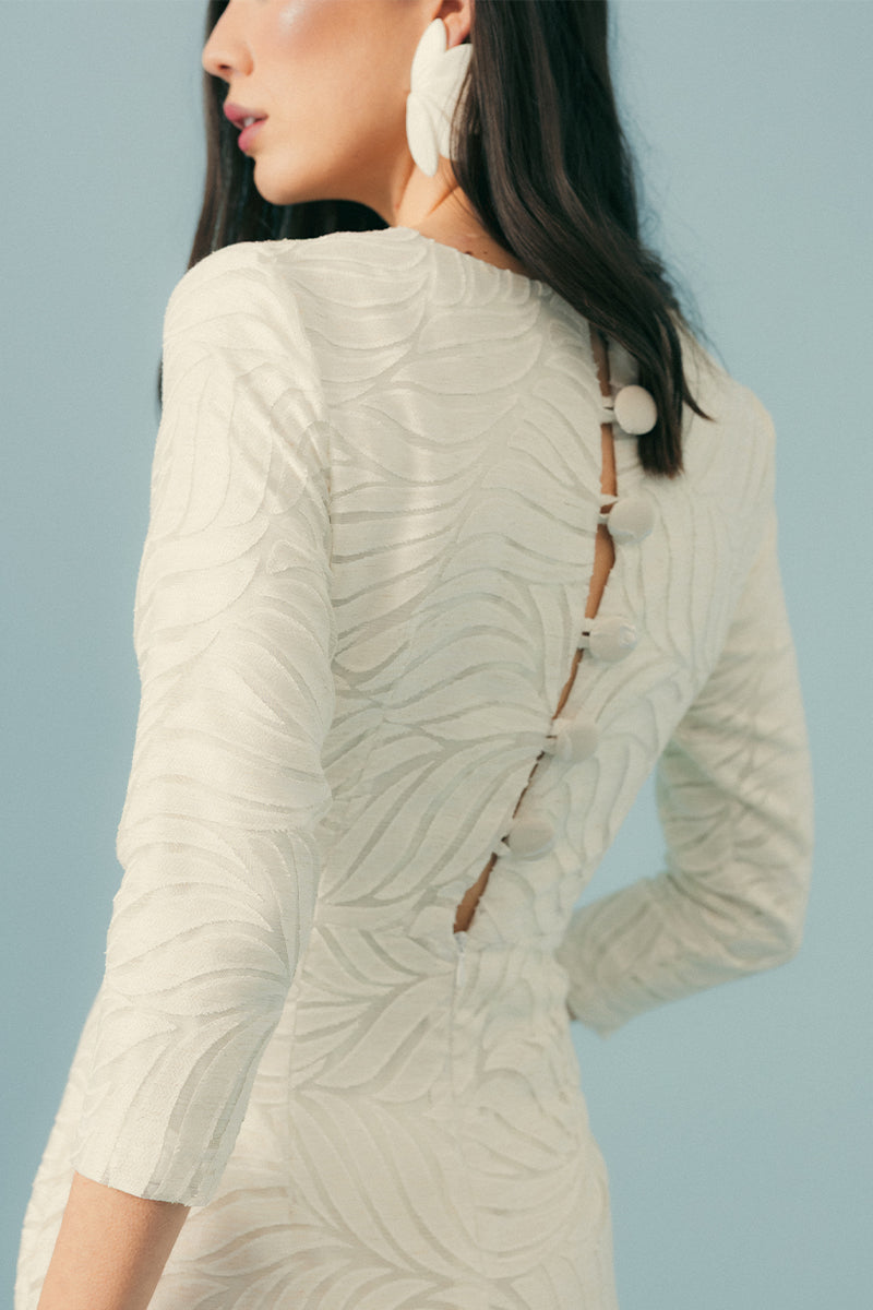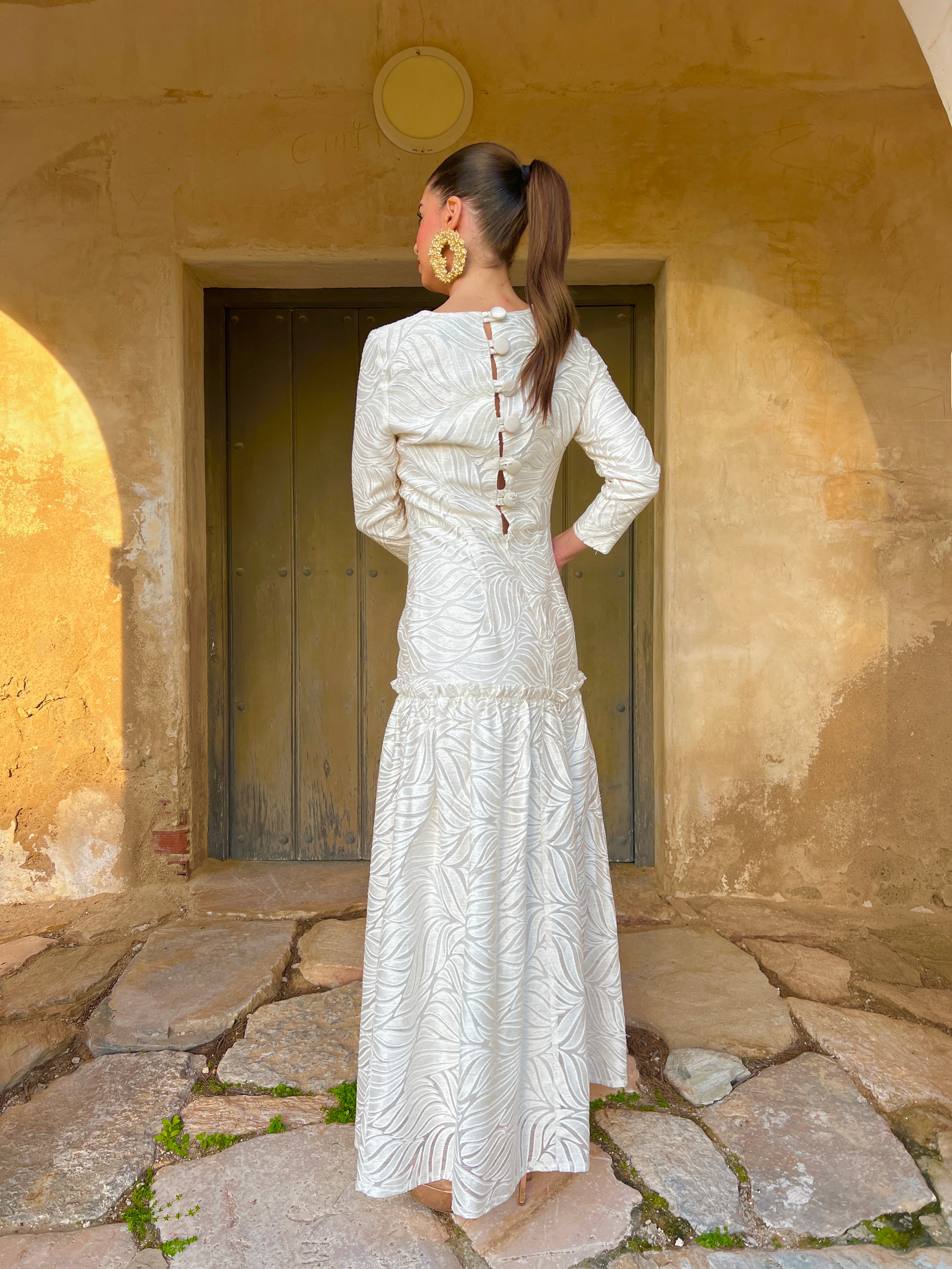Vestido confeccionado en devoré de lino, de largo midi, con escote a la caja, mangas francesas, detalle de botones en espalda, entallado hasta la cadera y falda con maxi volante con cabecilla vista al hilo.