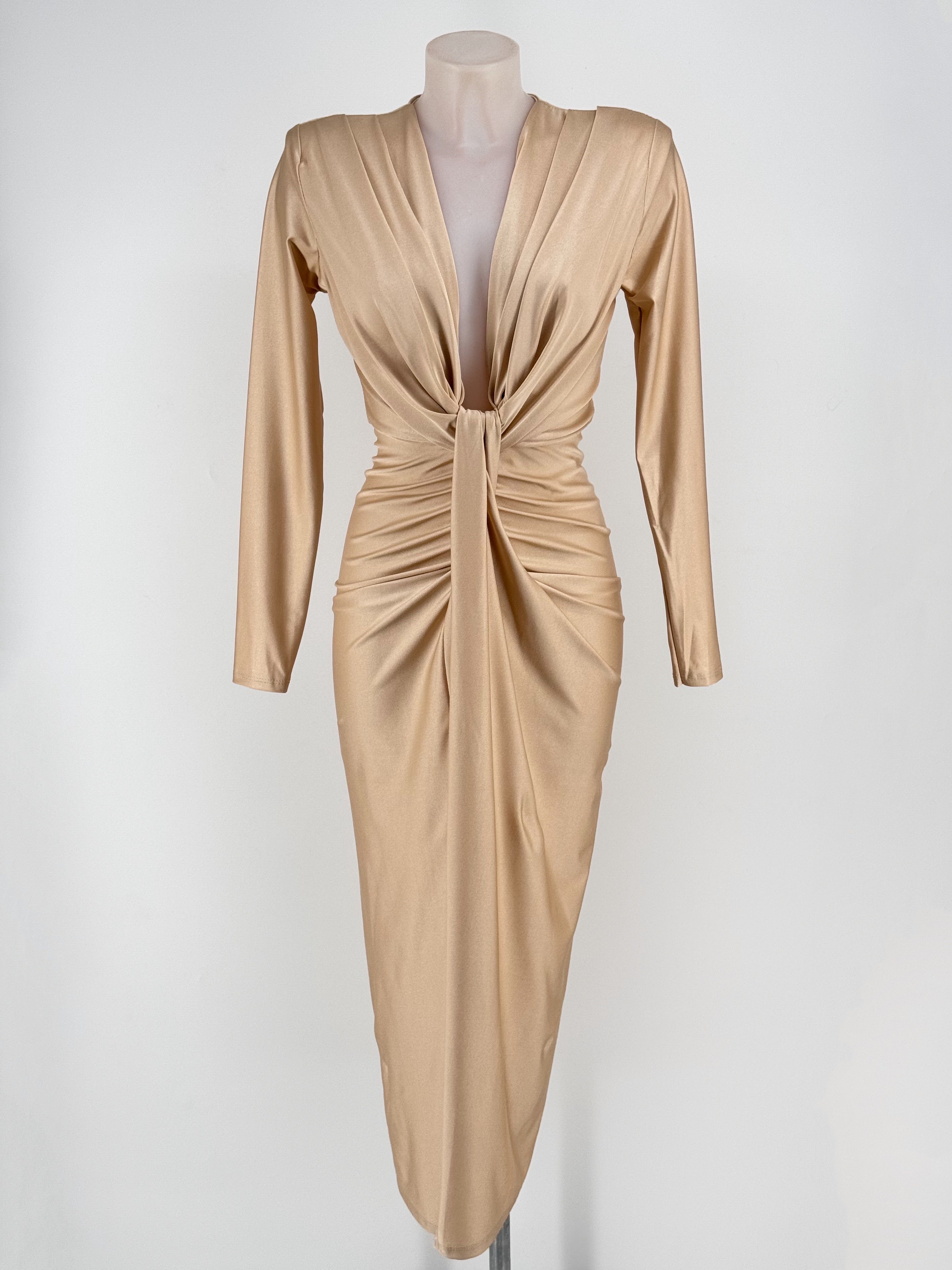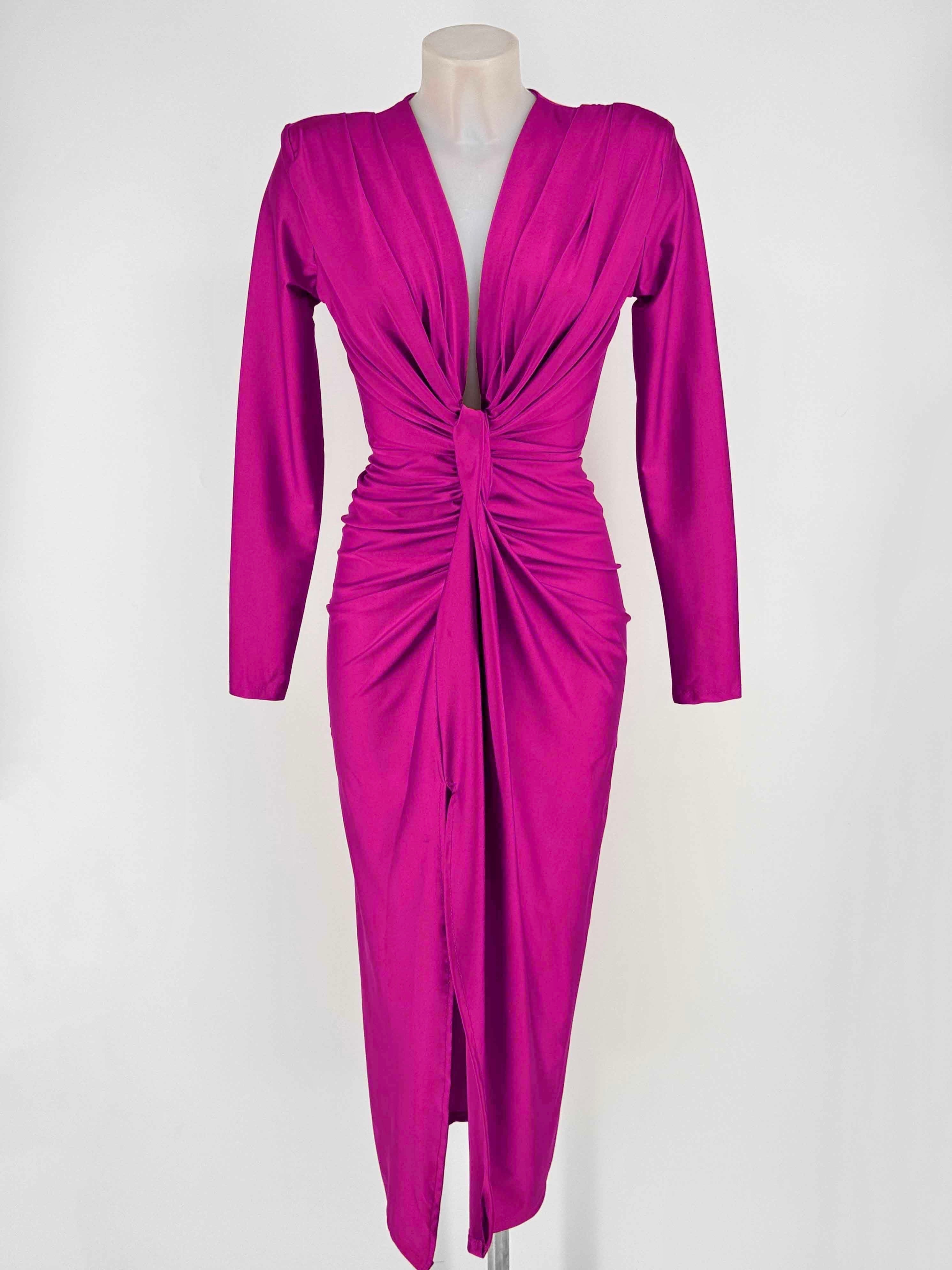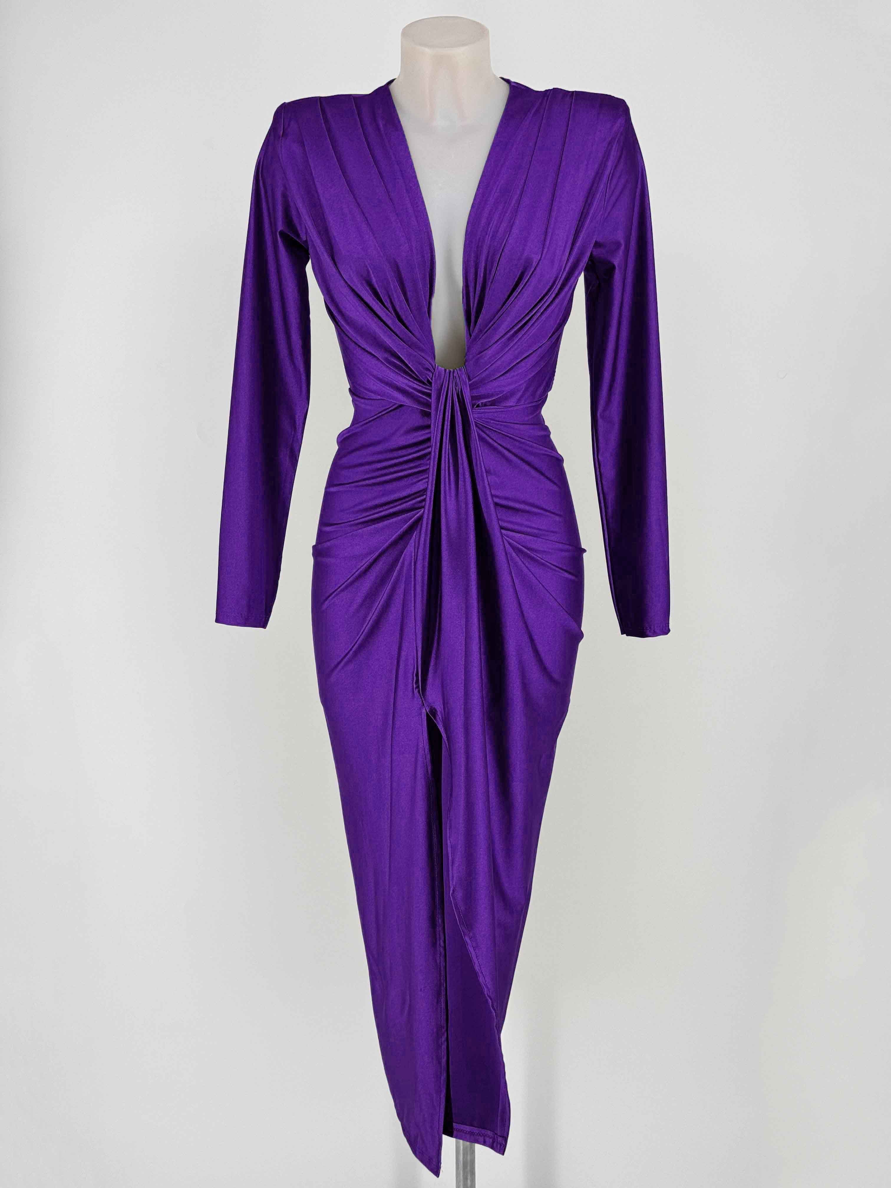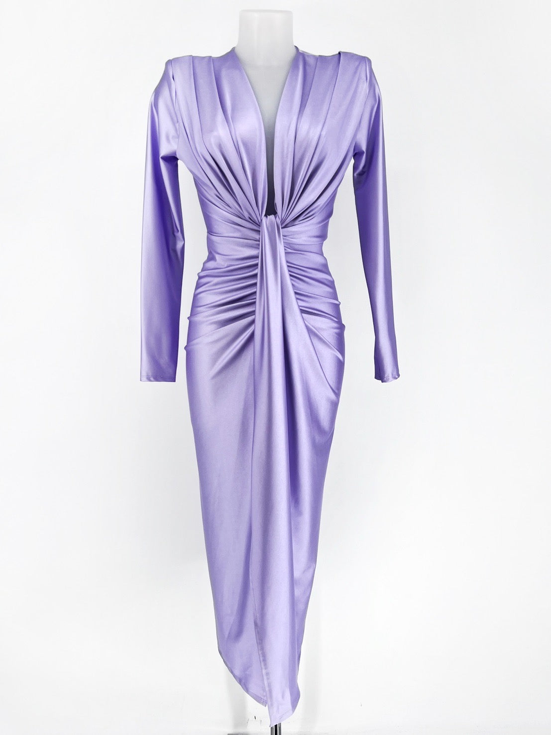 Vestido de elastham satinado con escote pronunciado y detalle de drapeado en falda con abertura lateral