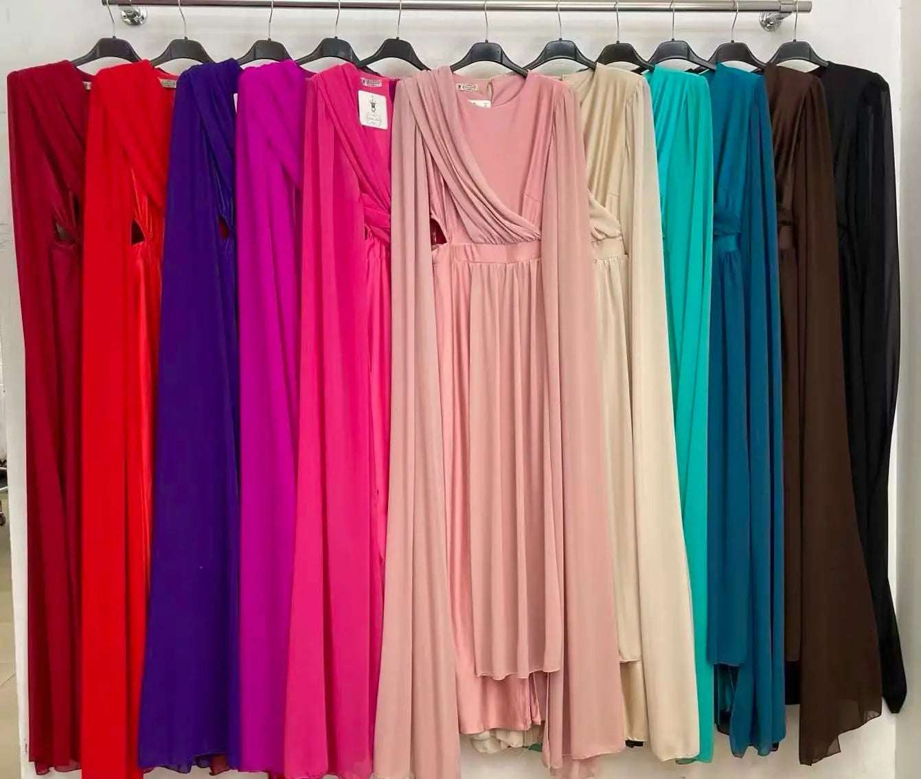 Las caídas de gasa en la pechera y los laterales, que nacen desde los hombros, añaden un toque de sofisticación y movimiento. Su tejido totalmente elástico se adapta cómodamente a diferentes siluetas, garantizando un ajuste perfecto. Disponible en talla única, es ideal para cualquier ocasión especial.
