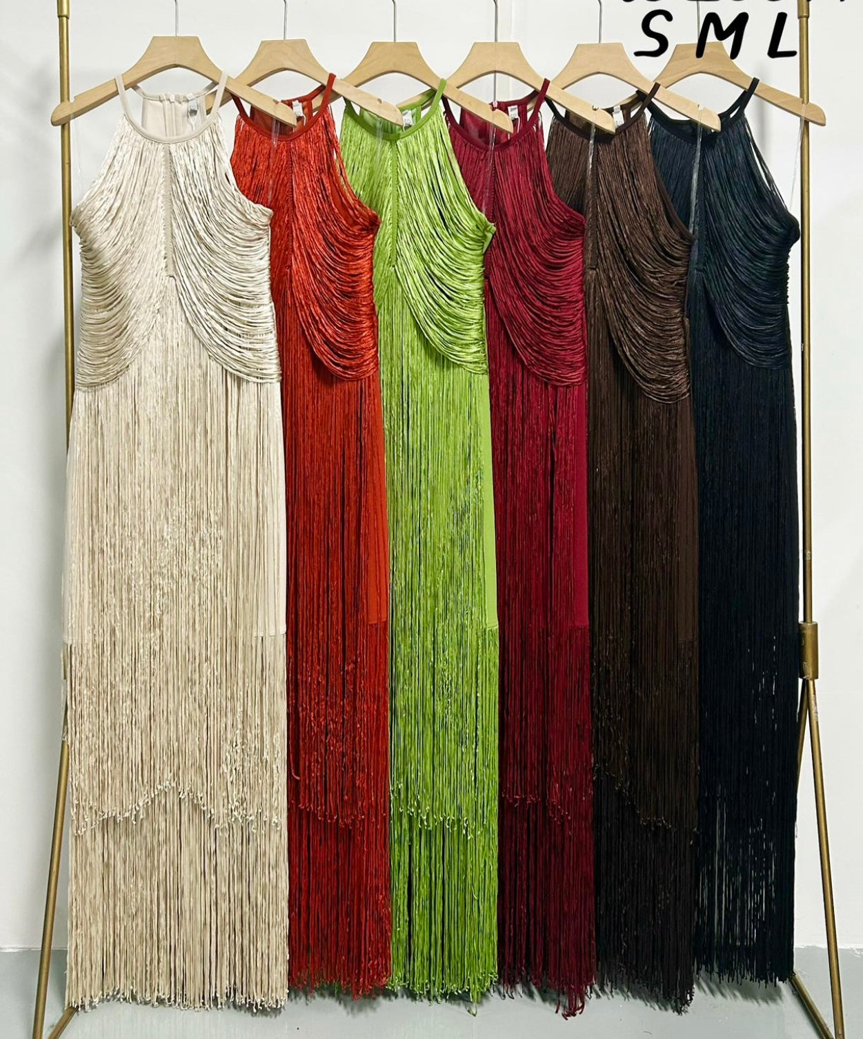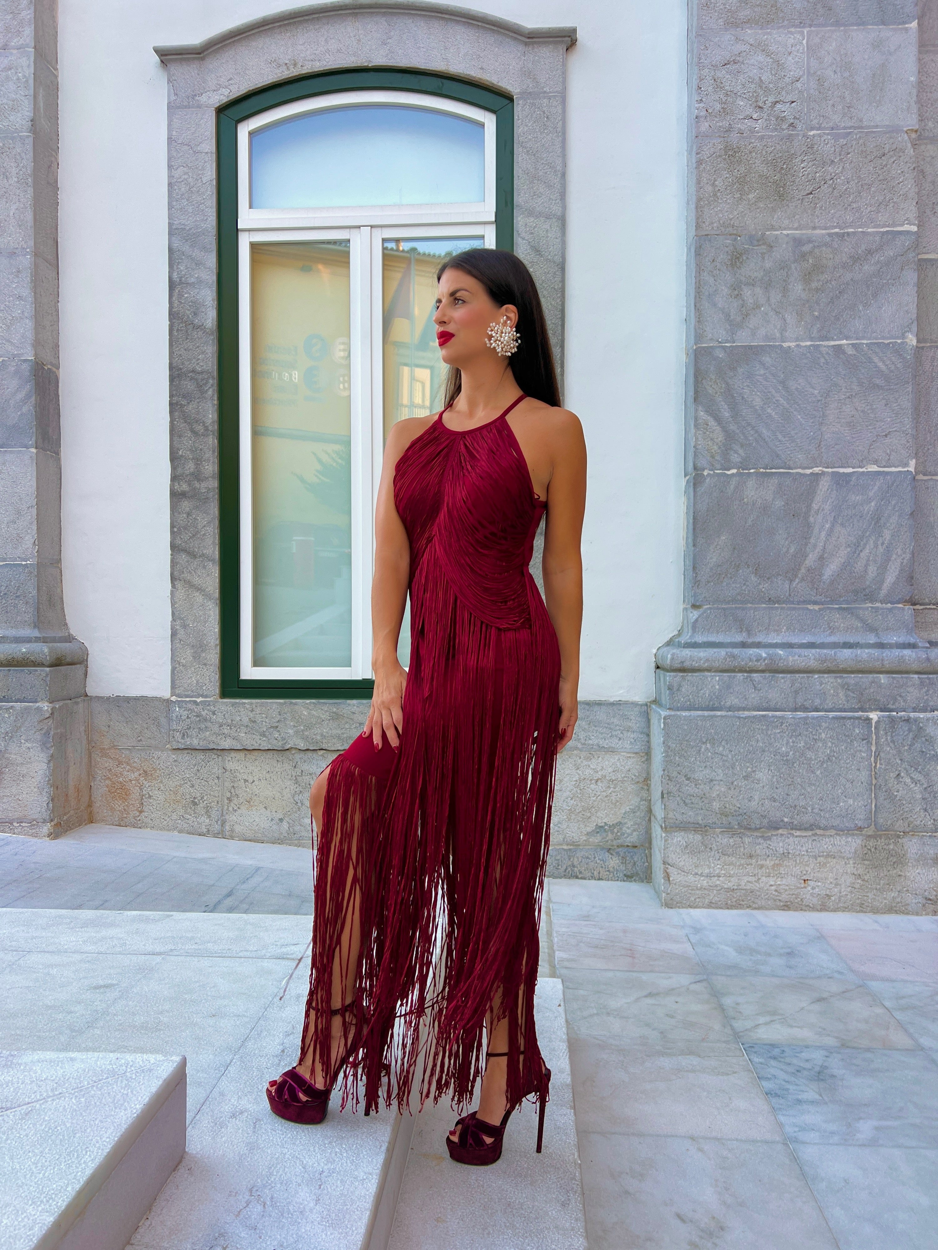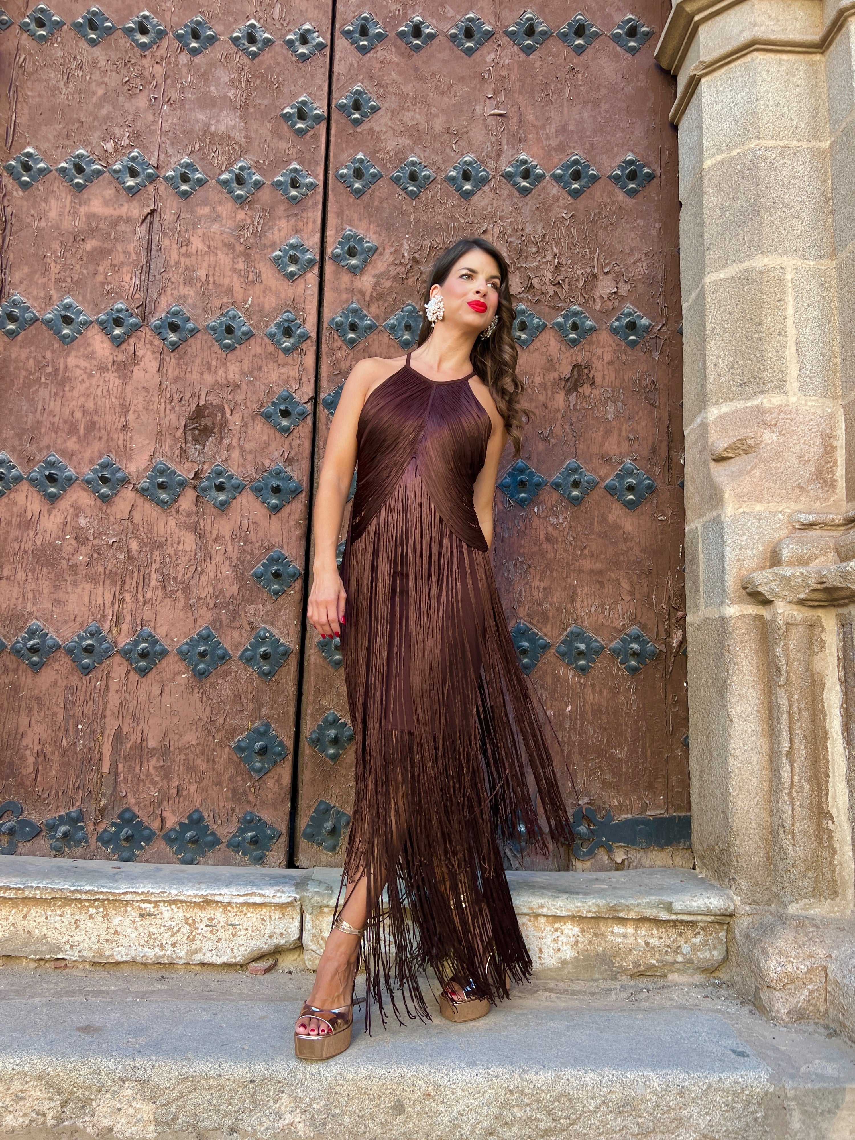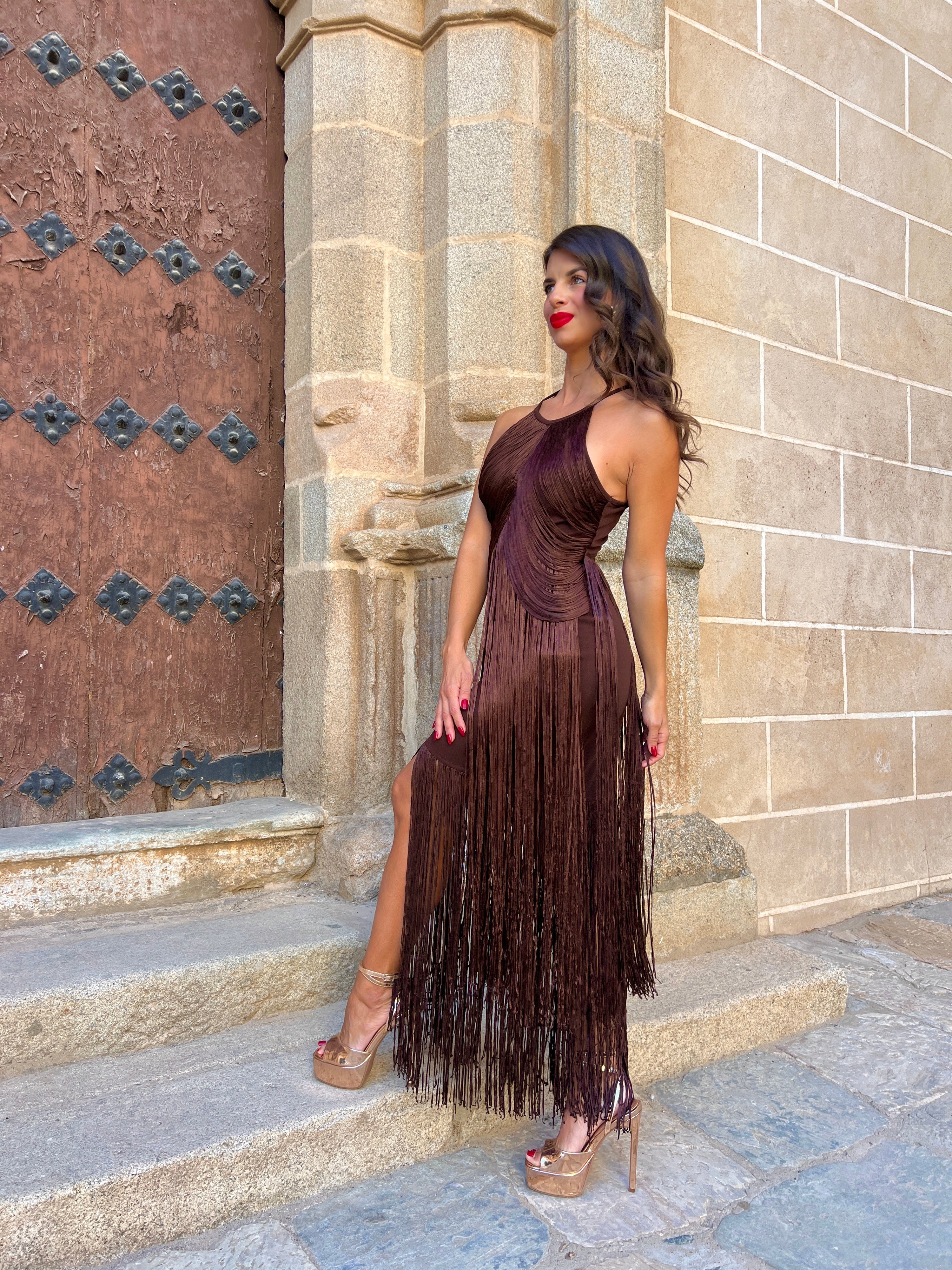 Vestido en tejido elástico con cuello halter cubierto por flecos en caída