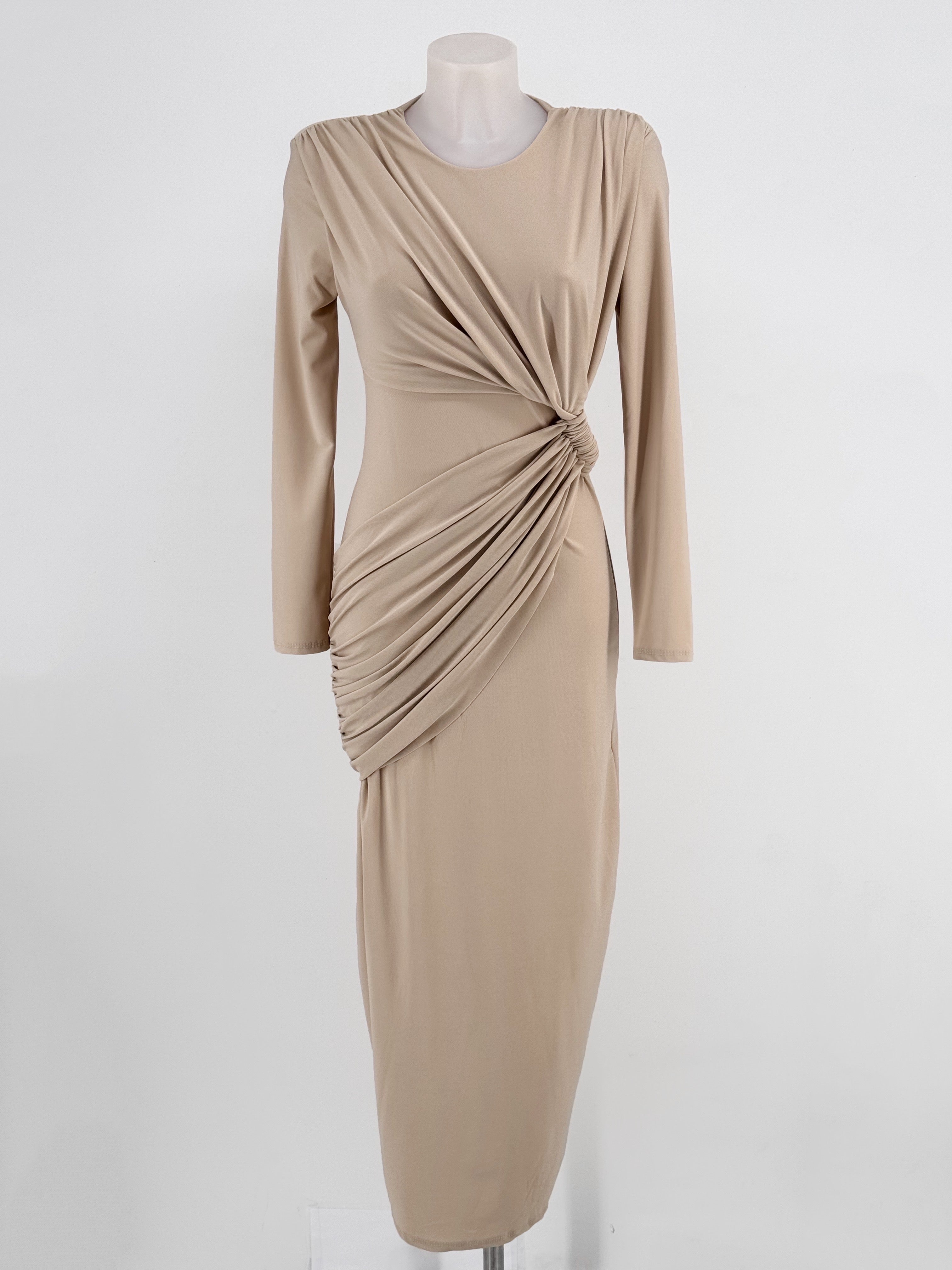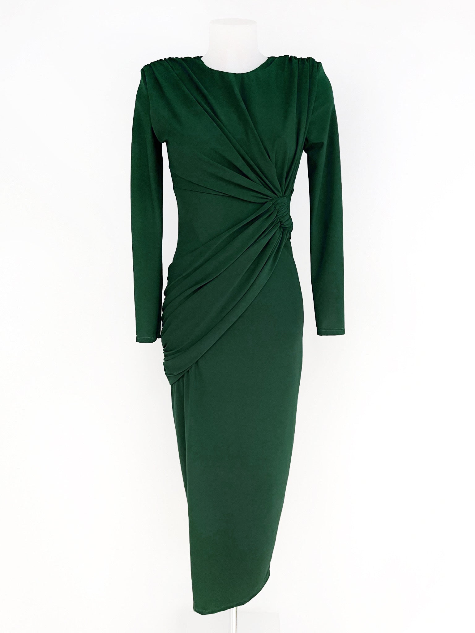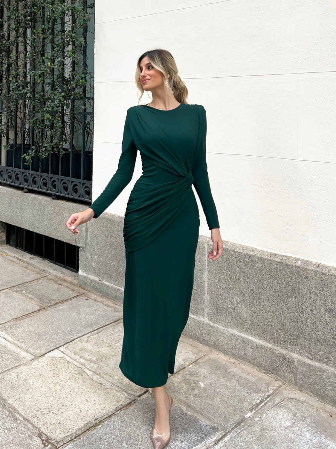 Vestido midi de elastham con drapeado delantero y nudo lateral
