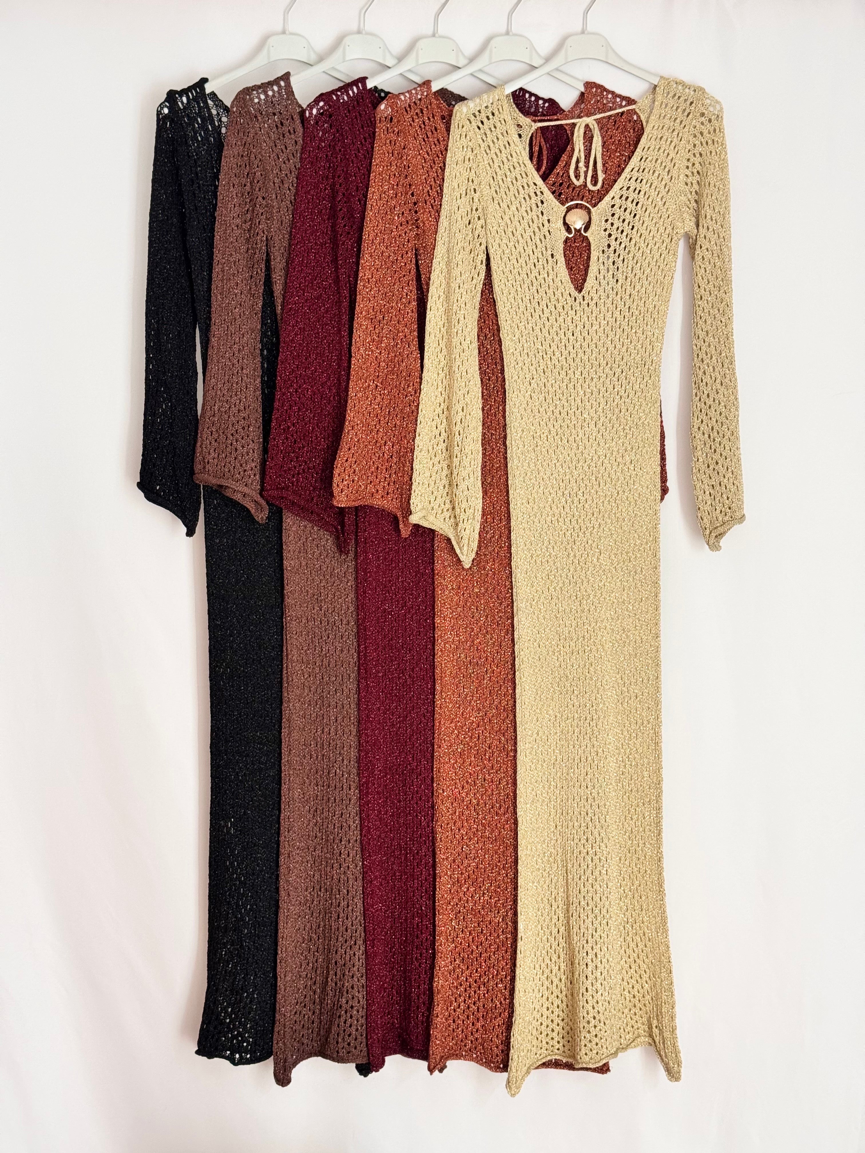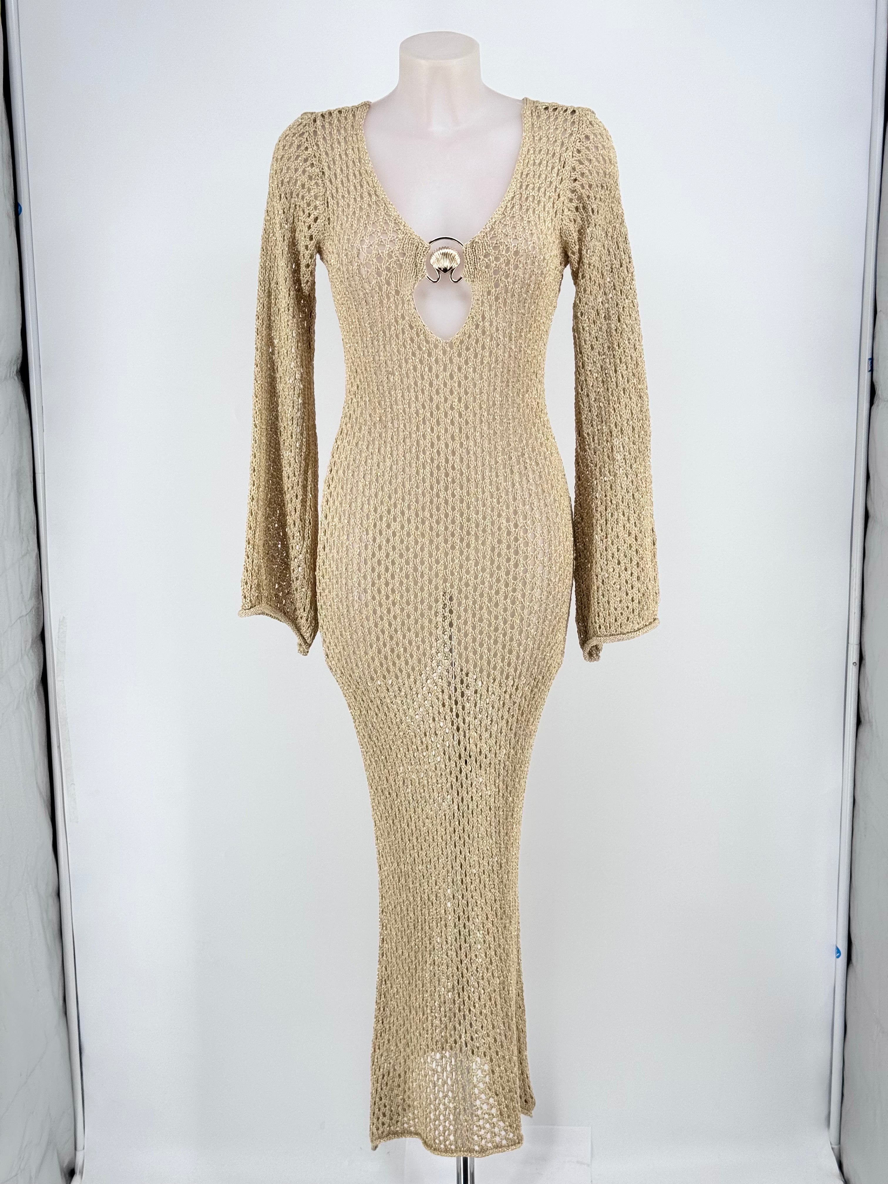 Vestido largo de hilo con detalle de aplique de concha en el pecho y espalda con lazo