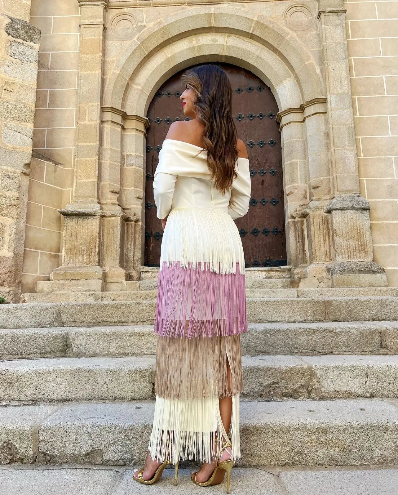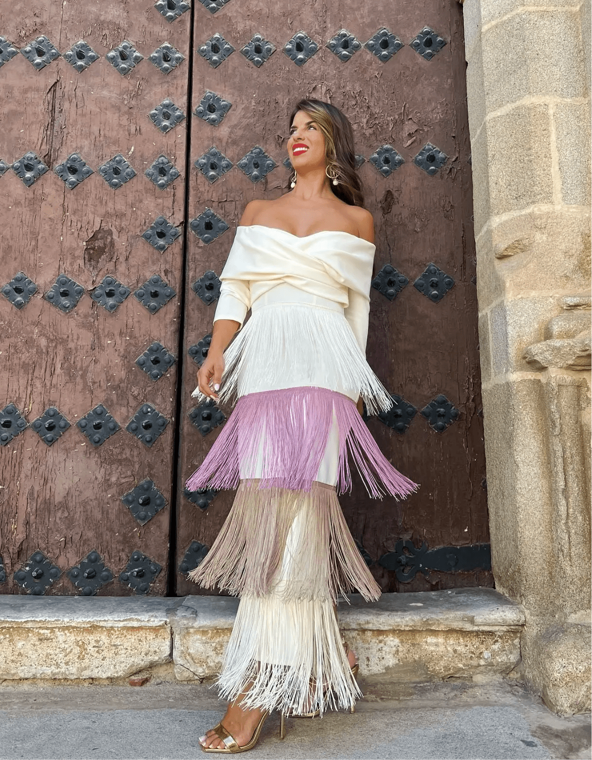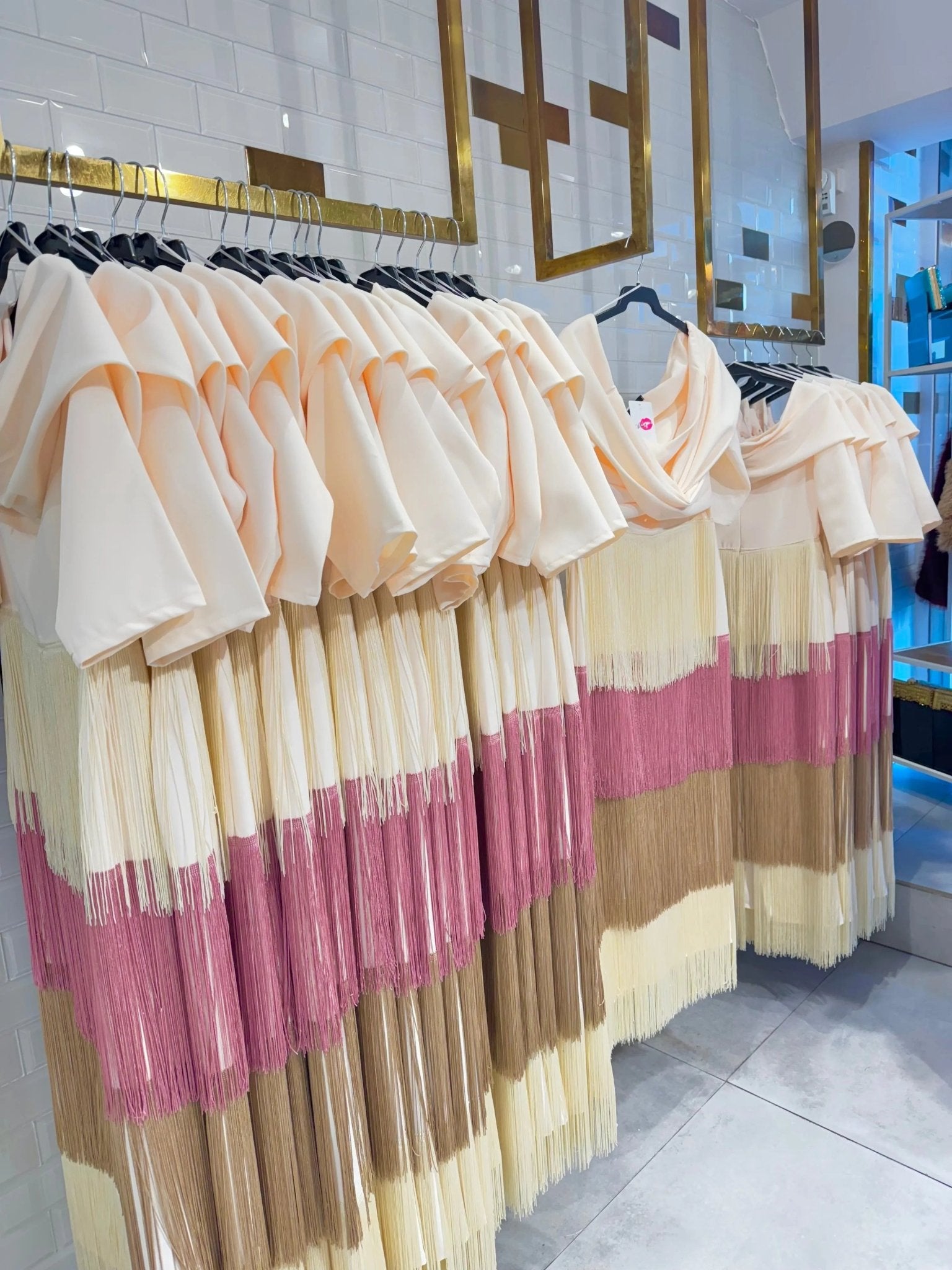 El Vestido Julietta es una pieza única confeccionada en crepe, que destaca por su elegante parte superior con cuello barco. La falda, compuesta por cuatro capas de flecos de seda, presenta una hermosa combinación de tonos rosa empolvado, beige y café, ideal para cualquier ocasión especial.