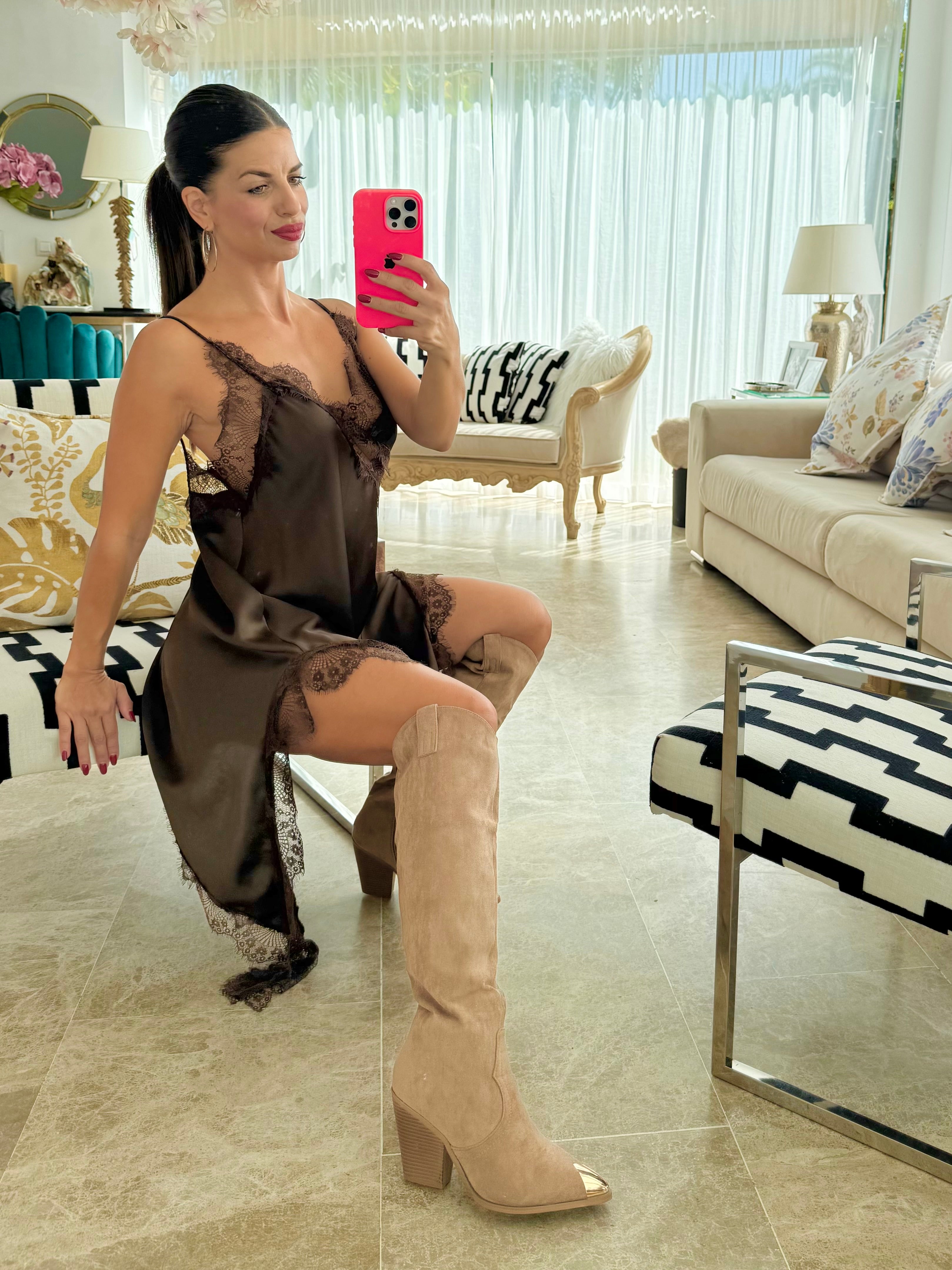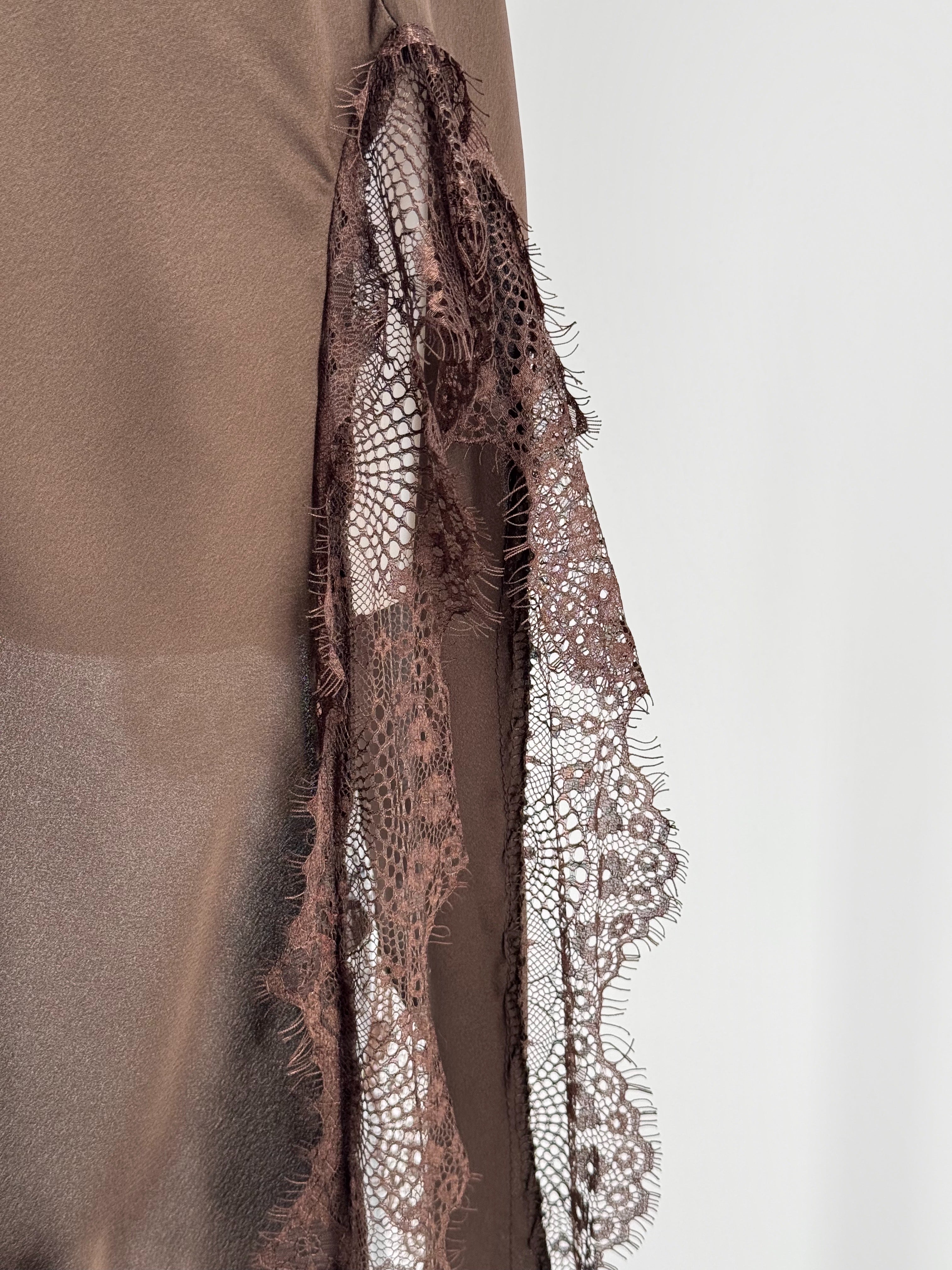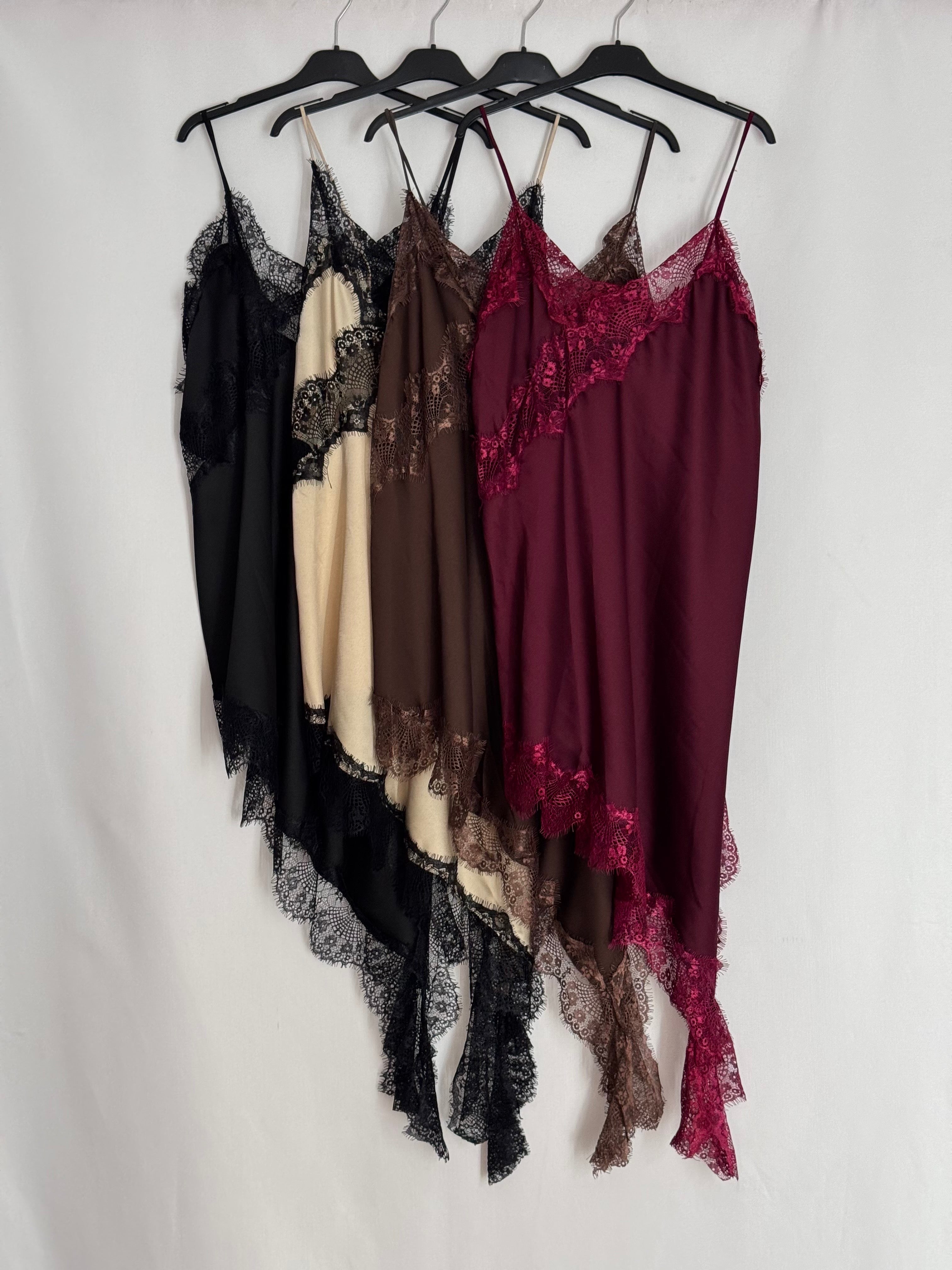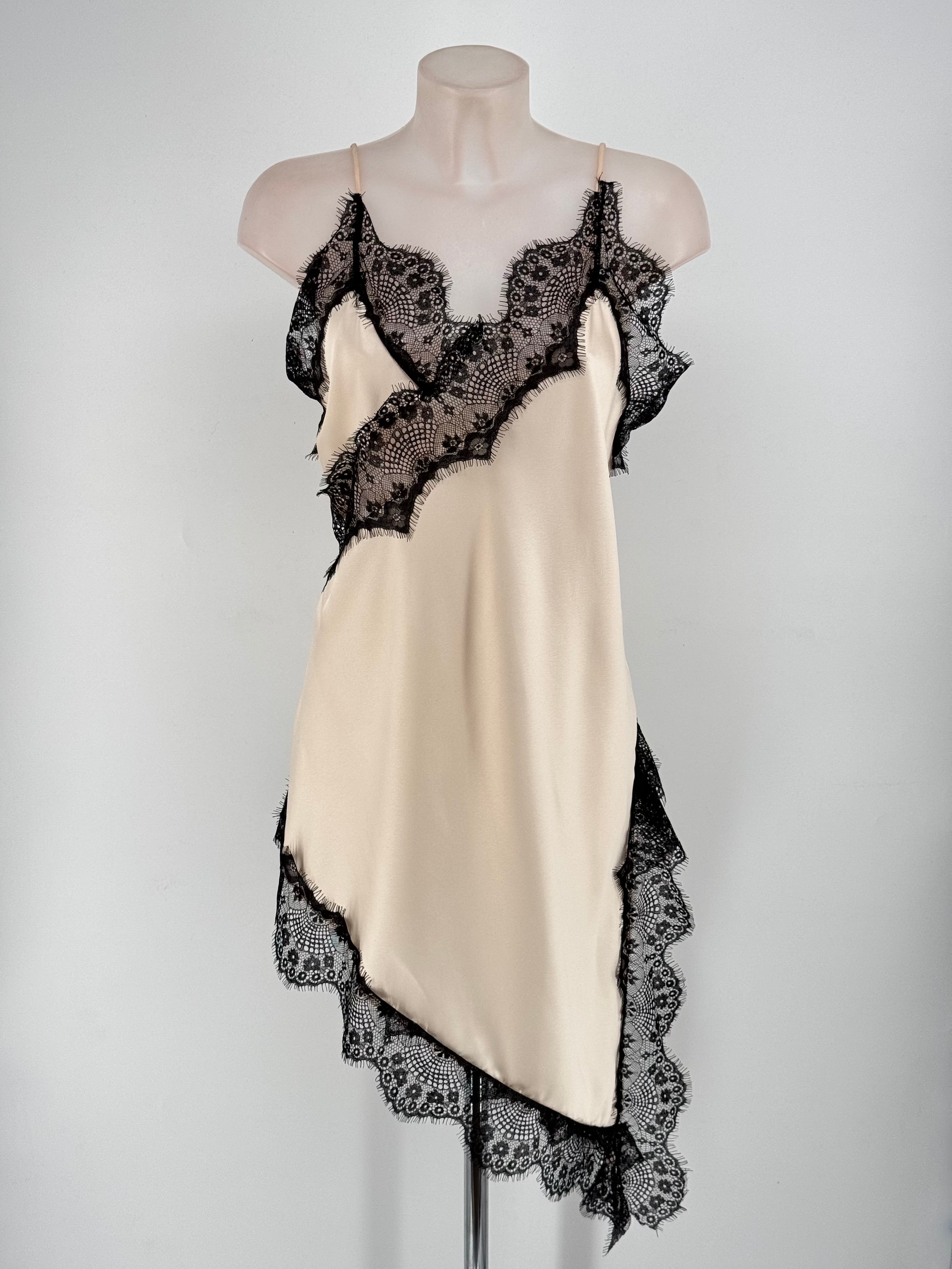 Vestido de satén de raso con detalle de puntilla lencera asimétrica