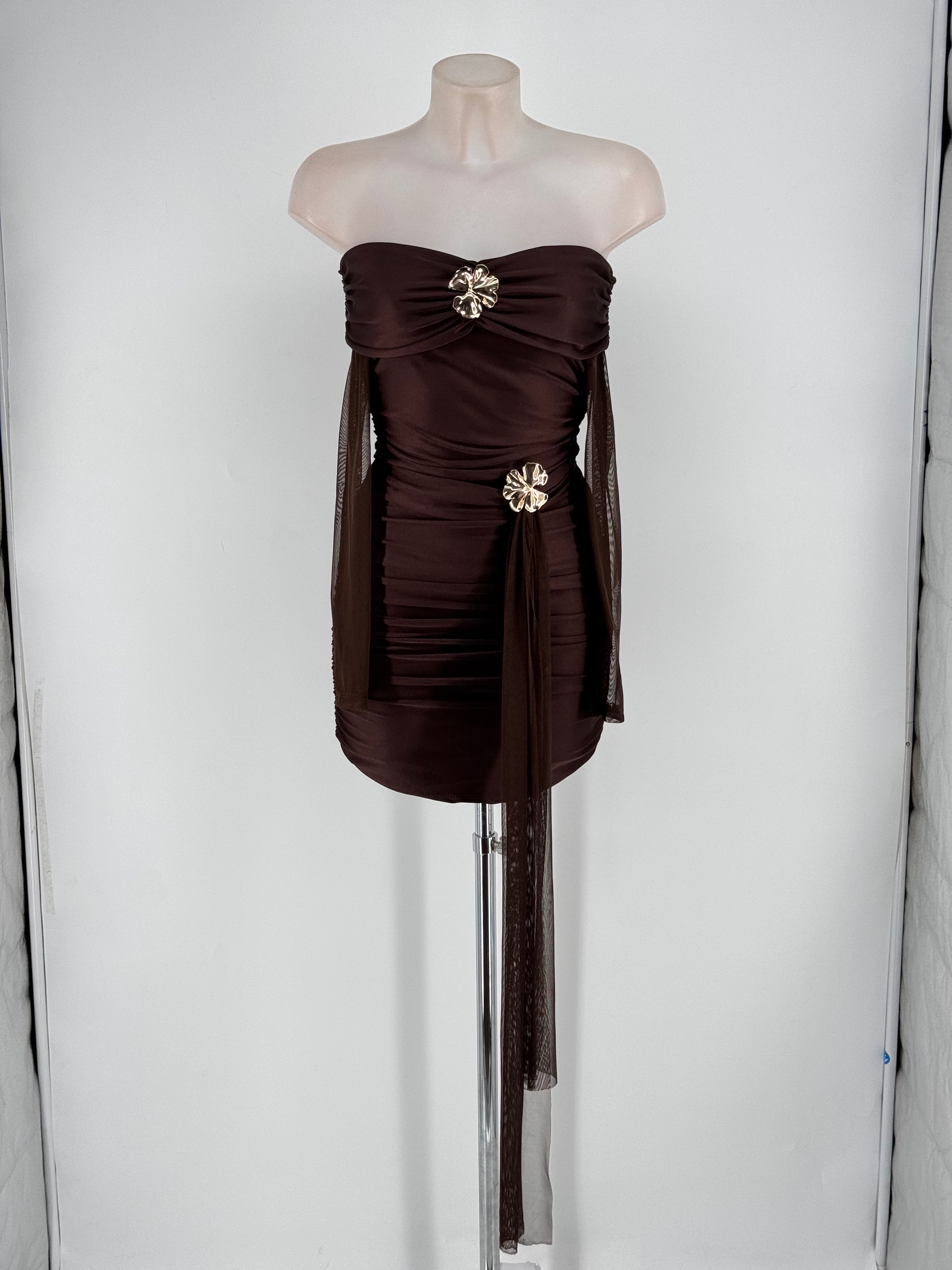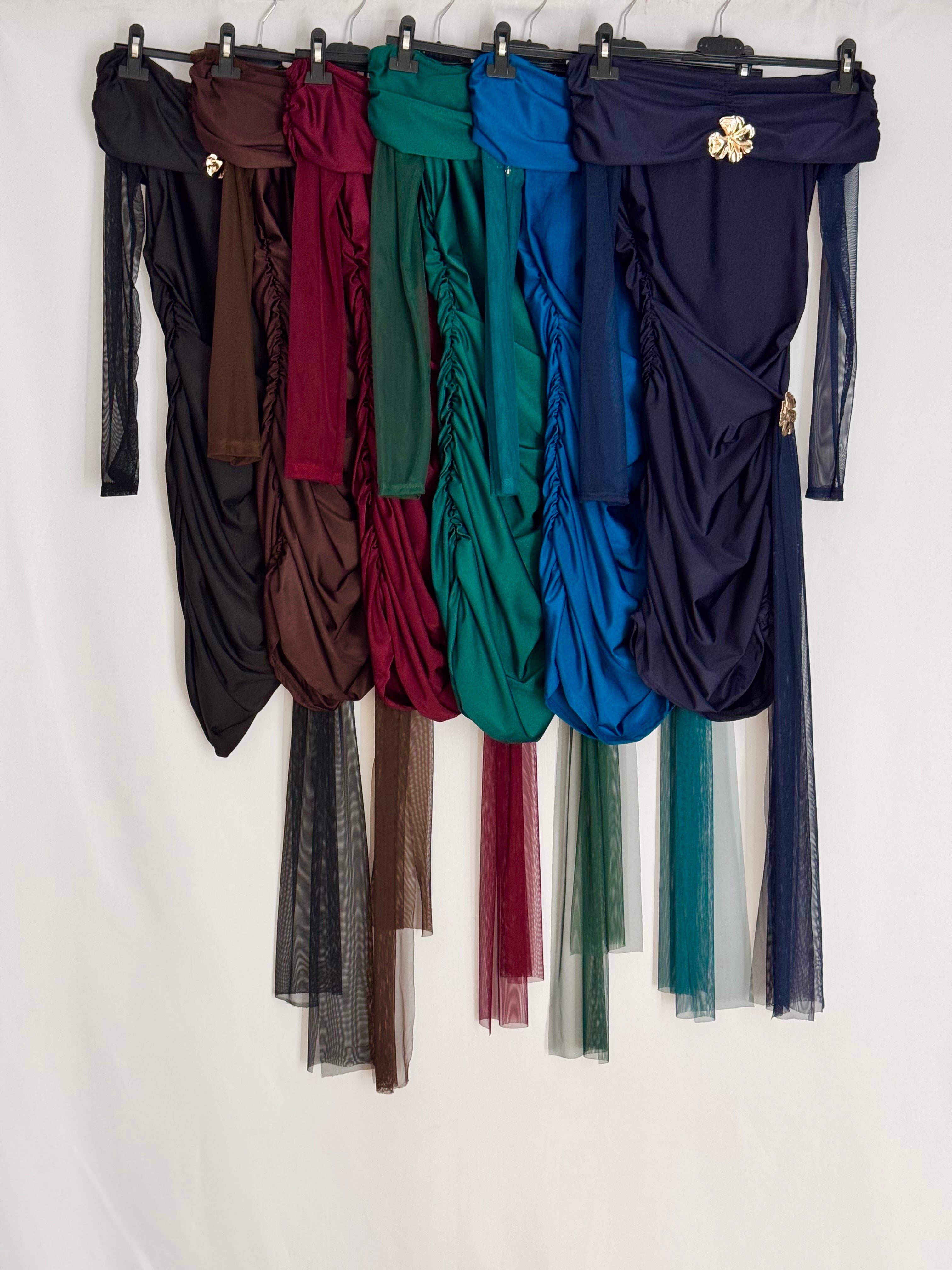 Vestido corto de tul con cuello barco y detalle de caída delantera con apliques dorados