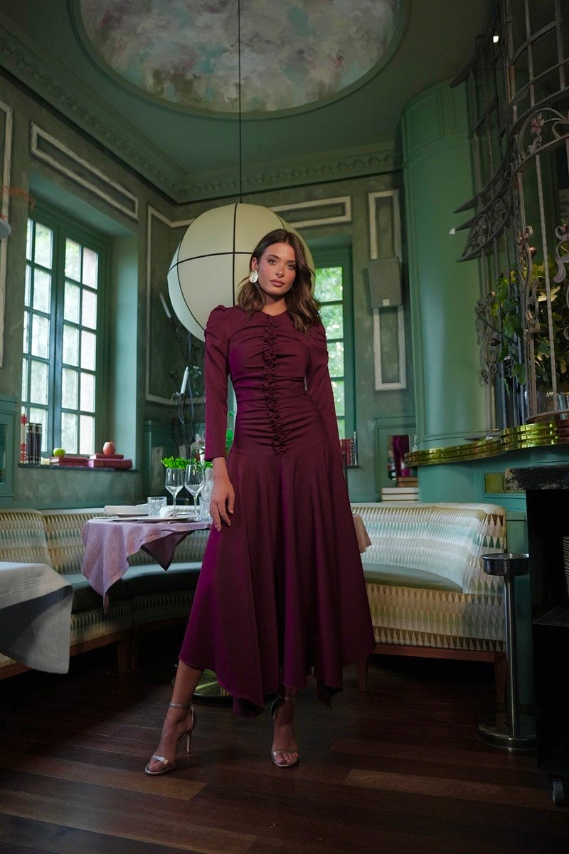 Vestido midi de franela con frunce en el pecho y falda con vuelo