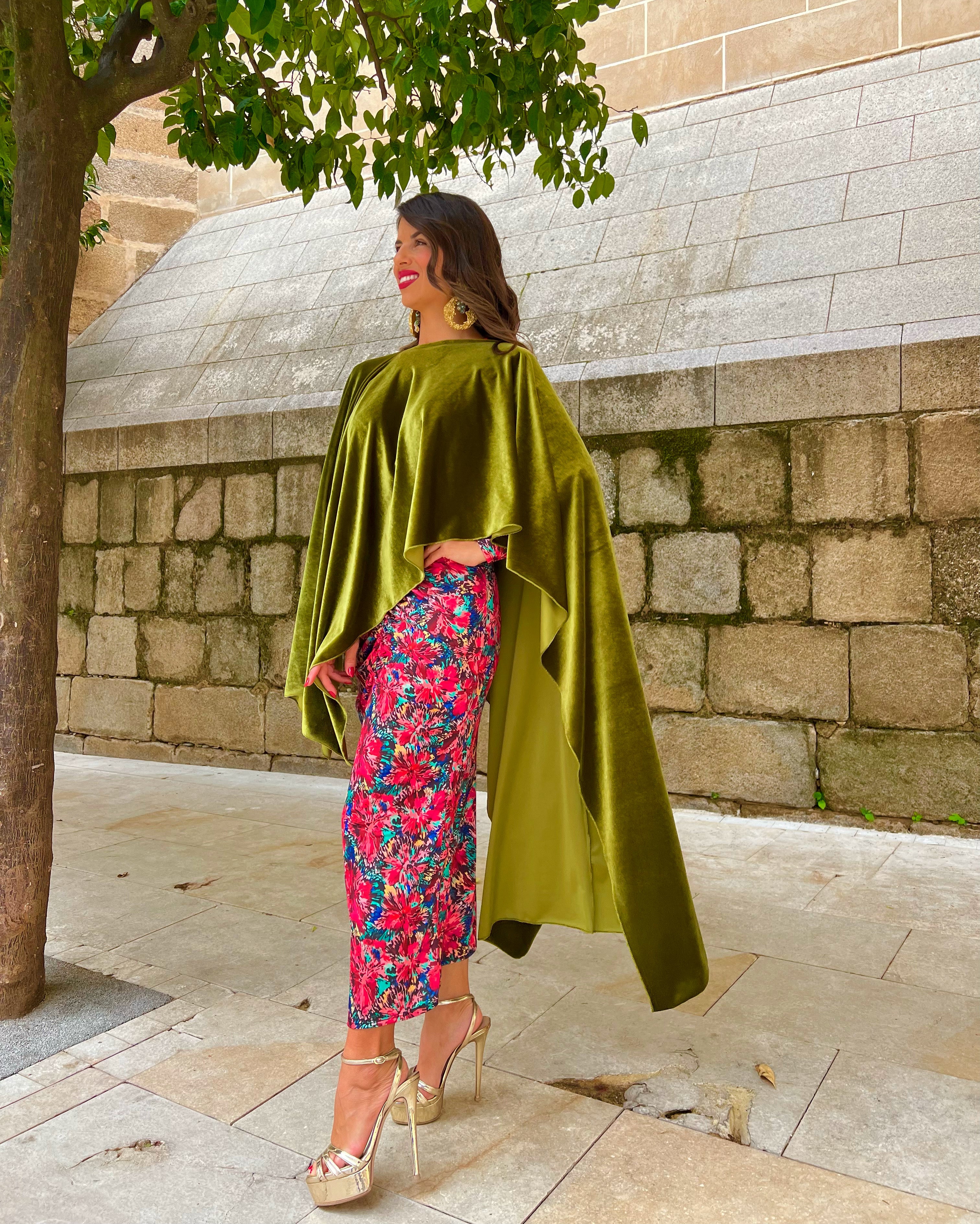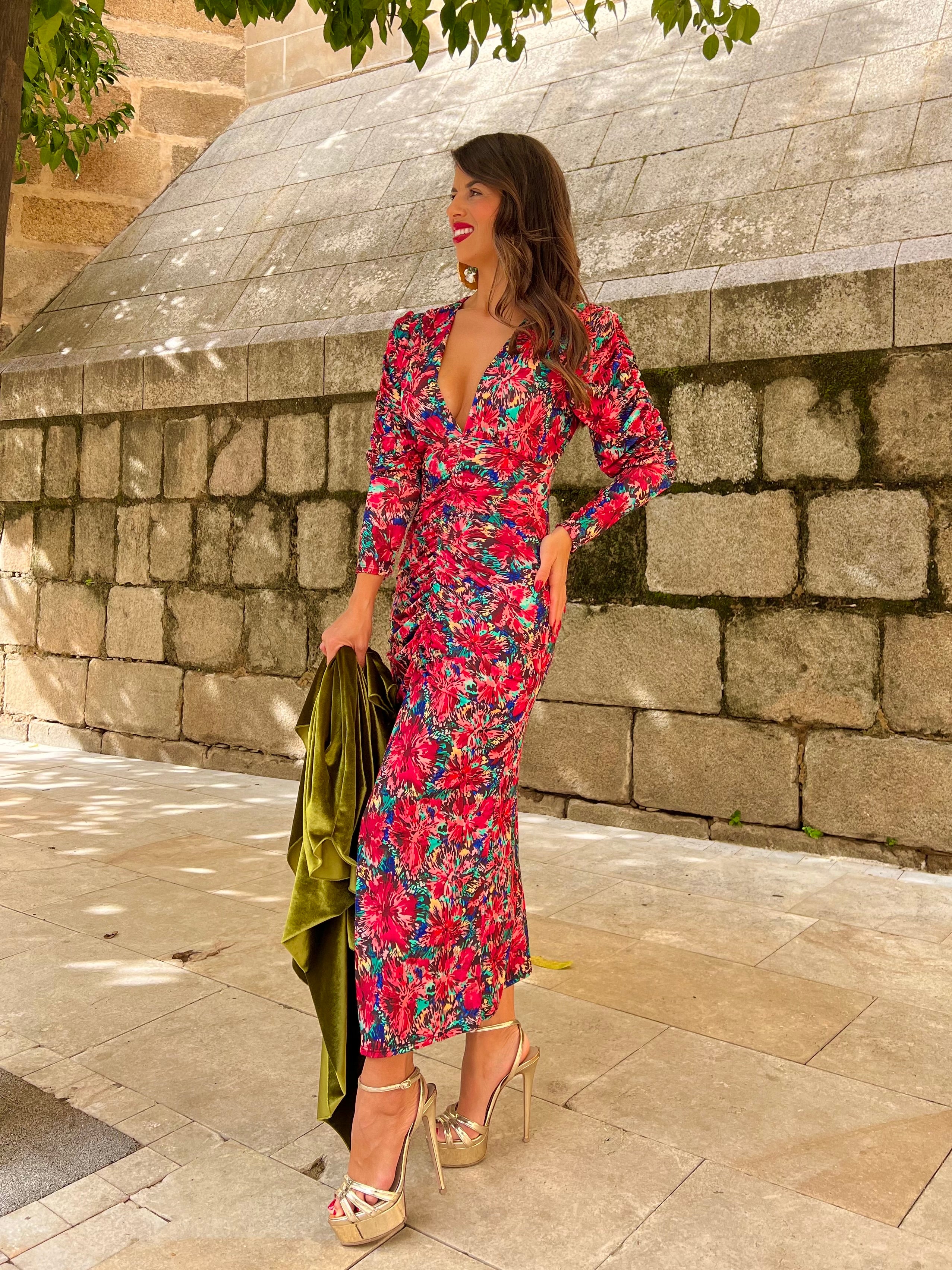 Vestido floral de elastham con escote V y drapeado en la cintura