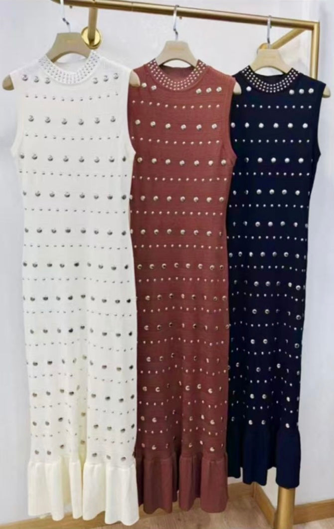 Vestido de punto con tachuelas y detalle de volante en el bajo