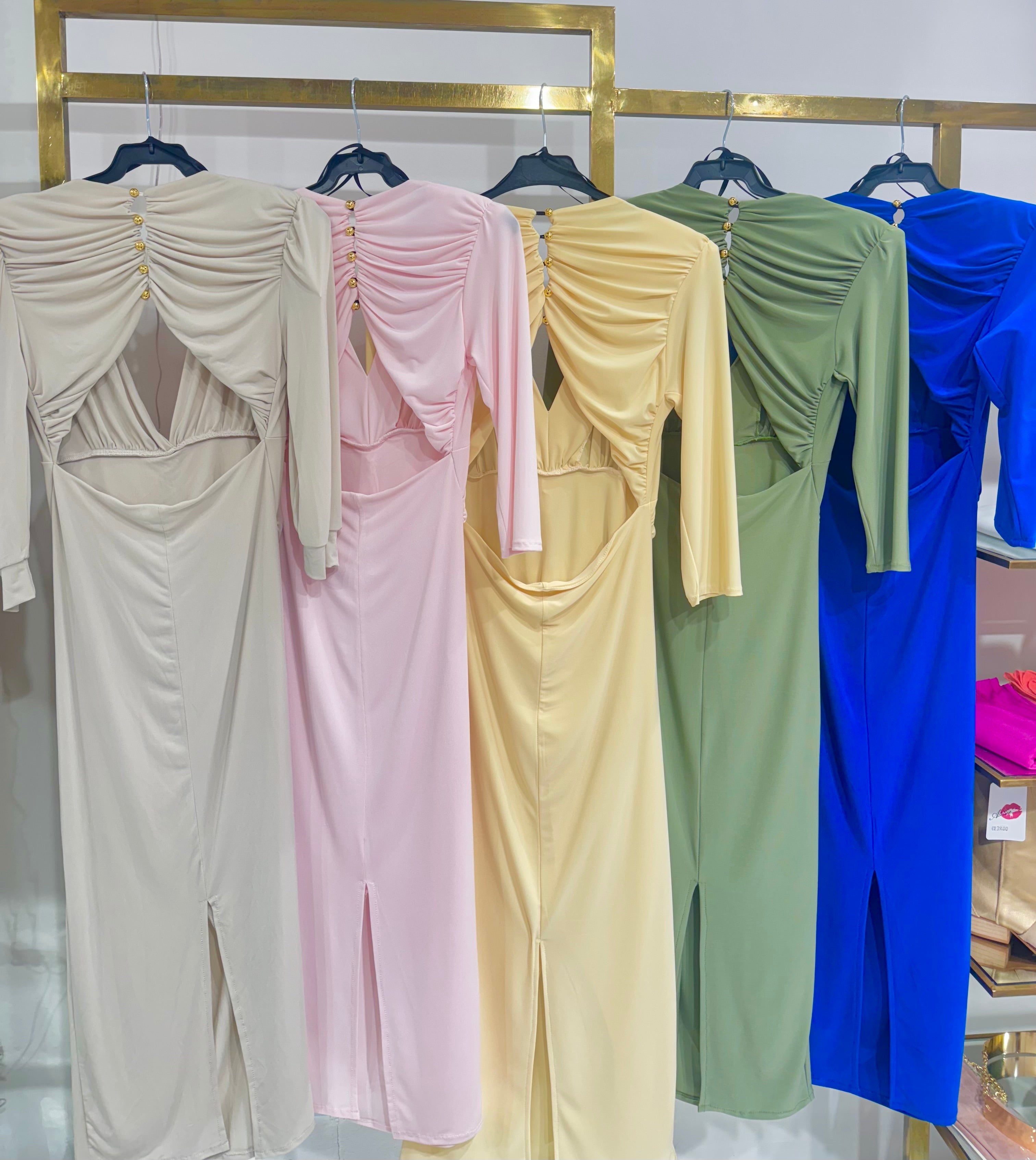 Descubre el encantador Vestido Toscana Beige, una pieza imprescindible para tu guardarropa. Este vestido de crepe destaca por su elegante diseño con espalda al aire y una sofisticada botonadura dorada.