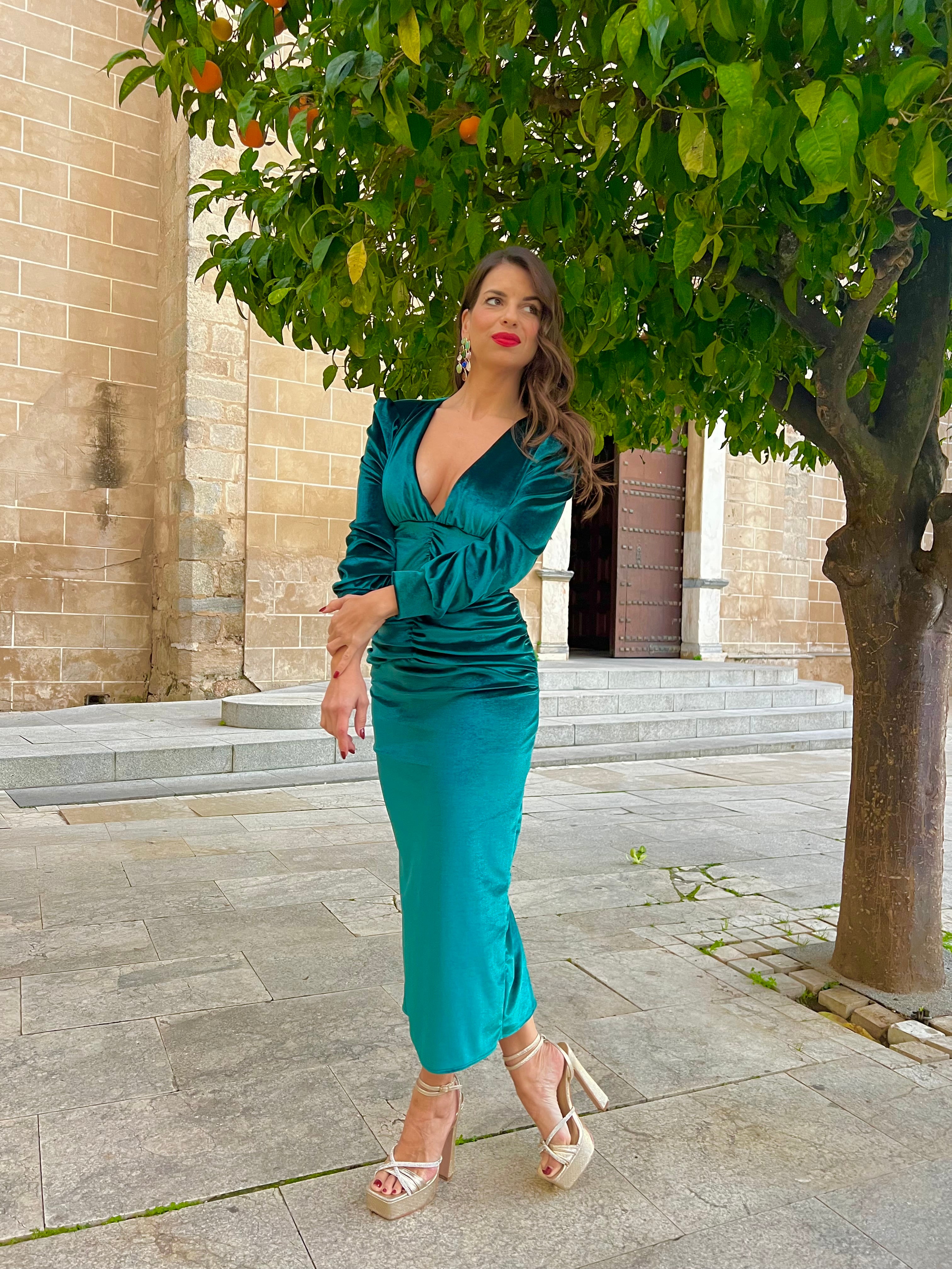 Vestido de terciopelo con drapeado en la cintura, espalda al aire y botonadura dorada