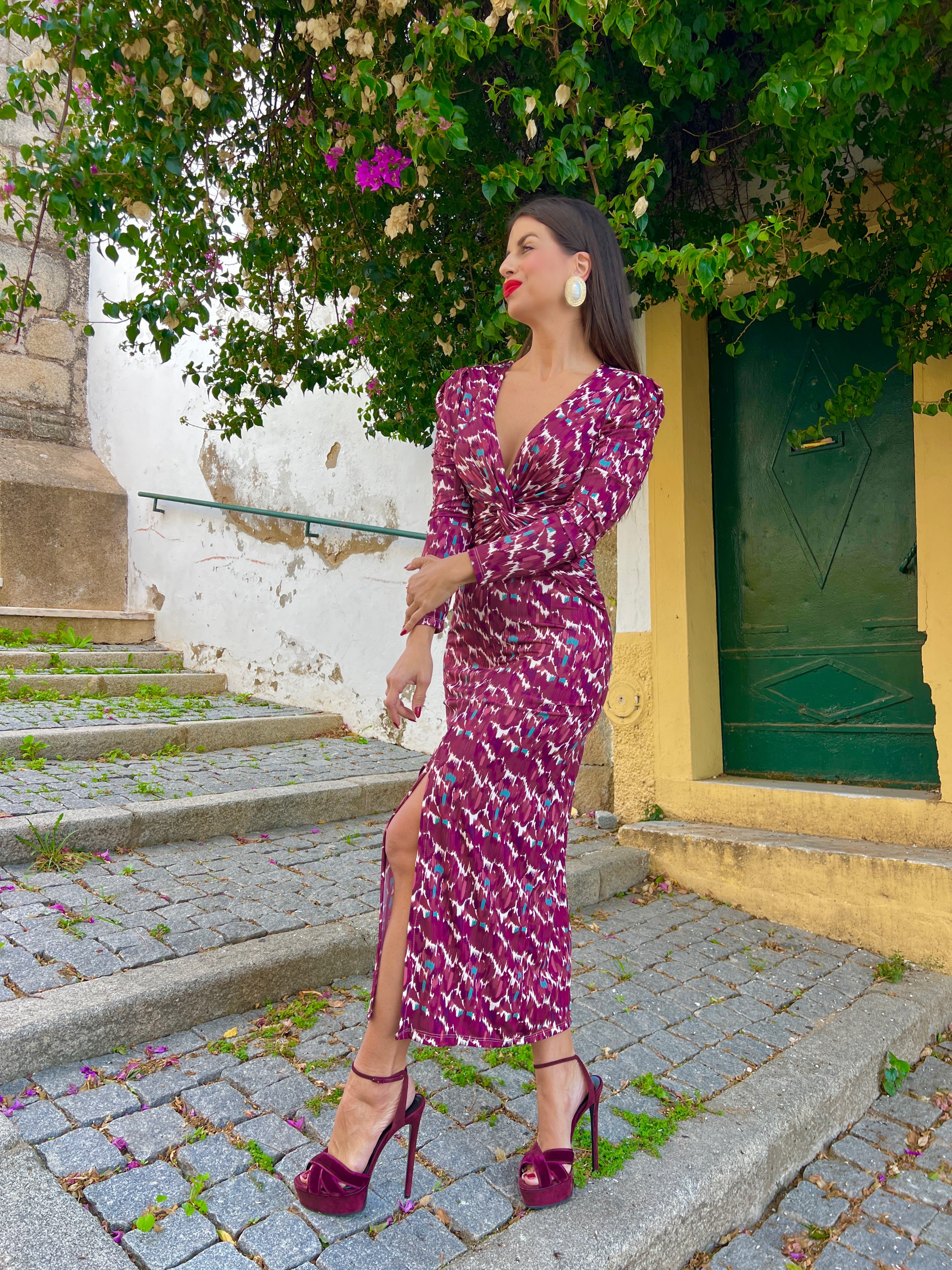 Vestido de elastham estampado con escote V y nudo central en el pecho