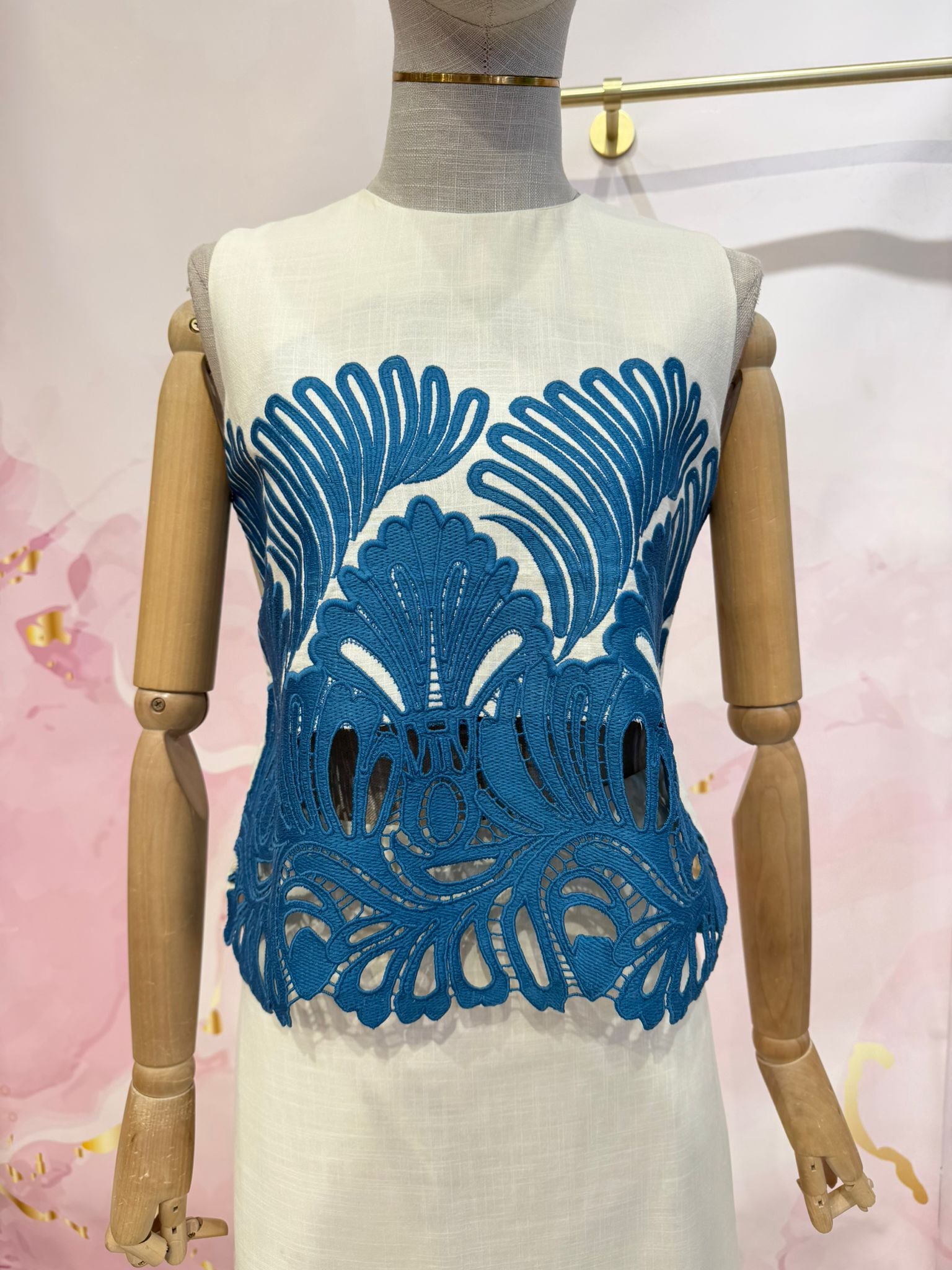 Conjunto de Batista blanca con detalles calados en azul jeans formado por falda midi y blusa en sisa