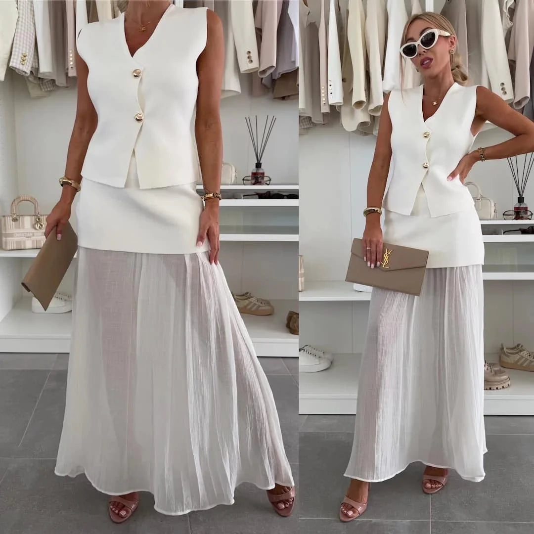 Conjunto de chaleco abotonado y falda de punto con bajo de gasa plisada