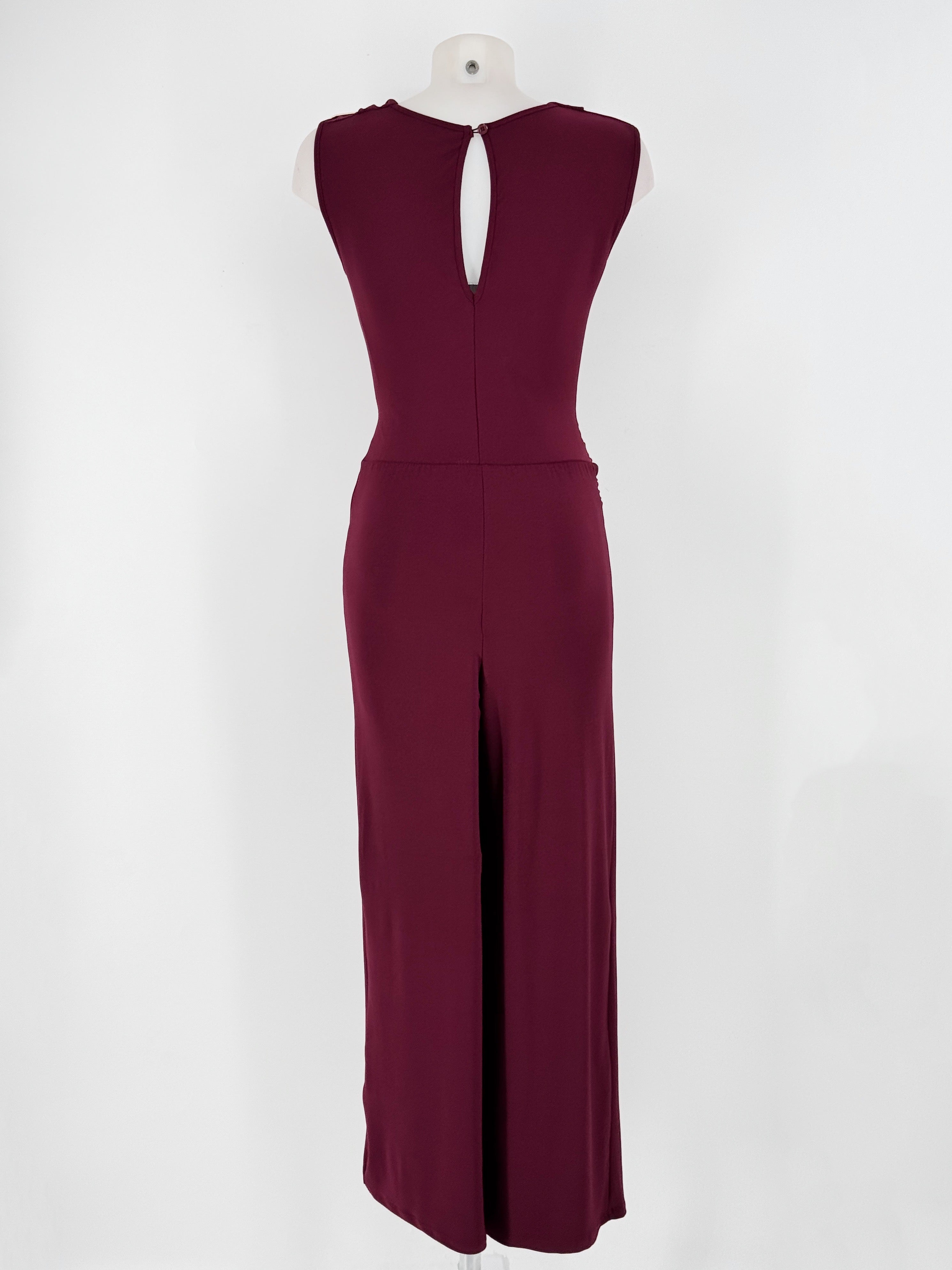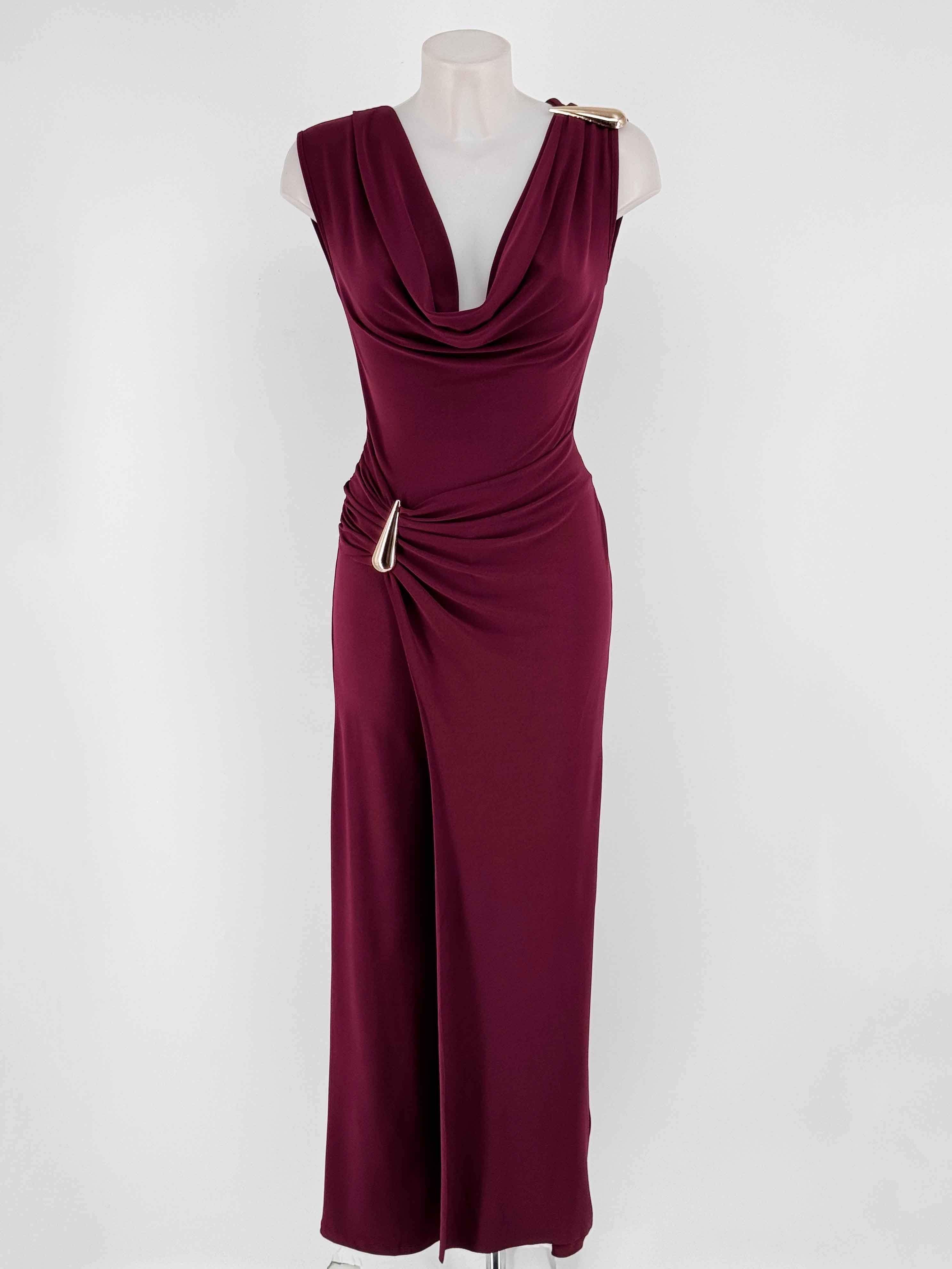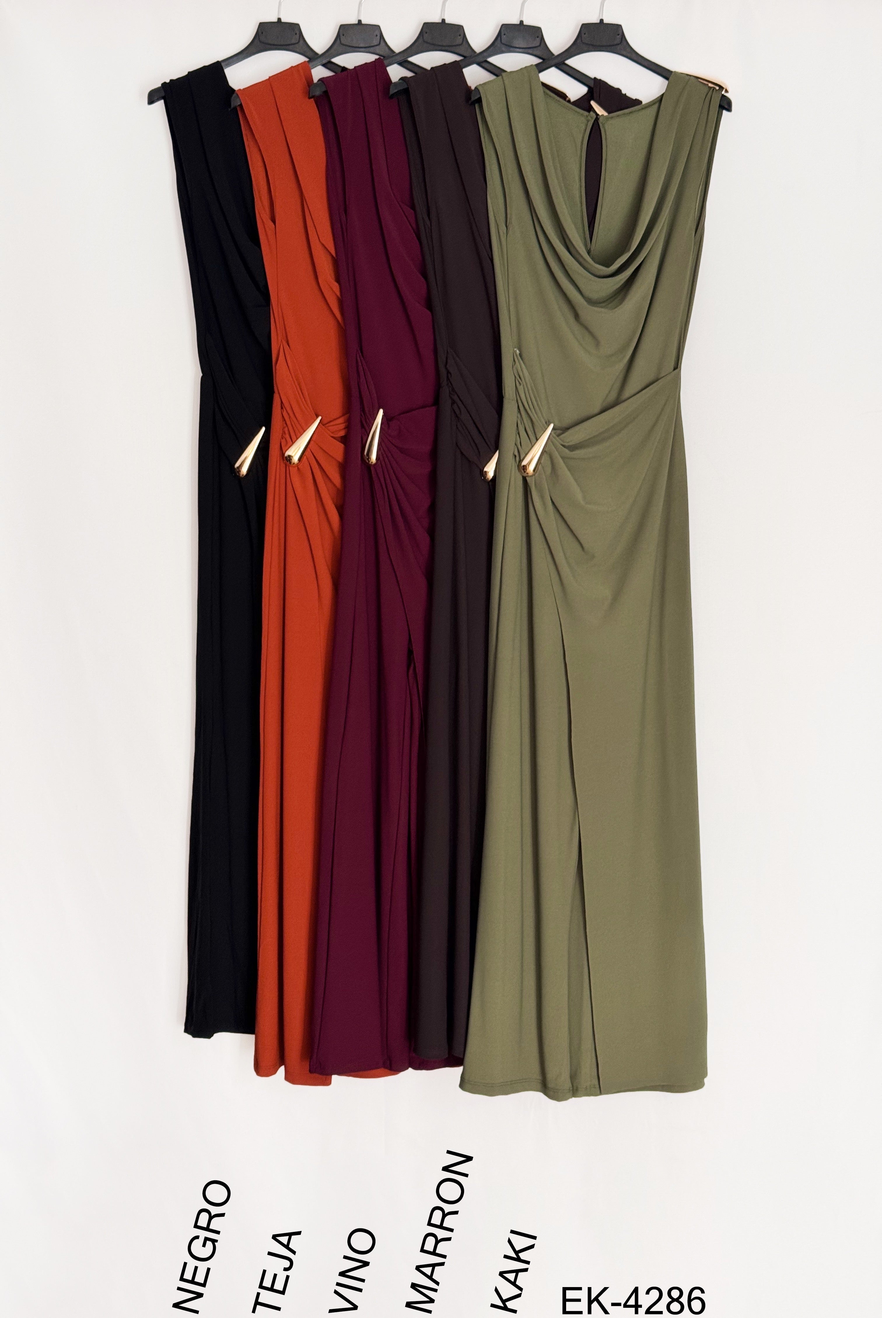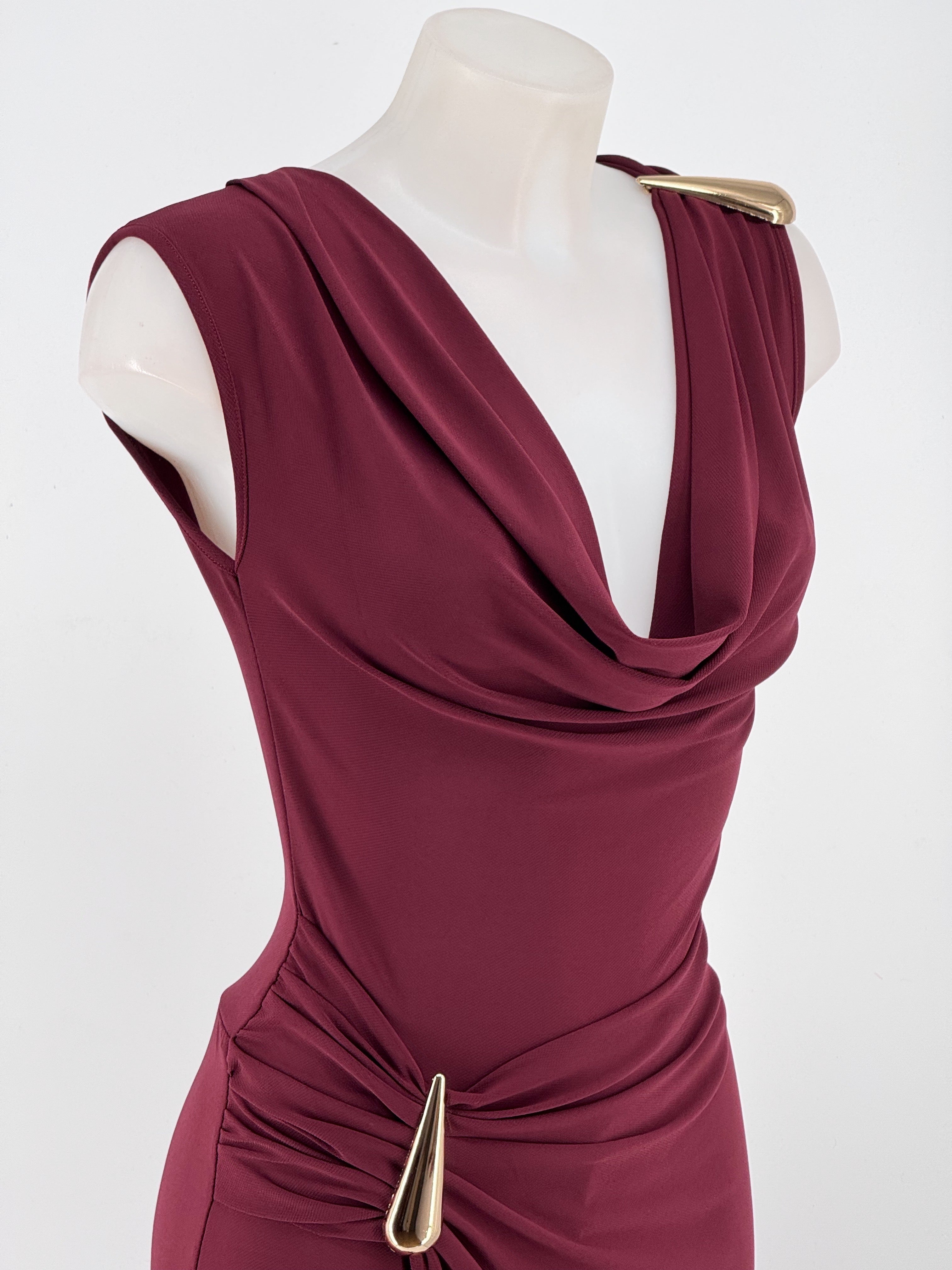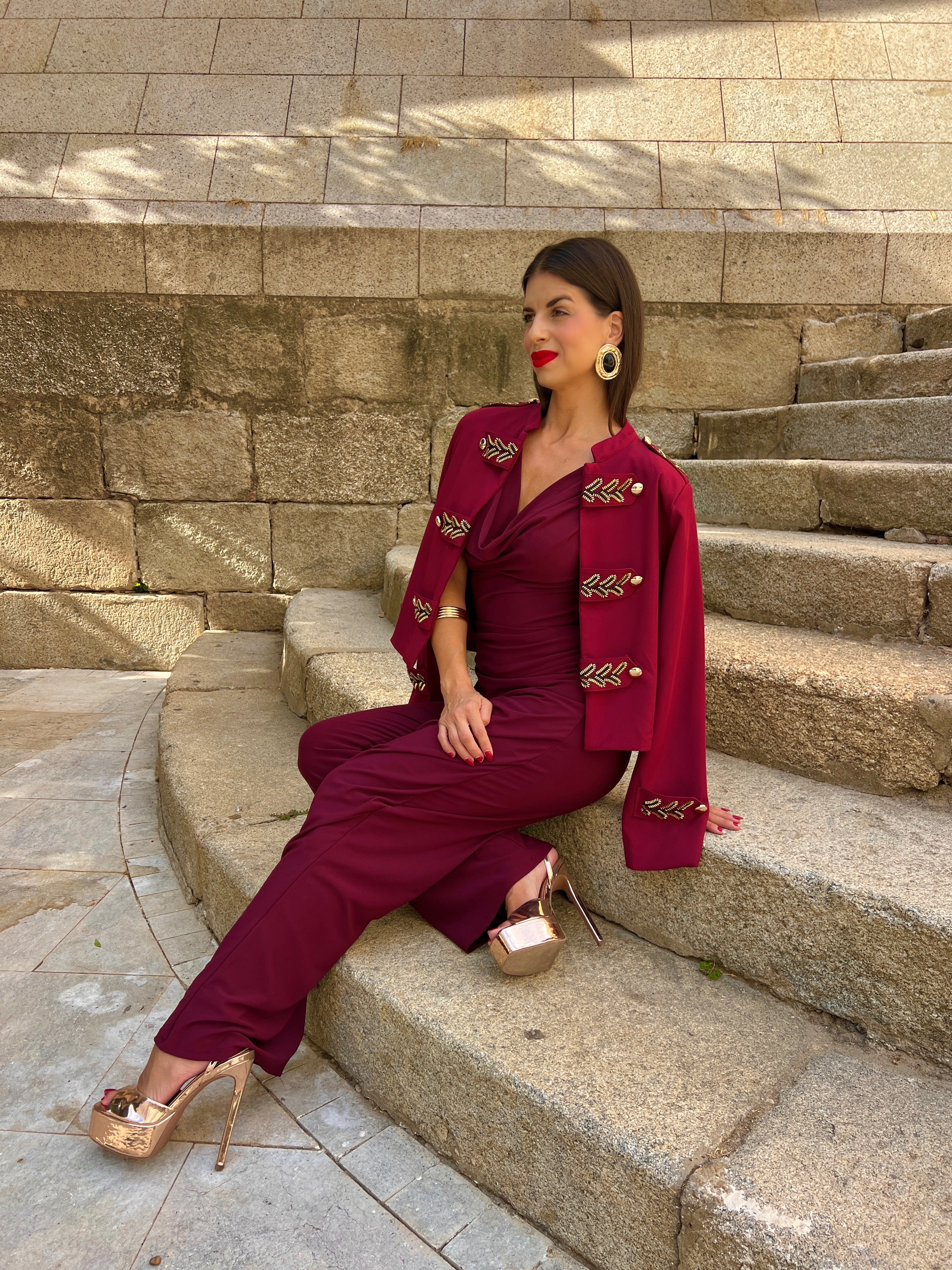 Mono de elastham con cuello caído y detalles de apliques dorados en hombro y cintura