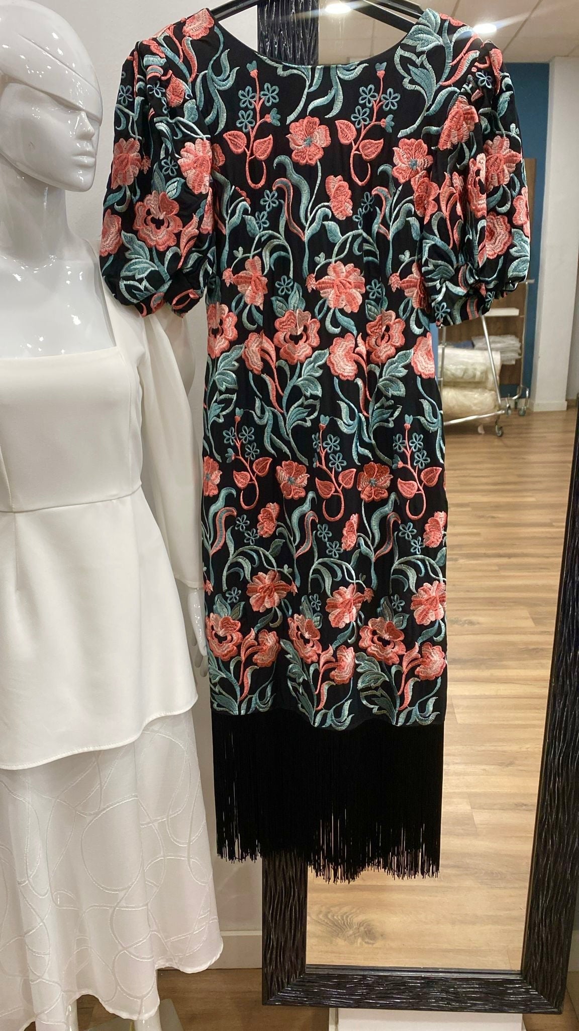Los flecos de seda en el bajo añaden un toque de sofisticación y movimiento, haciendo que cada paso sea un deleite visual. Es importante tener en cuenta que el tejido no tiene elasticidad, por lo que se recomienda elegir una talla más de la habitual para un ajuste perfecto.