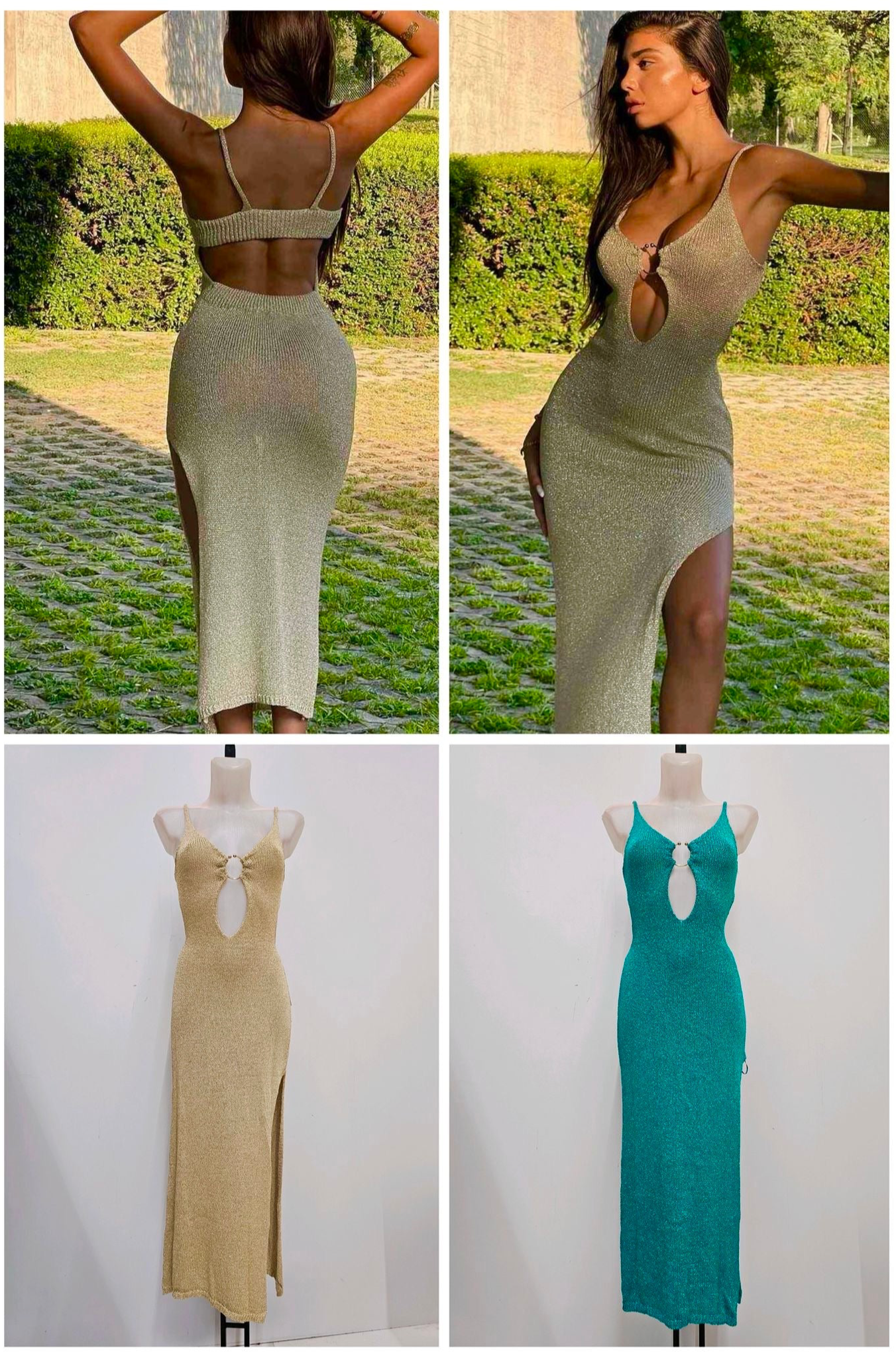 Vestido de fio brilhante, costas abertas e decote profundo com argola central