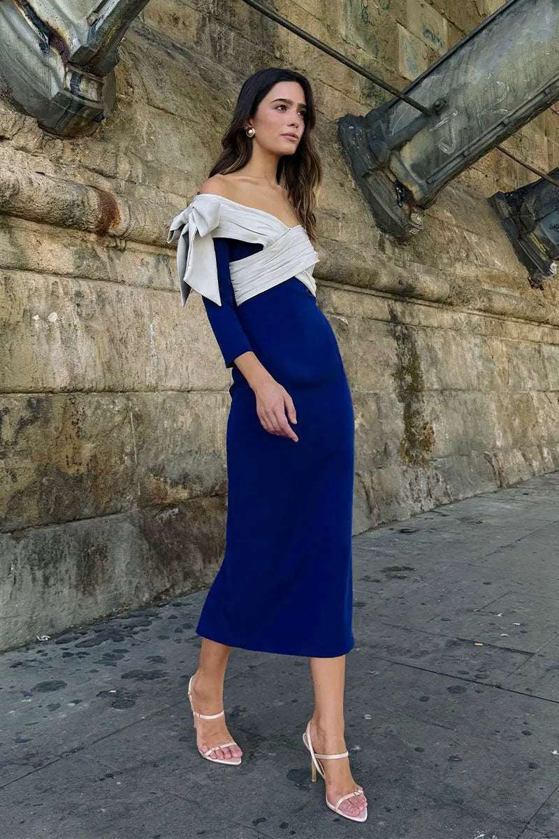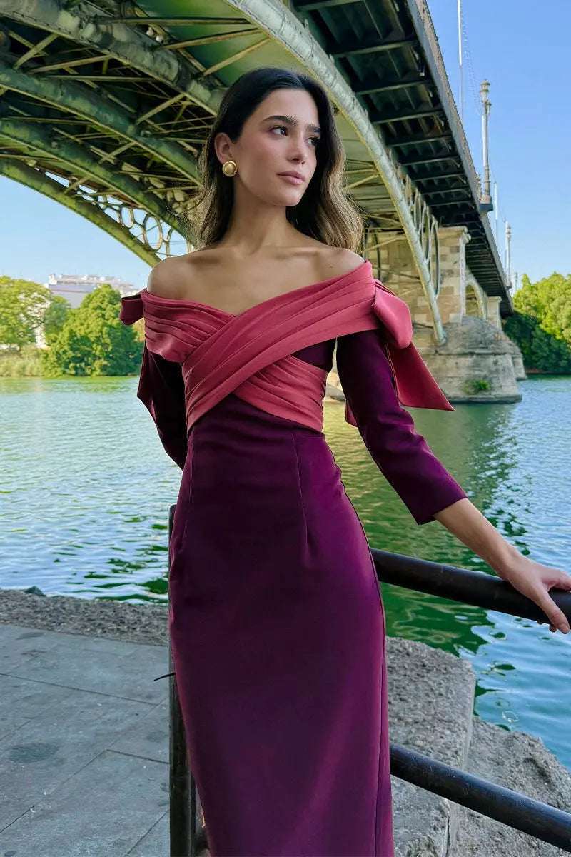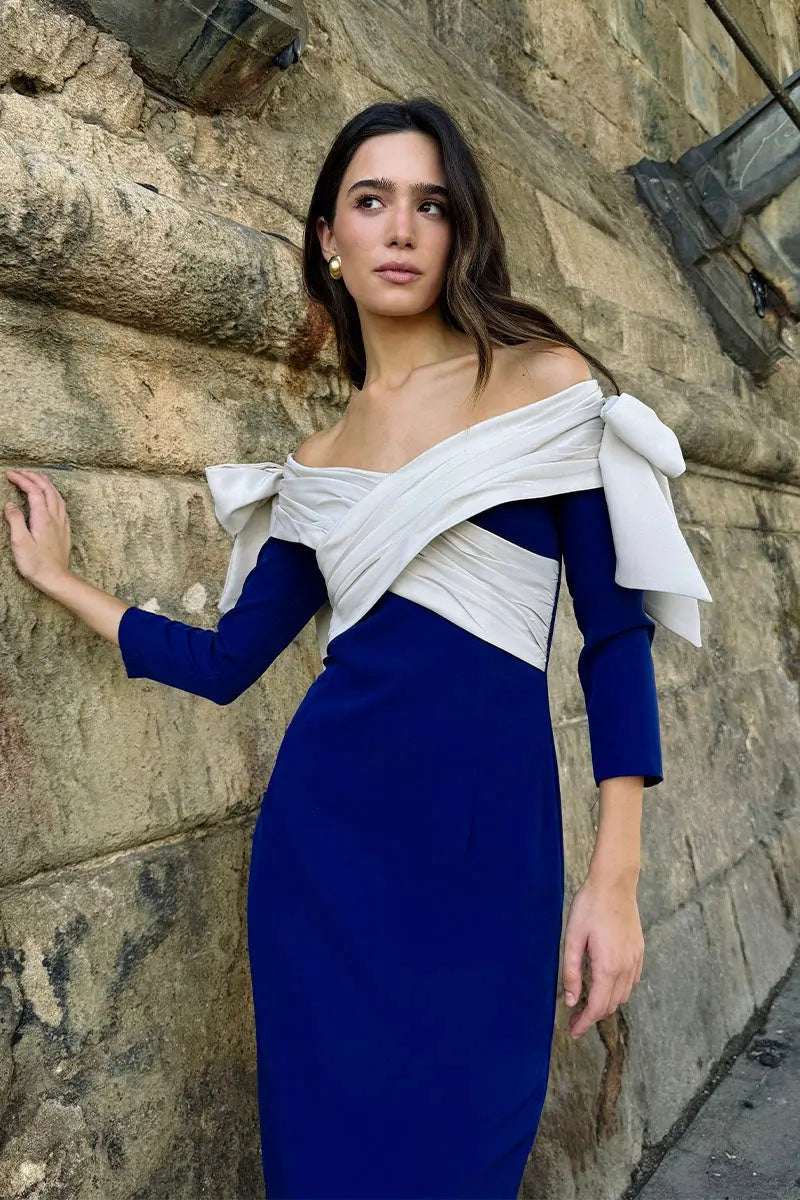 Descubre el Vestido Lady Bicolor, una prenda elegante y versátil que se adapta a diversas ocasiones. Su diseño de crepe con cuello barco cruzado realza la figura, mientras que los lazos en los hombros añaden un toque femenino y sofisticado.