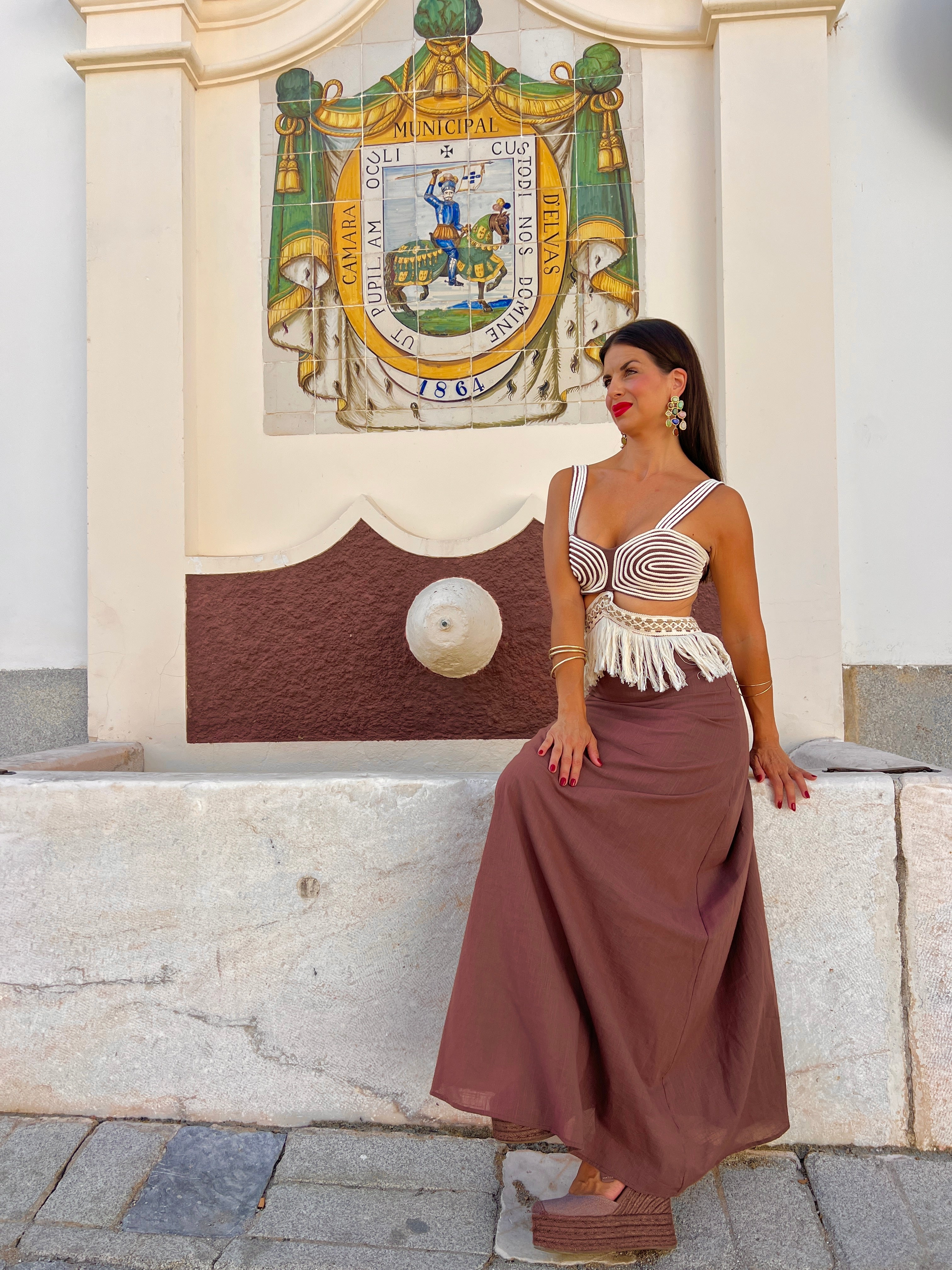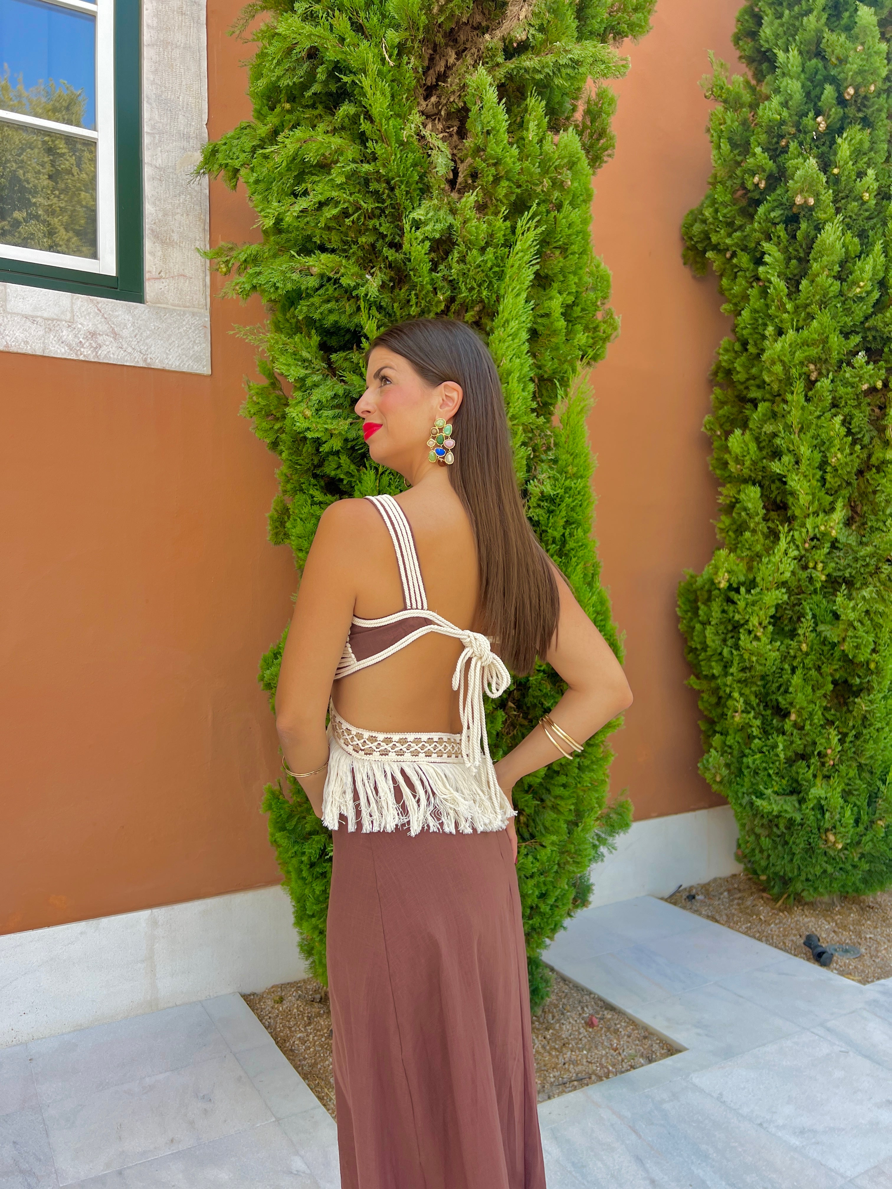 Vestido de lino con corte cutout, detalles de hilo en pecho y flecos en la cintura