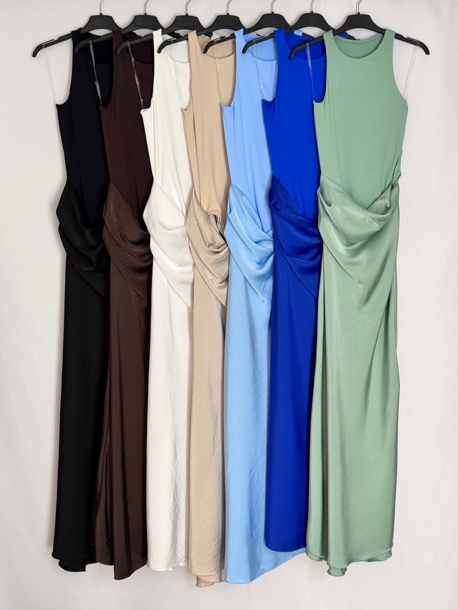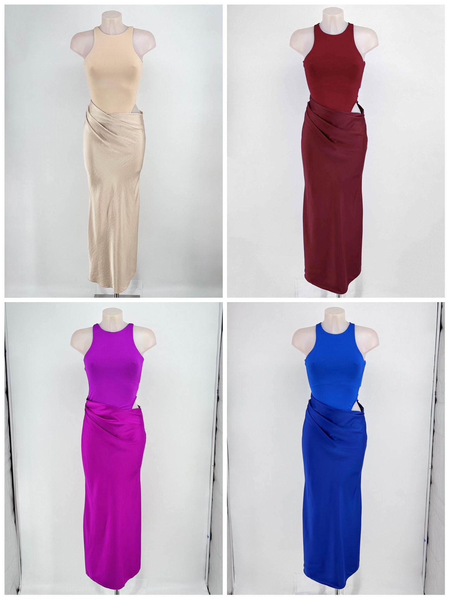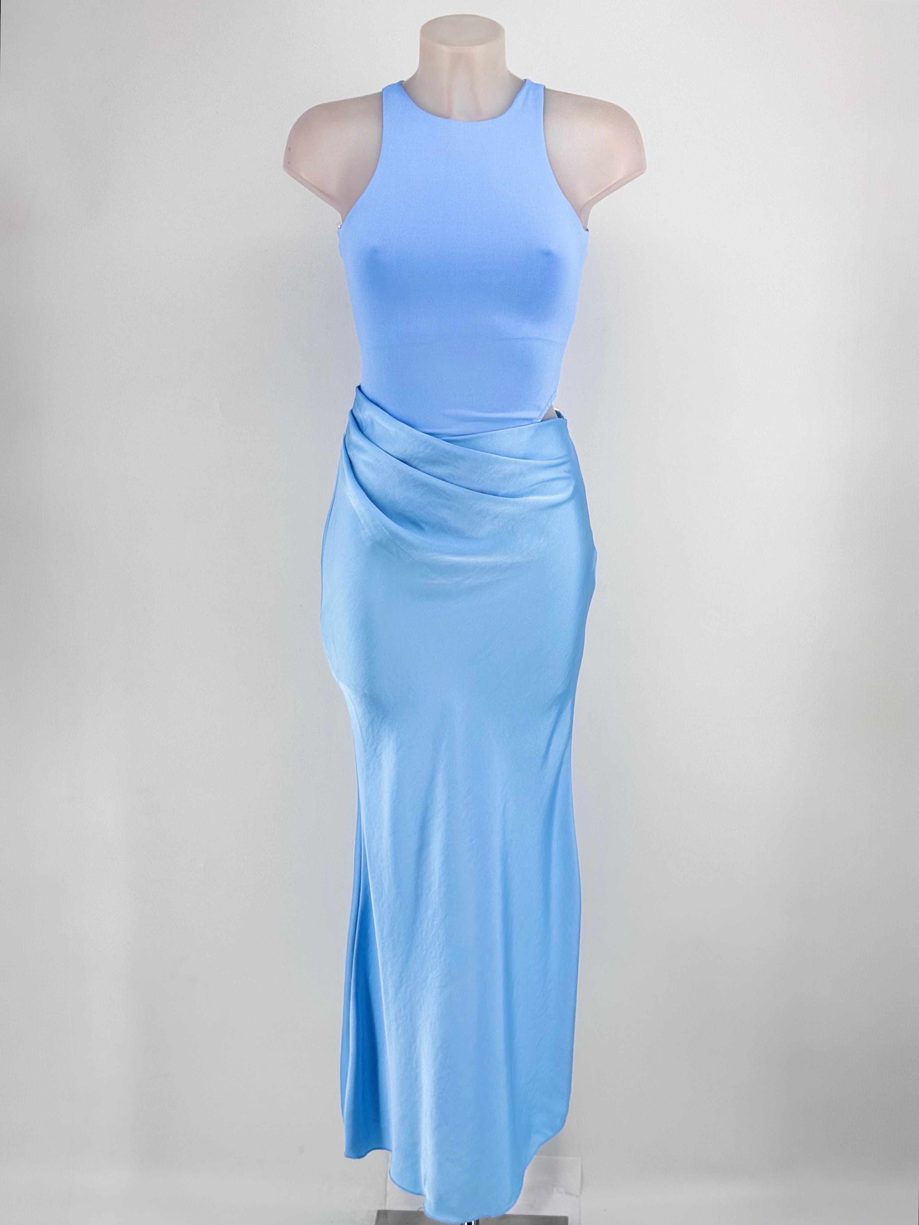 Vestido formado por parte superior de camiseta halter de elastham y falda satinada con drapeado