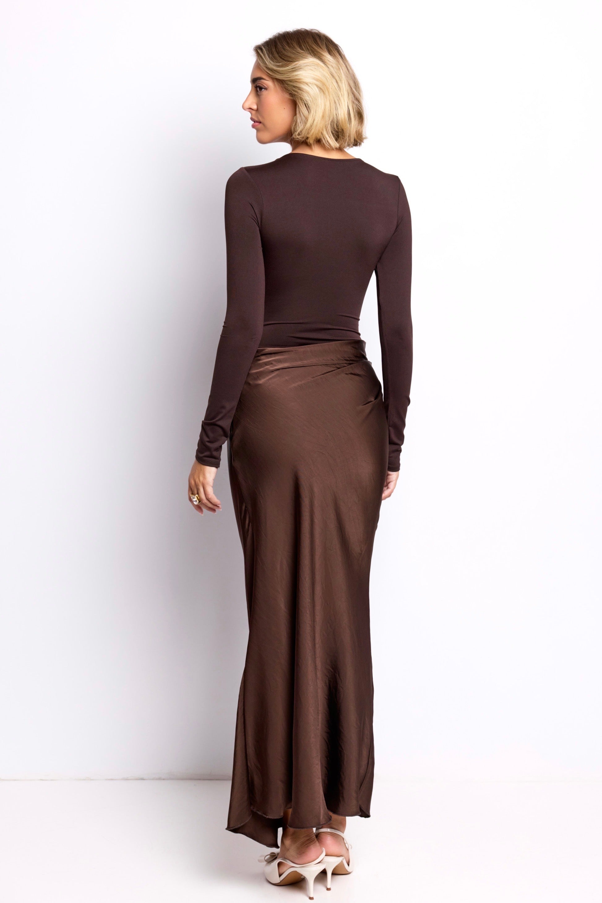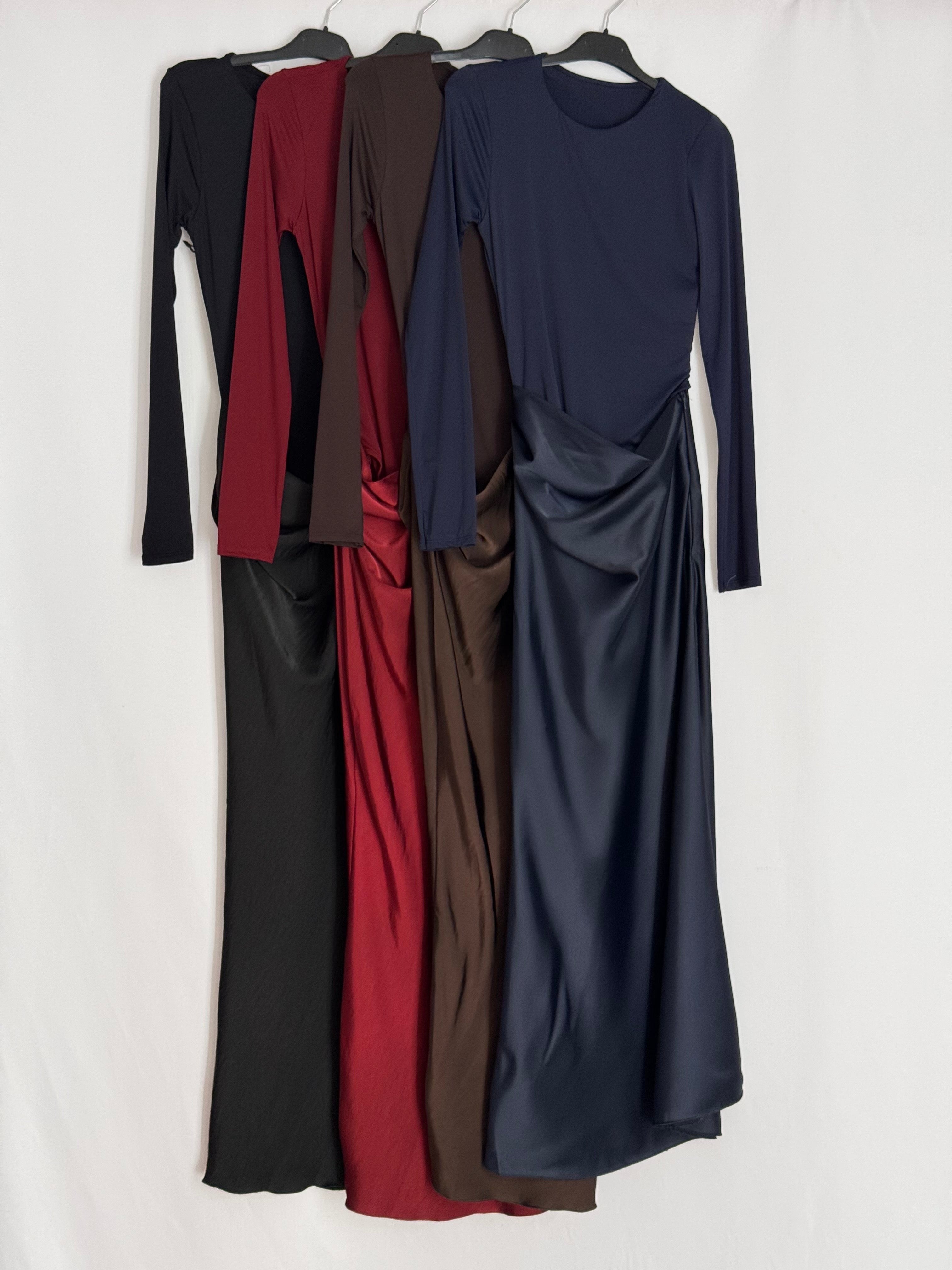Vestido formado por parte superior de camiseta halter de elastham y falda satinada con drapeado
